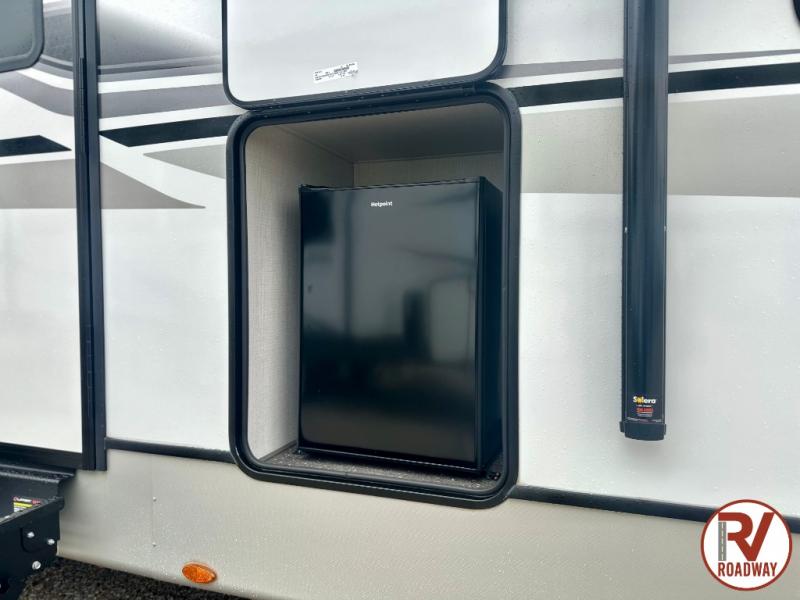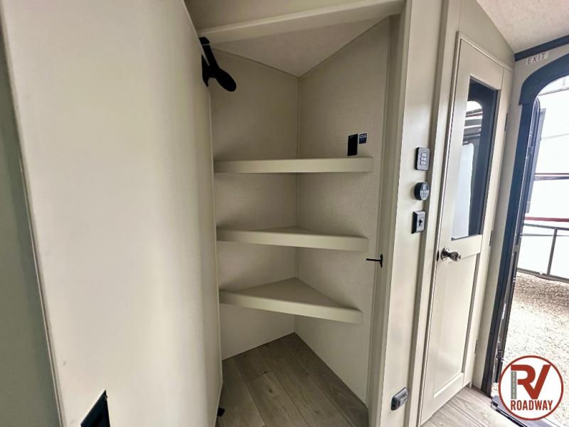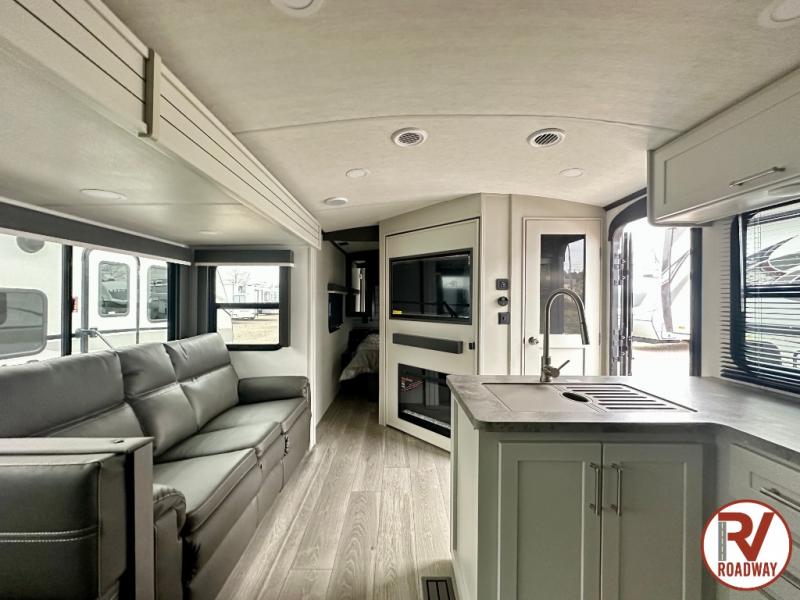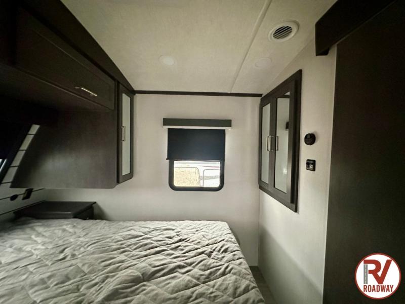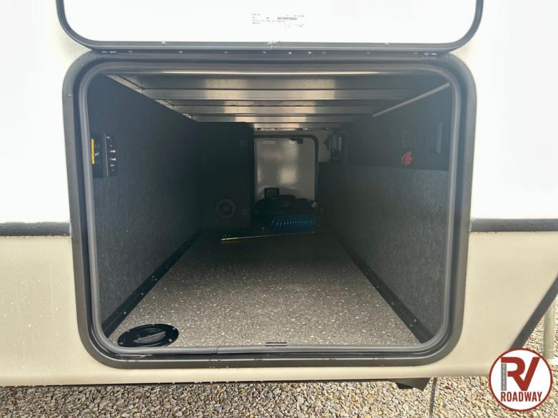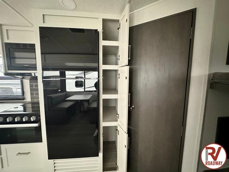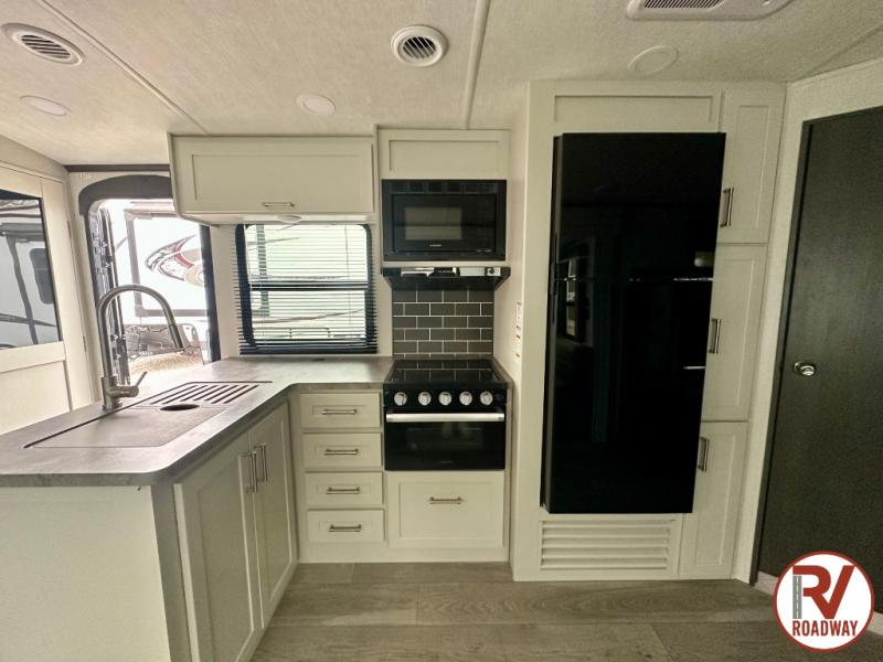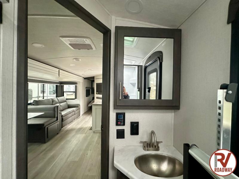 With dual entry doors in this travel trailer, you can enter in through the main living area or the full bath for convenience! Once inside, the sleeper sofa and booth dinette provide places to relax, eat, and play games, plus there is an entertainment center with hidden storage behind to keep movies organized. A full kitchen with a three burner cooktop and 12V refrigerator will allow you to cook and store food, or you can head outdoors to cook on the outdoor kitchen. There is also drop-frame storage outside for fishing poles and hiking gear, and the 21' electric awning provides shade as you relax. When it's time to call it a night, the king bed in the front private bedroom is sure to bring comfort, while the little ones take the double-size bunks, and any other guests can sleep on the living room furniture!