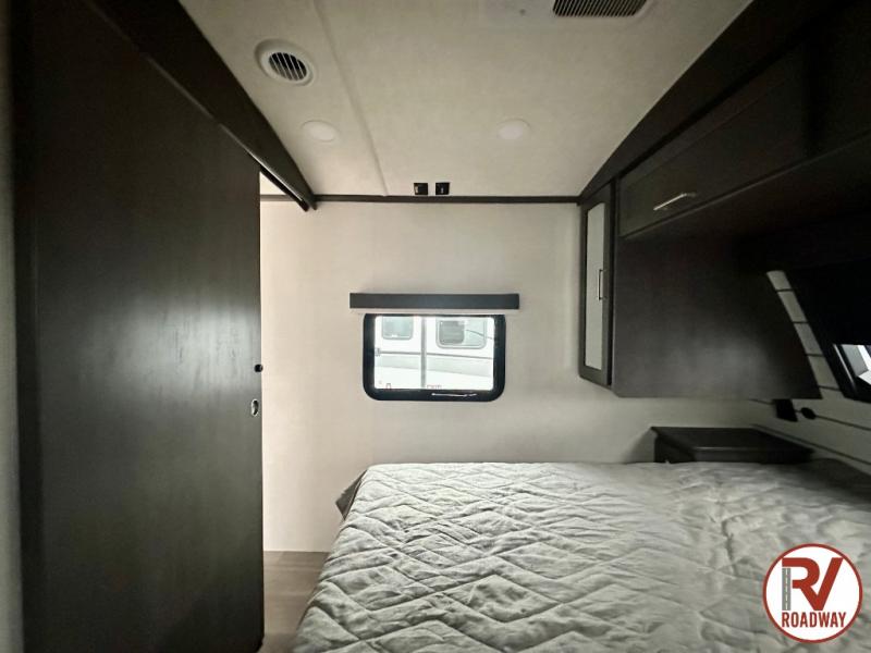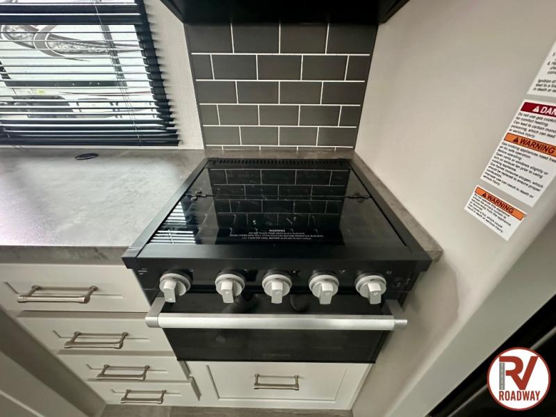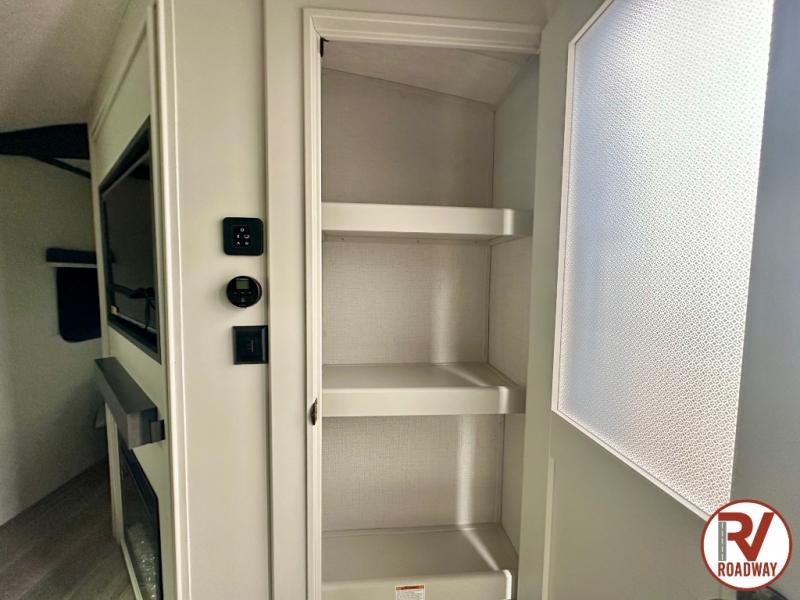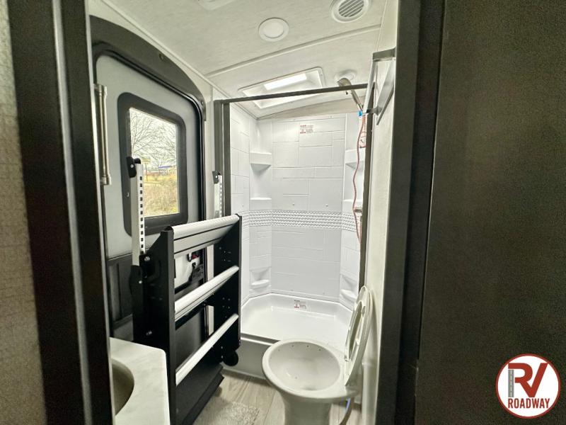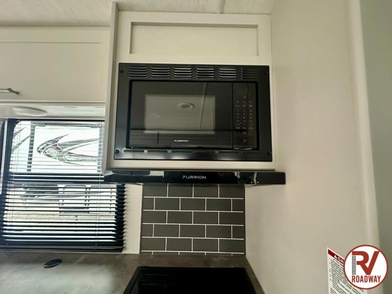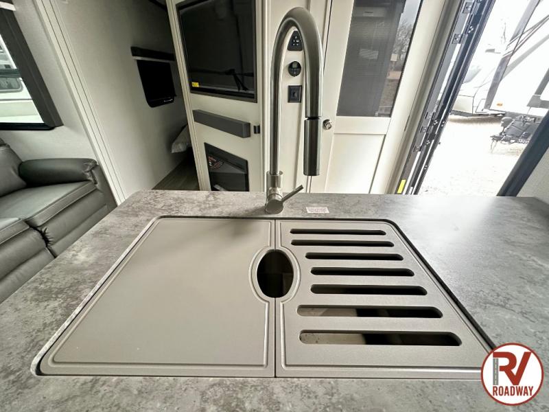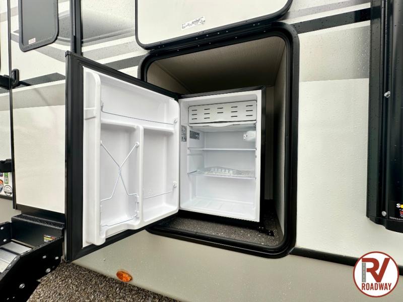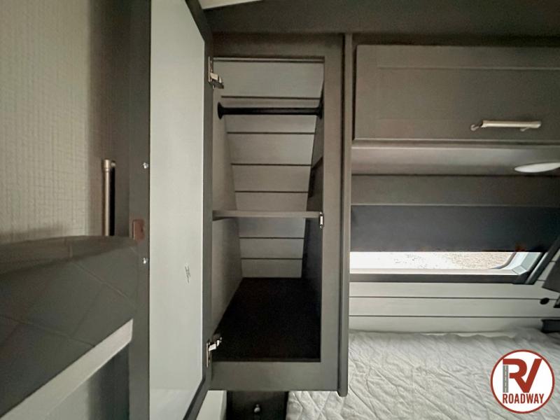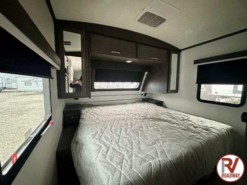 With dual entry doors in this travel trailer, you can enter in through the main living area or the full bath for convenience! Once inside, the sleeper sofa and booth dinette provide places to relax, eat, and play games, plus there is an entertainment center with hidden storage behind to keep movies organized. A full kitchen with a three burner cooktop and 12V refrigerator will allow you to cook and store food, or you can head outdoors to cook on the outdoor kitchen. There is also drop-frame storage outside for fishing poles and hiking gear, and the 21' electric awning provides shade as you relax. When it's time to call it a night, the king bed in the front private bedroom is sure to bring comfort, while the little ones take the double-size bunks, and any other guests can sleep on the living room furniture!