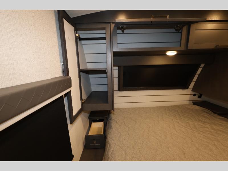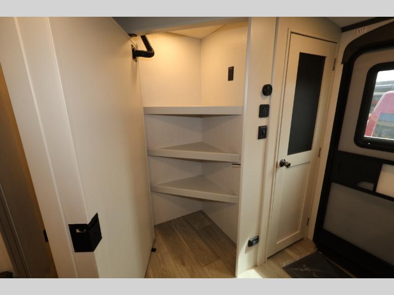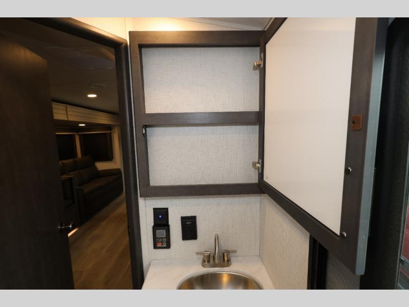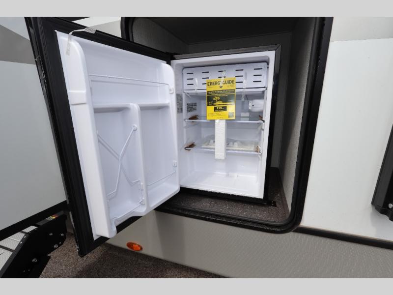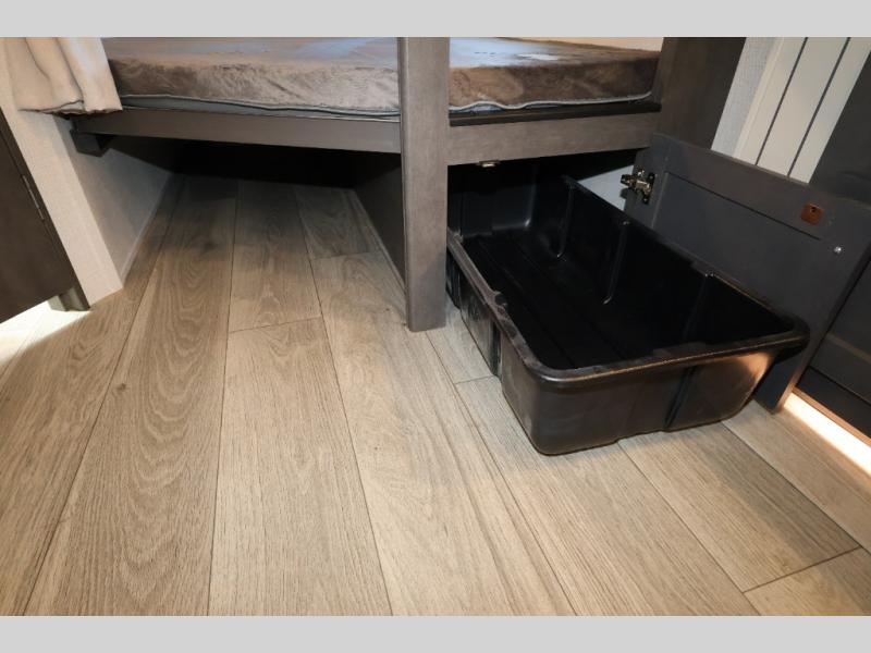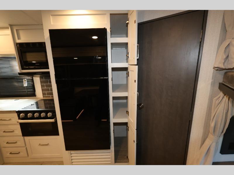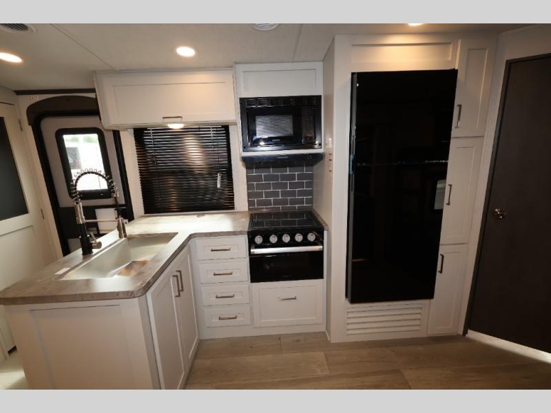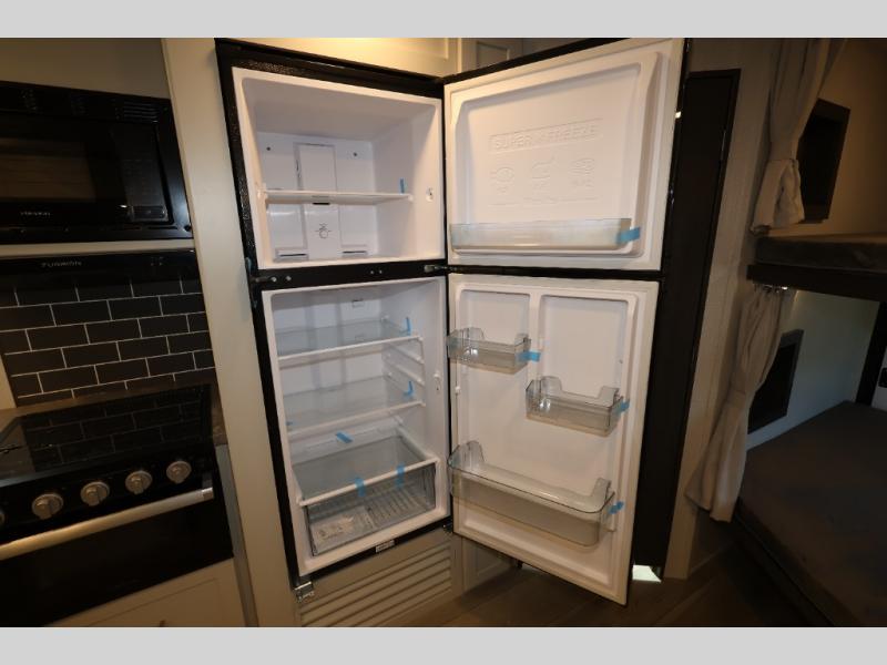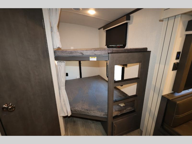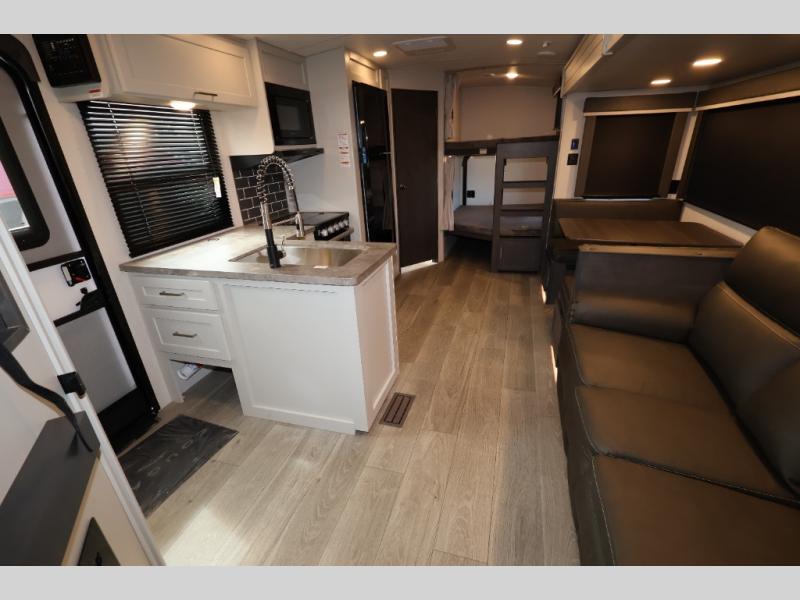 With dual entry doors in this travel trailer, you can enter in through the main living area or the full bath for convenience! Once inside, the sleeper sofa and booth dinette provide places to relax, eat, and play games, plus there is an entertainment center with hidden storage behind to keep movies organized. A full kitchen with a three burner cooktop and 12V refrigerator will allow you to cook and store food, or you can head outdoors to cook on the outdoor kitchen. There is also drop-frame storage outside for fishing poles and hiking gear, and the 21' electric awning provides shade as you relax. When it's time to call it a night, the king bed in the front private bedroom is sure to bring comfort, while the little ones take the double-size bunks, and any other guests can sleep on the living room furniture!