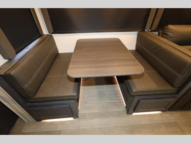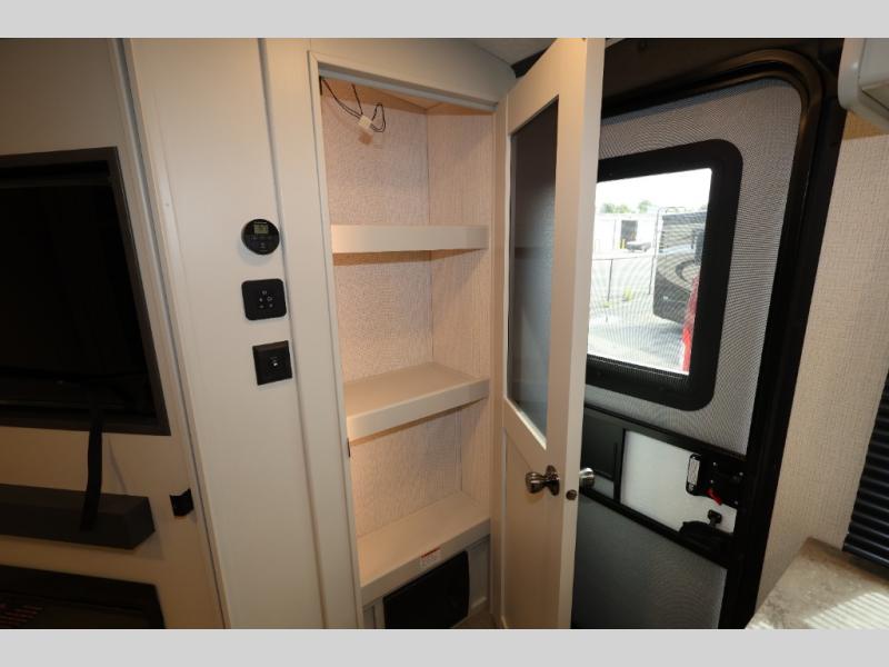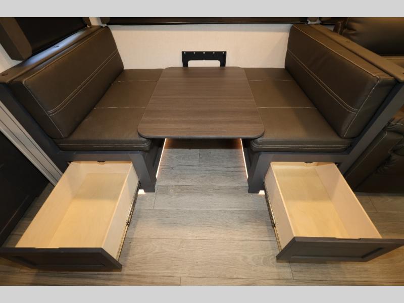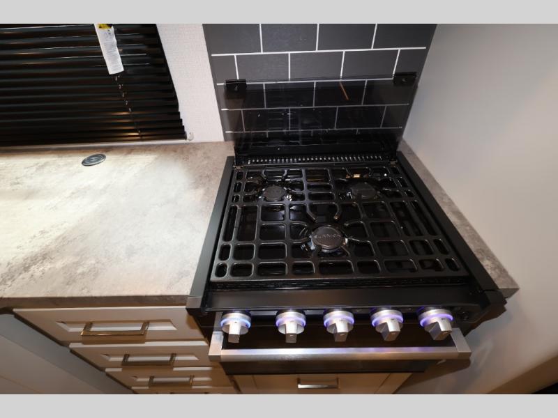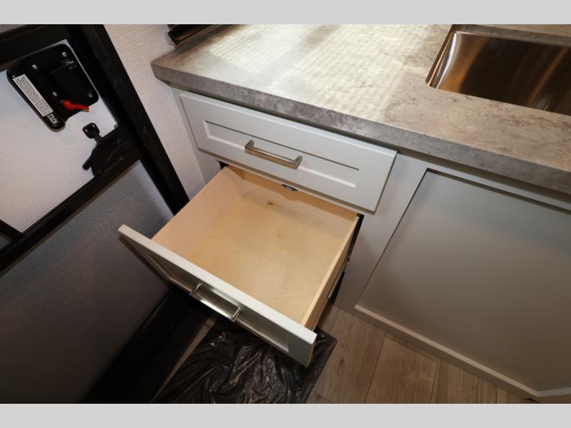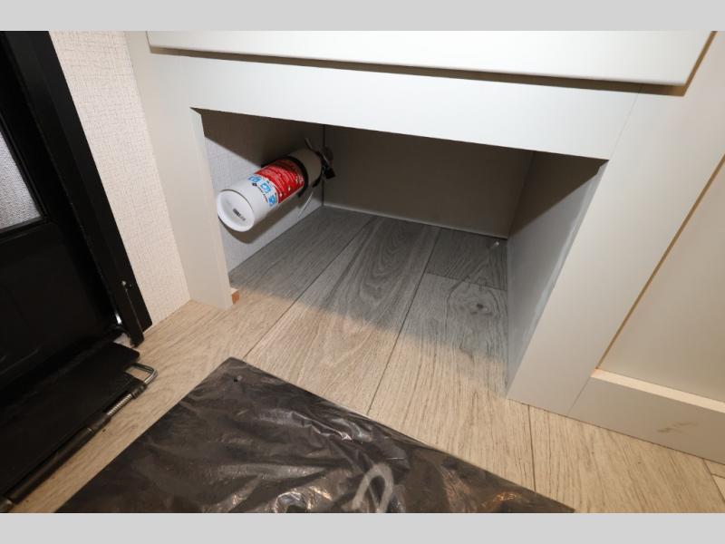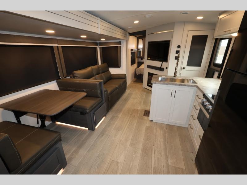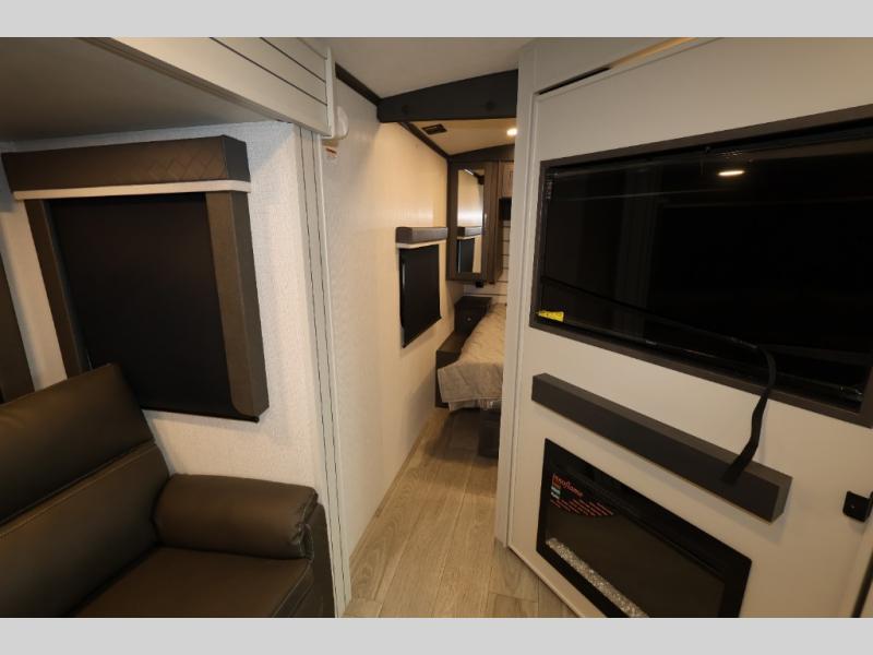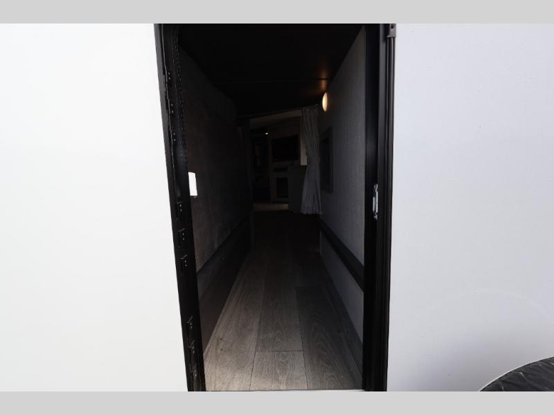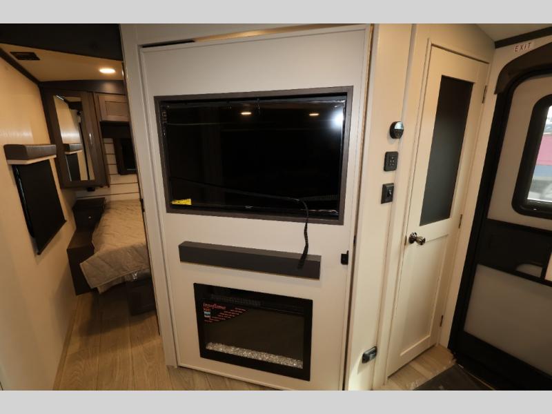 With dual entry doors in this travel trailer, you can enter in through the main living area or the full bath for convenience! Once inside, the sleeper sofa and booth dinette provide places to relax, eat, and play games, plus there is an entertainment center with hidden storage behind to keep movies organized. A full kitchen with a three burner cooktop and 12V refrigerator will allow you to cook and store food, or you can head outdoors to cook on the outdoor kitchen. There is also drop-frame storage outside for fishing poles and hiking gear, and the 21' electric awning provides shade as you relax. When it's time to call it a night, the king bed in the front private bedroom is sure to bring comfort, while the little ones take the double-size bunks, and any other guests can sleep on the living room furniture!