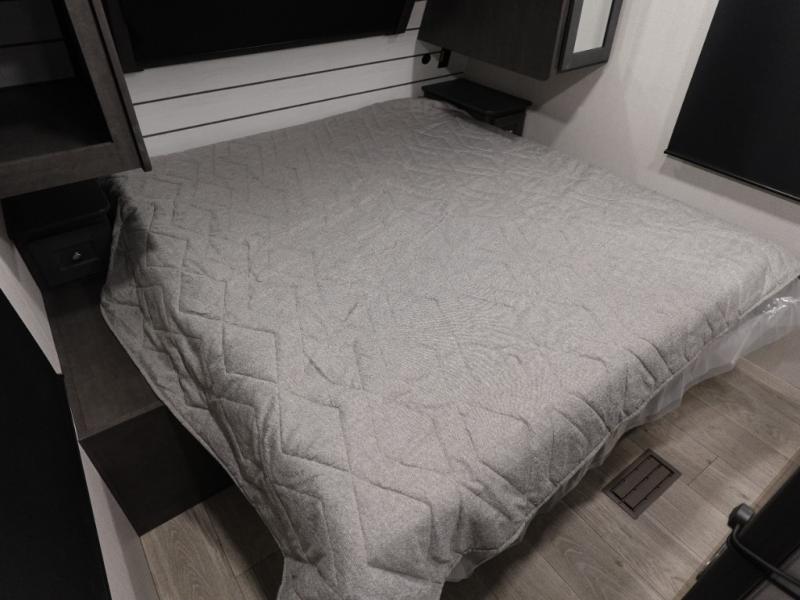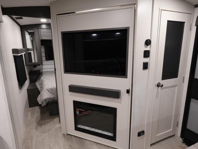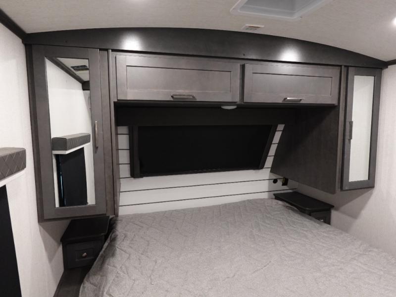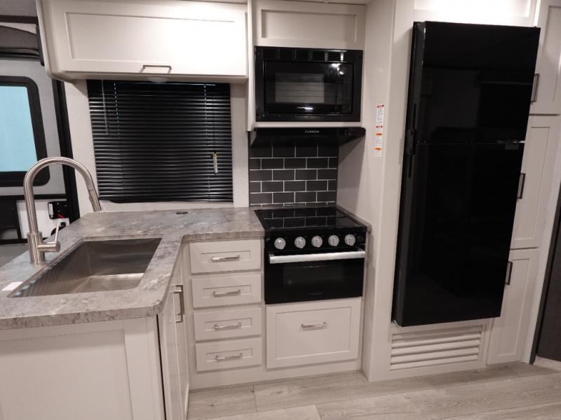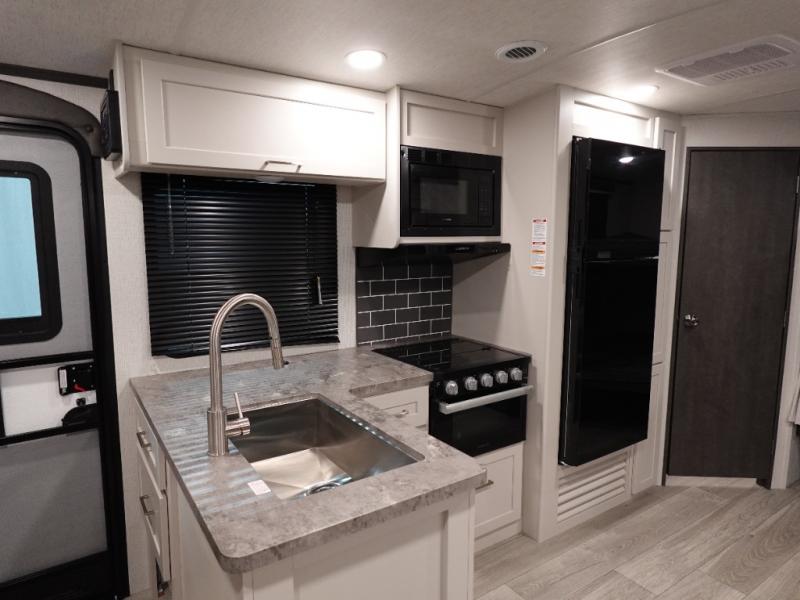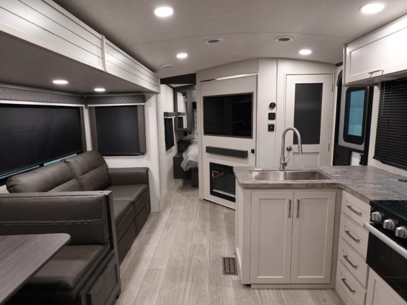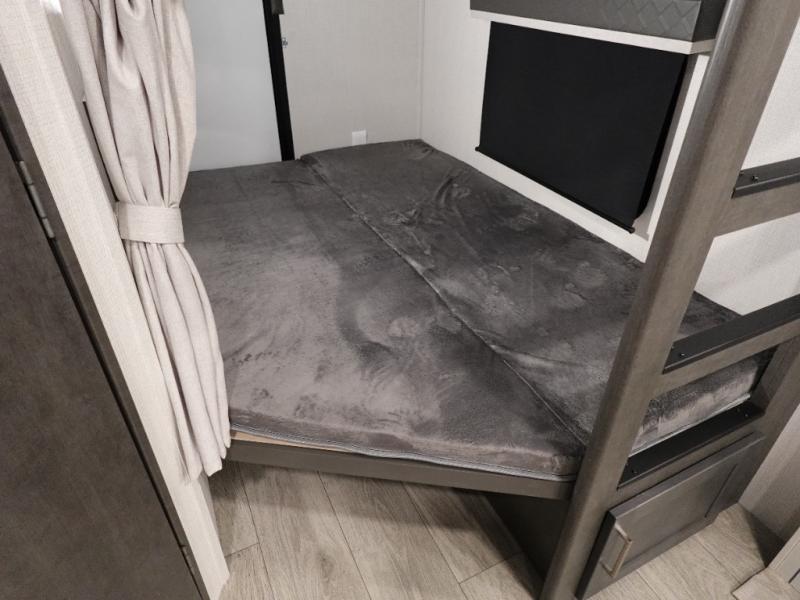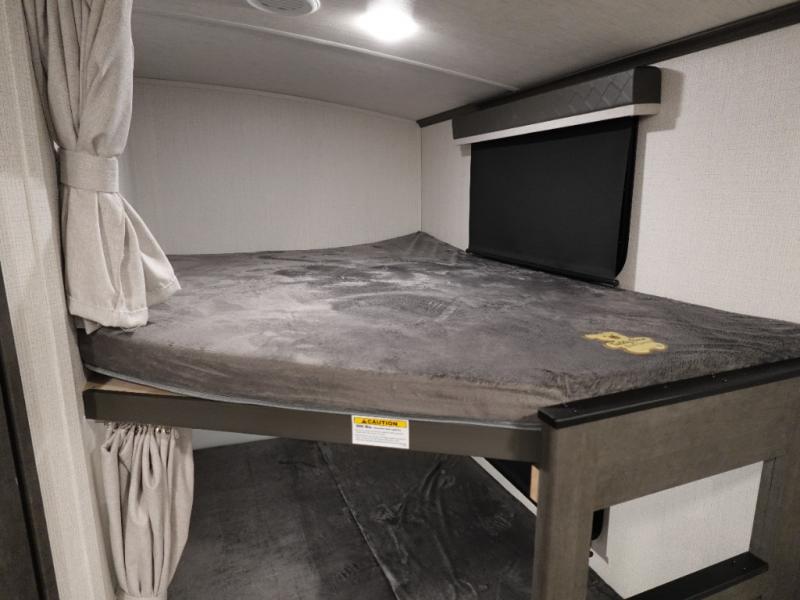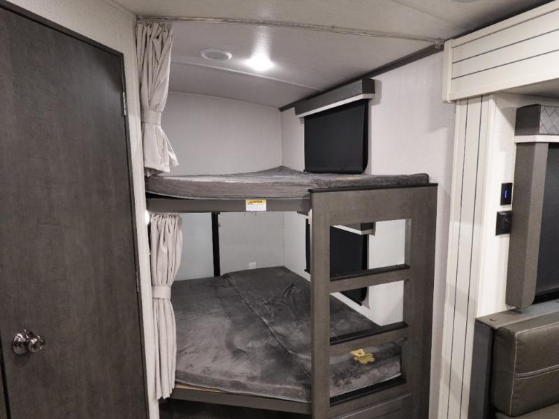 With dual entry doors in this travel trailer, you can enter in through the main living area or the full bath for convenience! Once inside, the sleeper sofa and booth dinette provide places to relax, eat, and play games, plus there is an entertainment center with hidden storage behind to keep movies organized. A full kitchen with a three burner cooktop and 12V refrigerator will allow you to cook and store food, or you can head outdoors to cook on the outdoor kitchen. There is also drop-frame storage outside for fishing poles and hiking gear, and the 21' electric awning provides shade as you relax. When it's time to call it a night, the king bed in the front private bedroom is sure to bring comfort, while the little ones take the double-size bunks, and any other guests can sleep on the living room furniture!