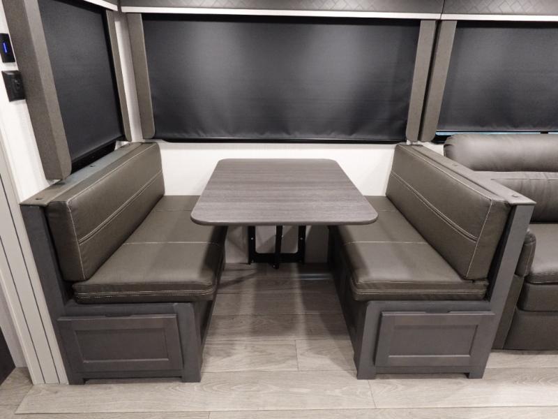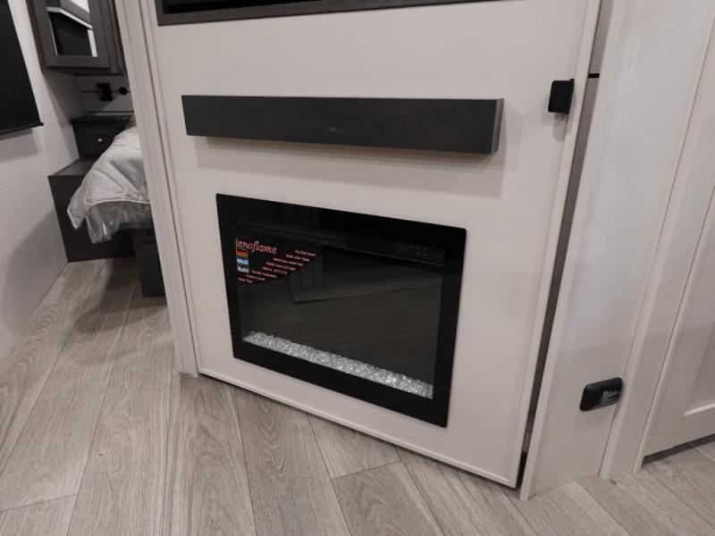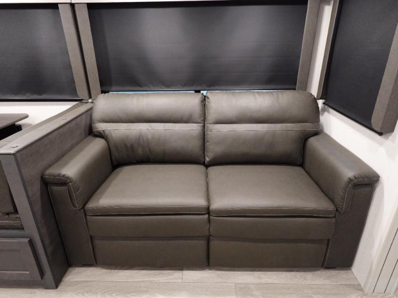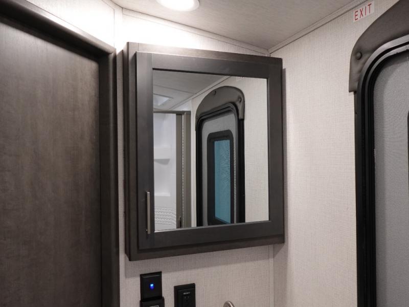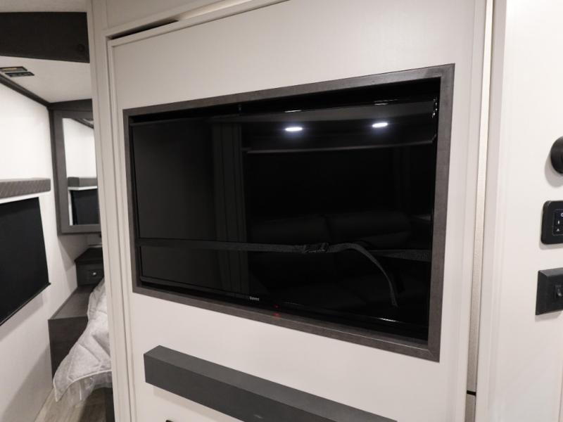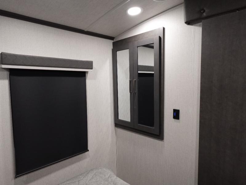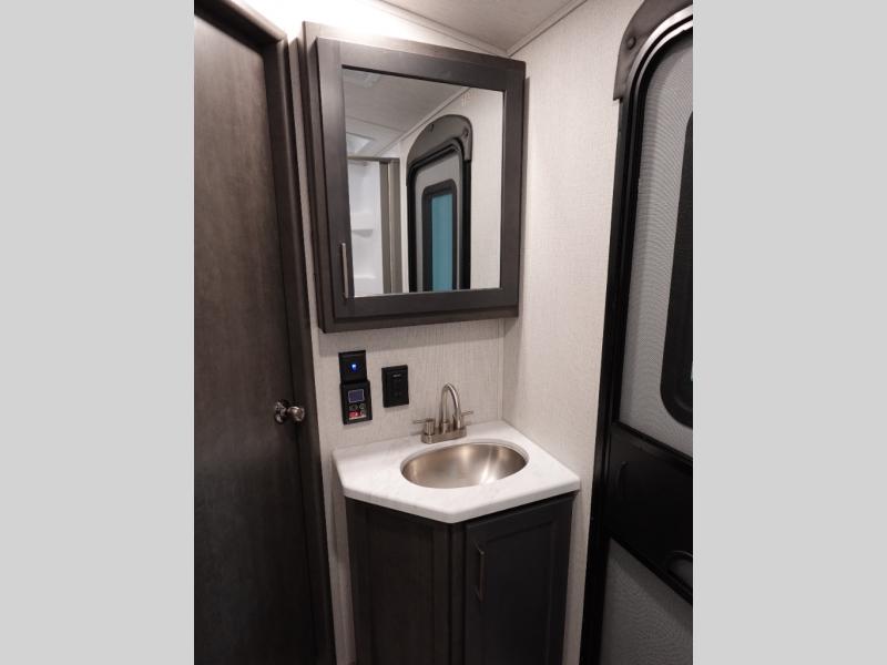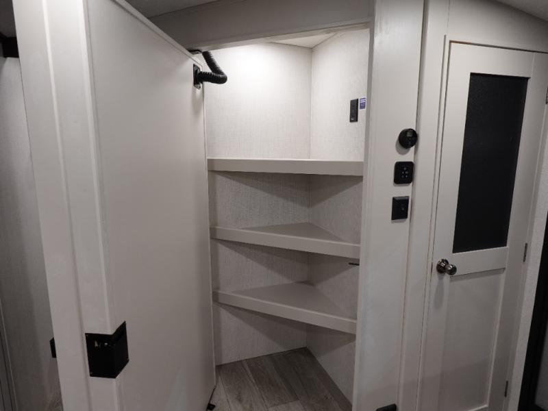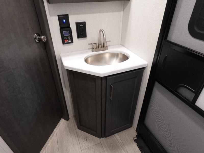 With dual entry doors in this travel trailer, you can enter in through the main living area or the full bath for convenience! Once inside, the sleeper sofa and booth dinette provide places to relax, eat, and play games, plus there is an entertainment center with hidden storage behind to keep movies organized. A full kitchen with a three burner cooktop and 12V refrigerator will allow you to cook and store food, or you can head outdoors to cook on the outdoor kitchen. There is also drop-frame storage outside for fishing poles and hiking gear, and the 21' electric awning provides shade as you relax. When it's time to call it a night, the king bed in the front private bedroom is sure to bring comfort, while the little ones take the double-size bunks, and any other guests can sleep on the living room furniture!