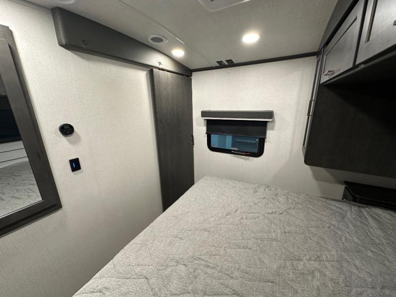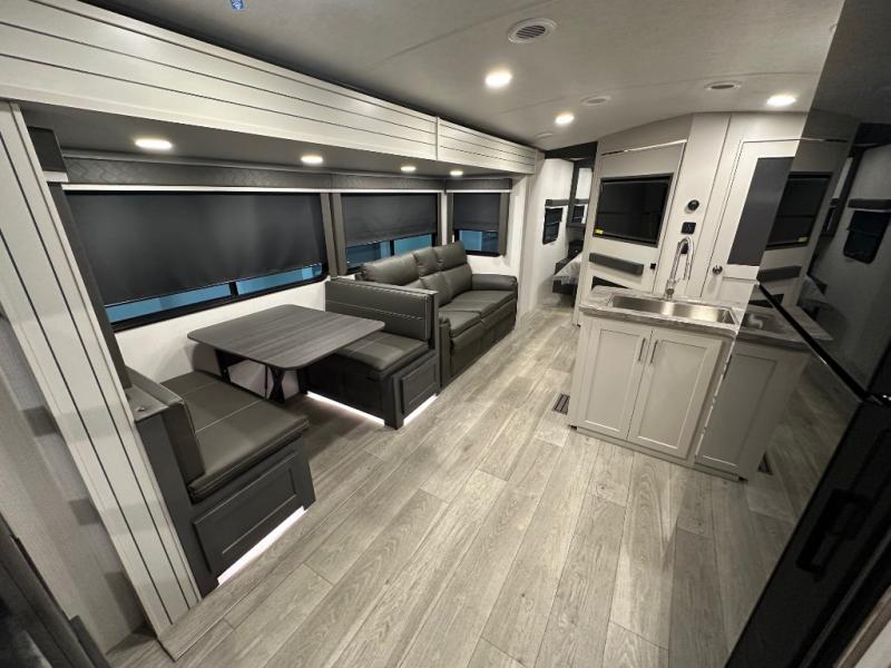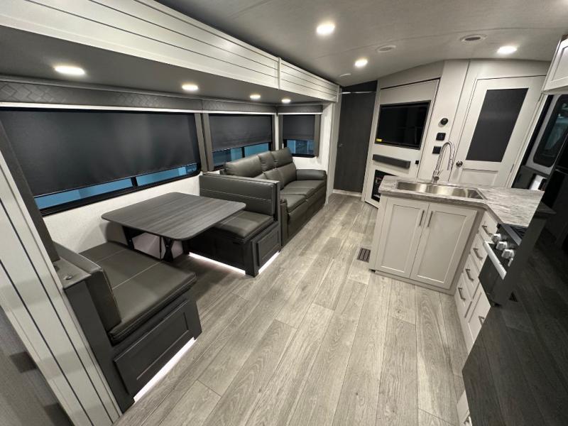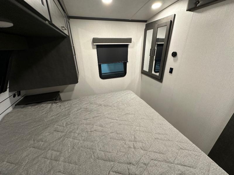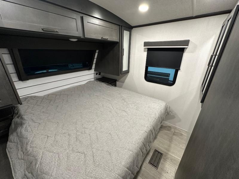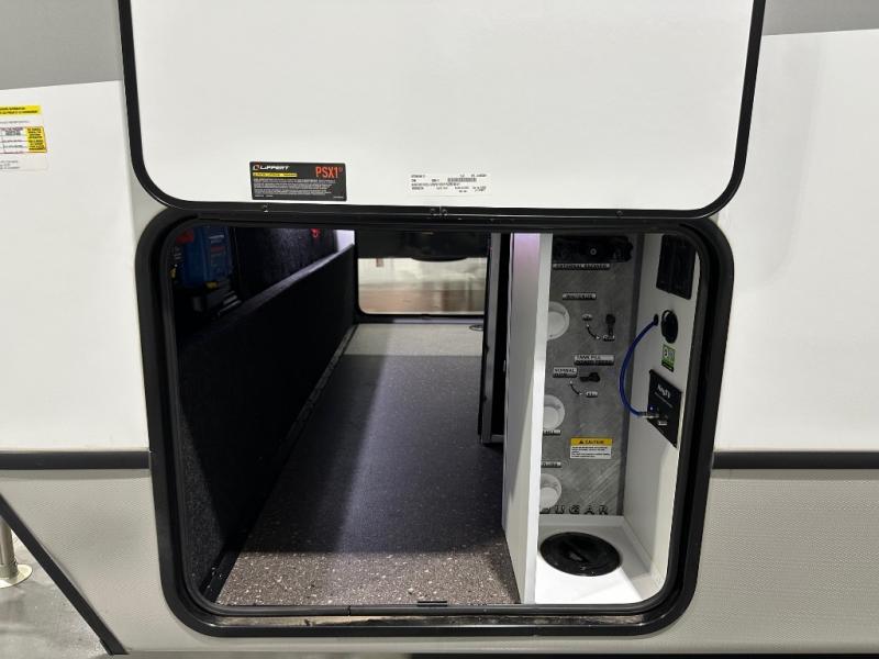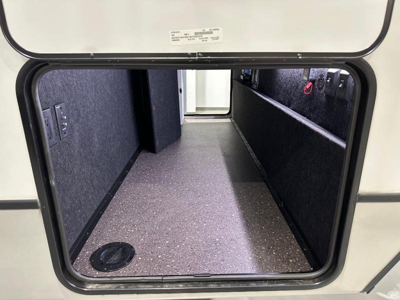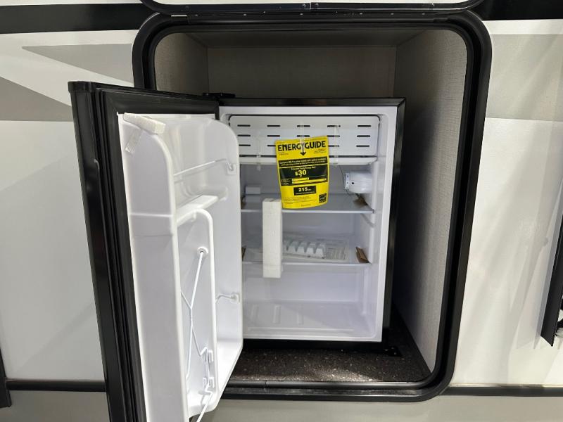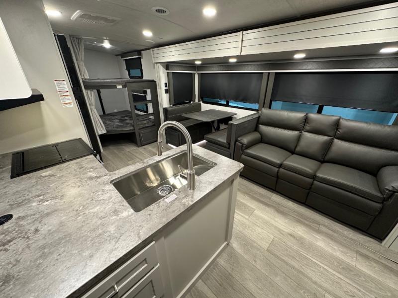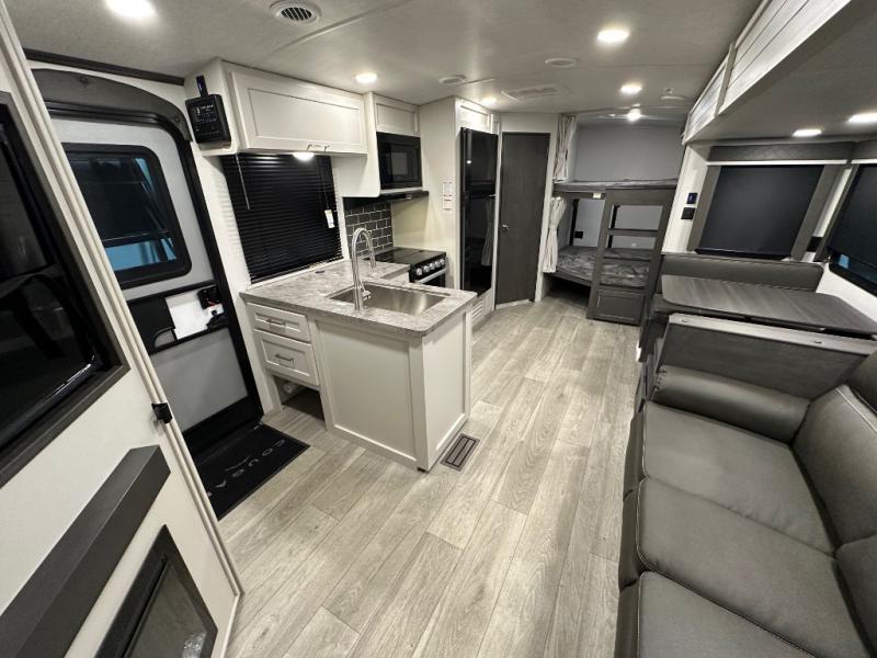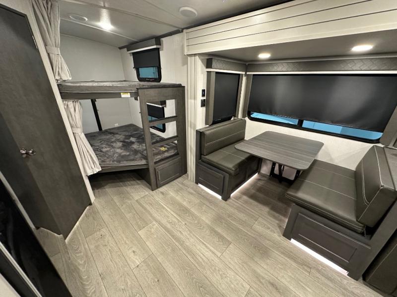 With dual entry doors in this travel trailer, you can enter in through the main living area or the full bath for convenience! Once inside, the sleeper sofa and booth dinette provide places to relax, eat, and play games, plus there is an entertainment center with hidden storage behind to keep movies organized. A full kitchen with a three burner cooktop and 12V refrigerator will allow you to cook and store food, or you can head outdoors to cook on the outdoor kitchen. There is also drop-frame storage outside for fishing poles and hiking gear, and the 21' electric awning provides shade as you relax. When it's time to call it a night, the king bed in the front private bedroom is sure to bring comfort, while the little ones take the double-size bunks, and any other guests can sleep on the living room furniture!