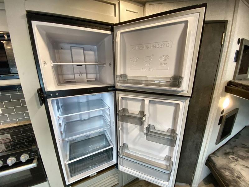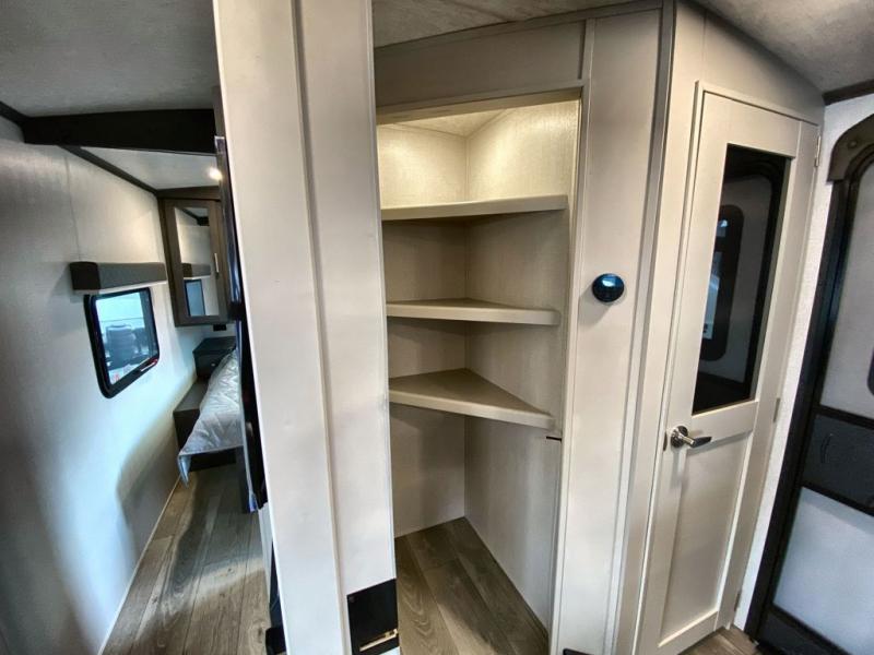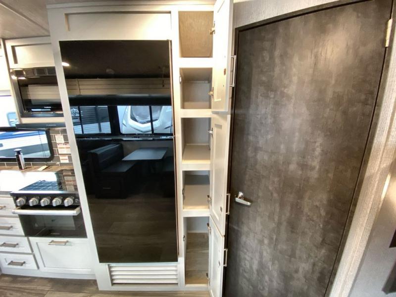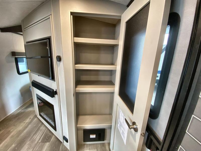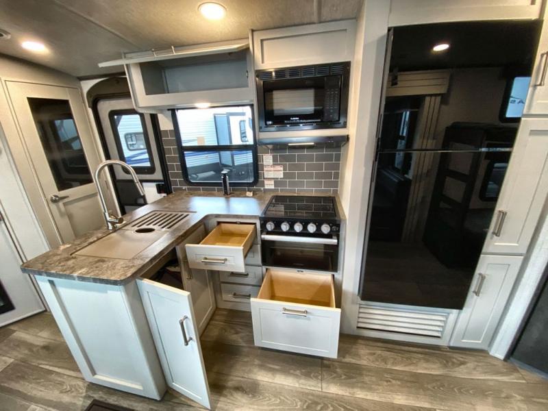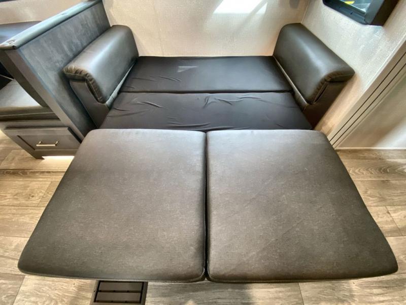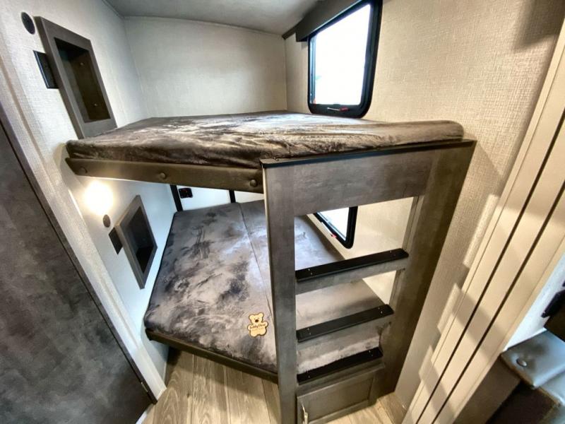 With dual entry doors in this travel trailer, you can enter in through the main living area or the full bath for convenience! Once inside, the sleeper sofa and booth dinette provide places to relax, eat, and play games, plus there is an entertainment center with hidden storage behind to keep movies organized. A full kitchen with a three burner cooktop and 12V refrigerator will allow you to cook and store food, or you can head outdoors to cook on the outdoor kitchen. There is also drop-frame storage outside for fishing poles and hiking gear, and the 21' electric awning provides shade as you relax. When it's time to call it a night, the king bed in the front private bedroom is sure to bring comfort, while the little ones take the double-size bunks, and any other guests can sleep on the living room furniture!