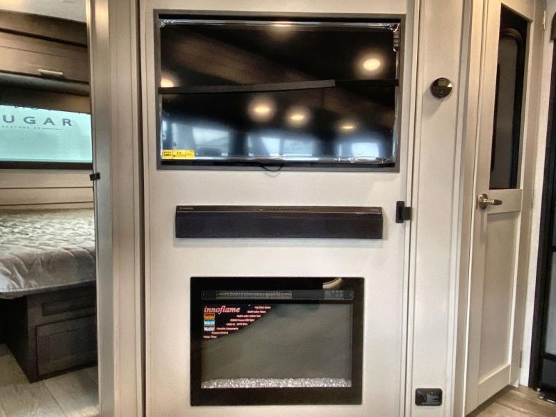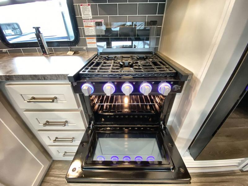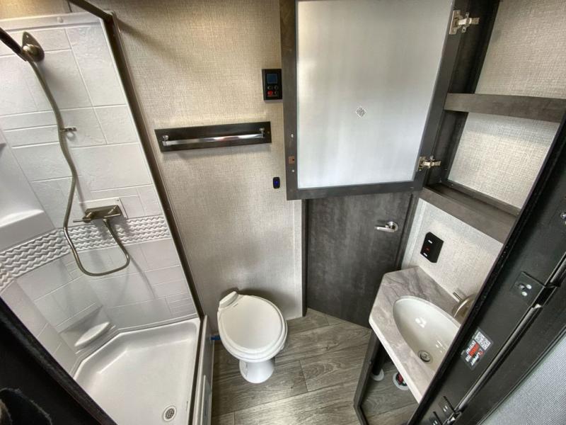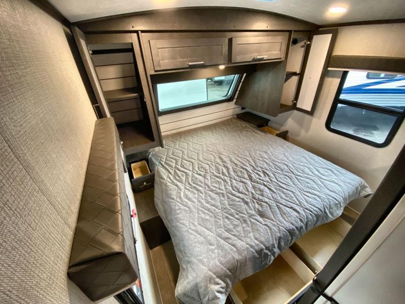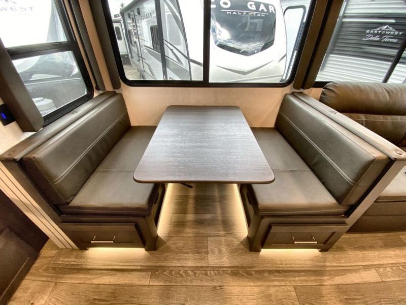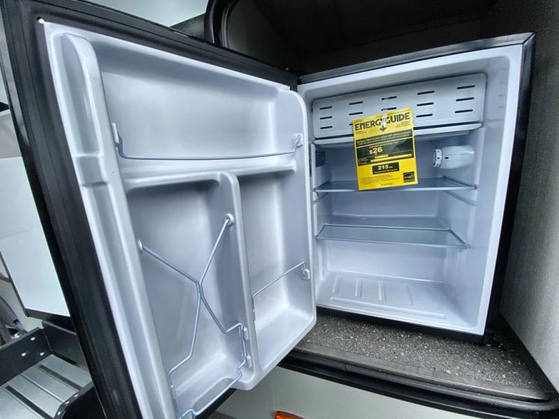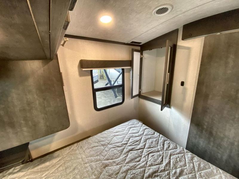 With dual entry doors in this travel trailer, you can enter in through the main living area or the full bath for convenience! Once inside, the sleeper sofa and booth dinette provide places to relax, eat, and play games, plus there is an entertainment center with hidden storage behind to keep movies organized. A full kitchen with a three burner cooktop and 12V refrigerator will allow you to cook and store food, or you can head outdoors to cook on the outdoor kitchen. There is also drop-frame storage outside for fishing poles and hiking gear, and the 21' electric awning provides shade as you relax. When it's time to call it a night, the king bed in the front private bedroom is sure to bring comfort, while the little ones take the double-size bunks, and any other guests can sleep on the living room furniture!
