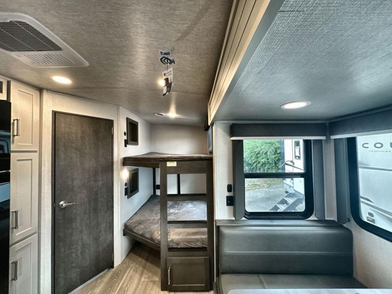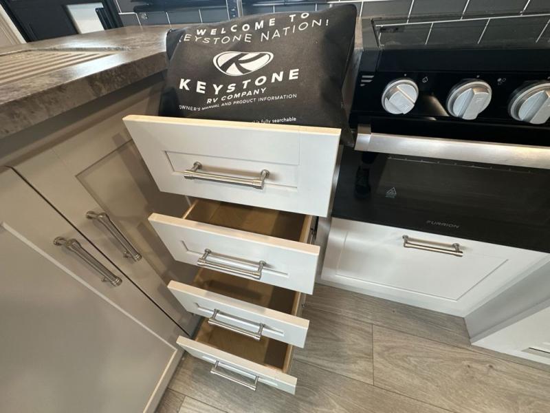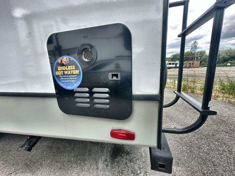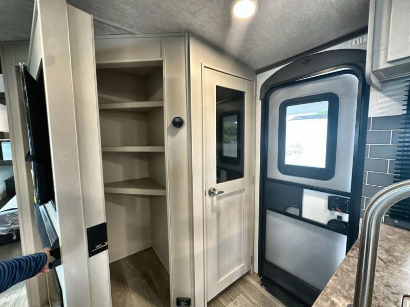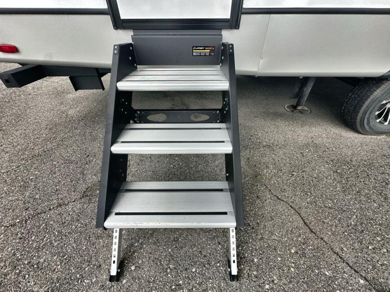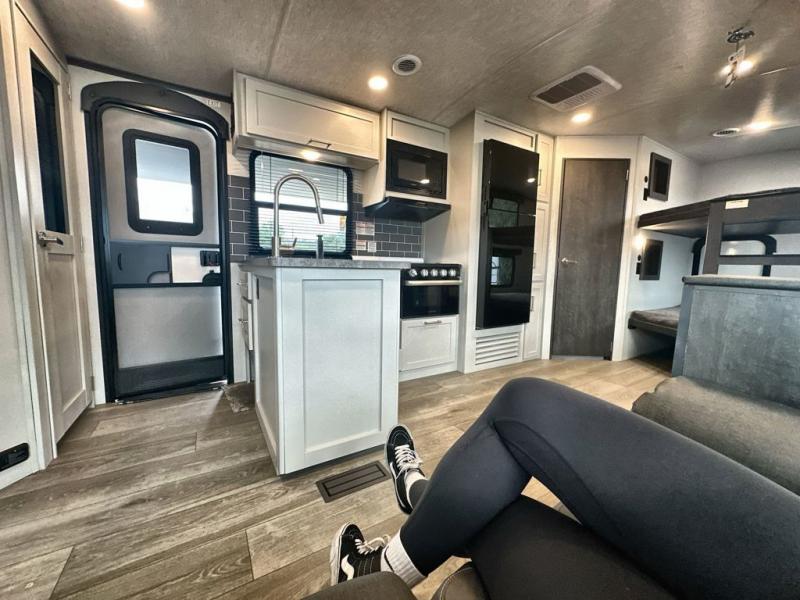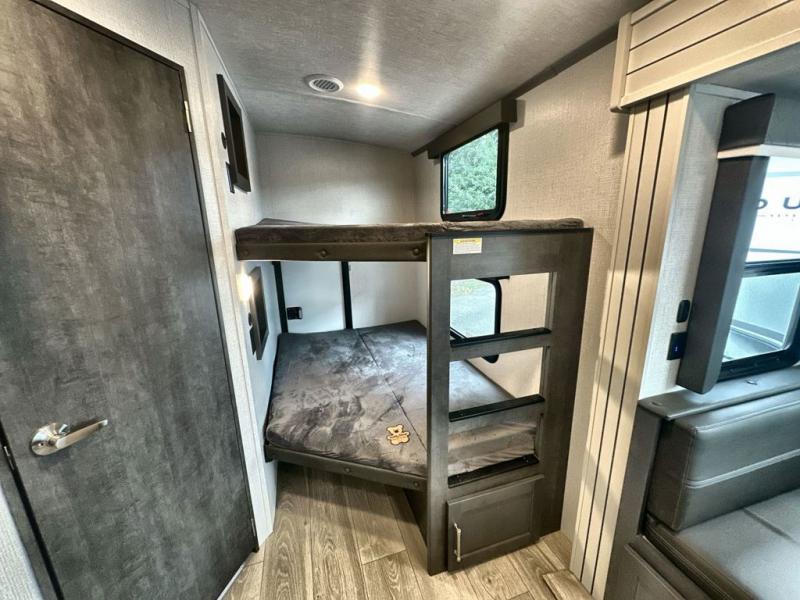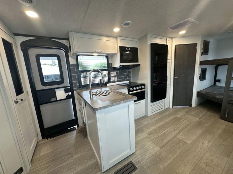 With dual entry doors in this travel trailer, you can enter in through the main living area or the full bath for convenience! Once inside, the sleeper sofa and booth dinette provide places to relax, eat, and play games, plus there is an entertainment center with hidden storage behind to keep movies organized. A full kitchen with a three burner cooktop and 12V refrigerator will allow you to cook and store food, or you can head outdoors to cook on the outdoor kitchen. There is also drop-frame storage outside for fishing poles and hiking gear, and the 21' electric awning provides shade as you relax. When it's time to call it a night, the king bed in the front private bedroom is sure to bring comfort, while the little ones take the double-size bunks, and any other guests can sleep on the living room furniture!