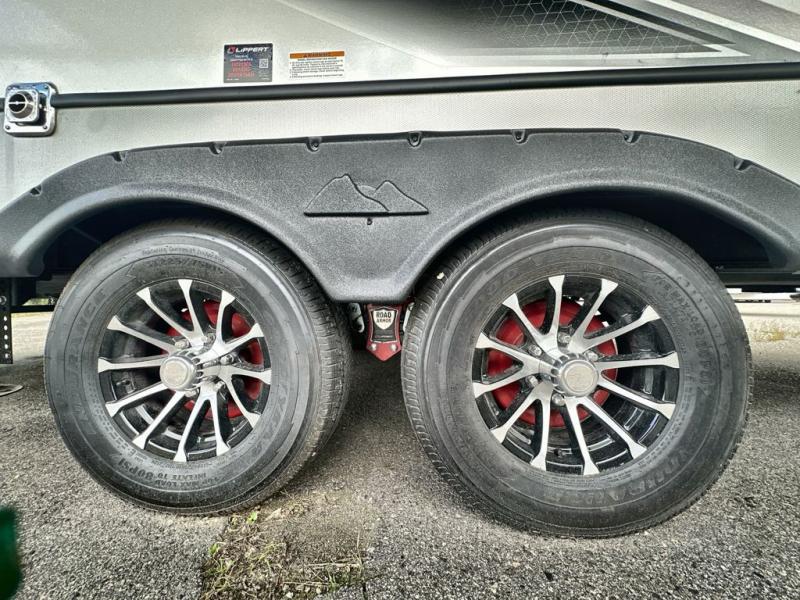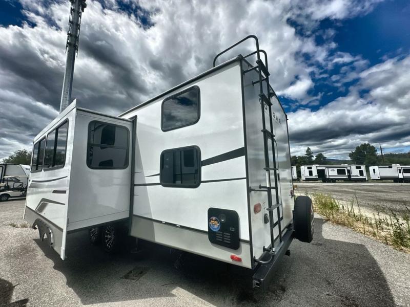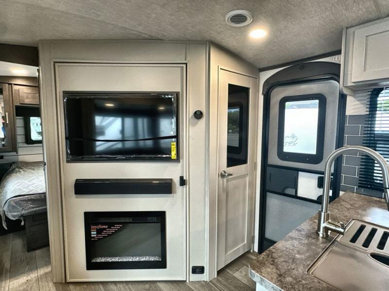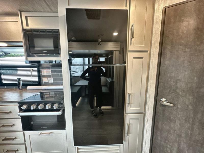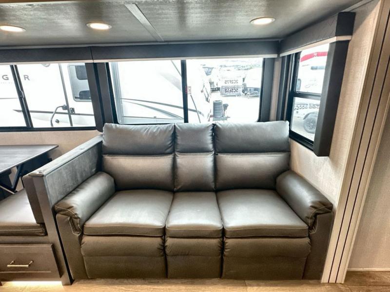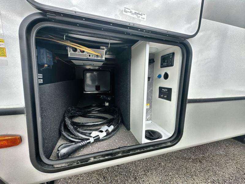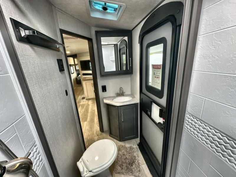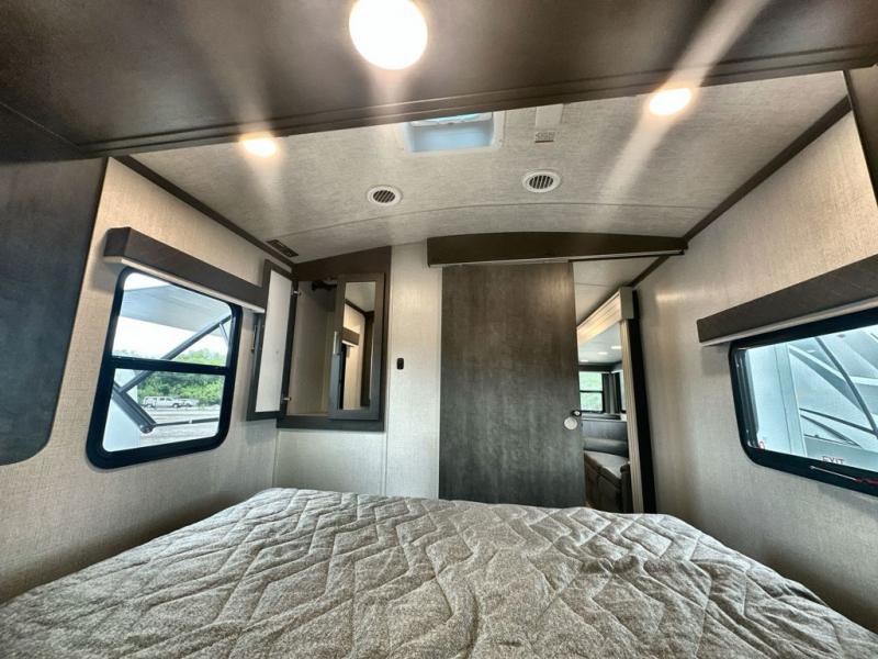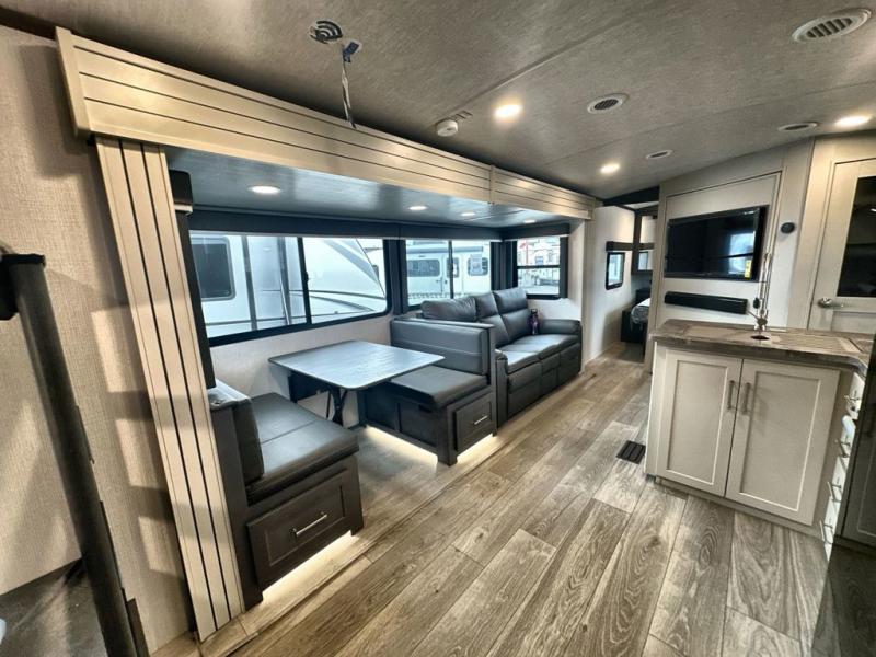 With dual entry doors in this travel trailer, you can enter in through the main living area or the full bath for convenience! Once inside, the sleeper sofa and booth dinette provide places to relax, eat, and play games, plus there is an entertainment center with hidden storage behind to keep movies organized. A full kitchen with a three burner cooktop and 12V refrigerator will allow you to cook and store food, or you can head outdoors to cook on the outdoor kitchen. There is also drop-frame storage outside for fishing poles and hiking gear, and the 21' electric awning provides shade as you relax. When it's time to call it a night, the king bed in the front private bedroom is sure to bring comfort, while the little ones take the double-size bunks, and any other guests can sleep on the living room furniture!