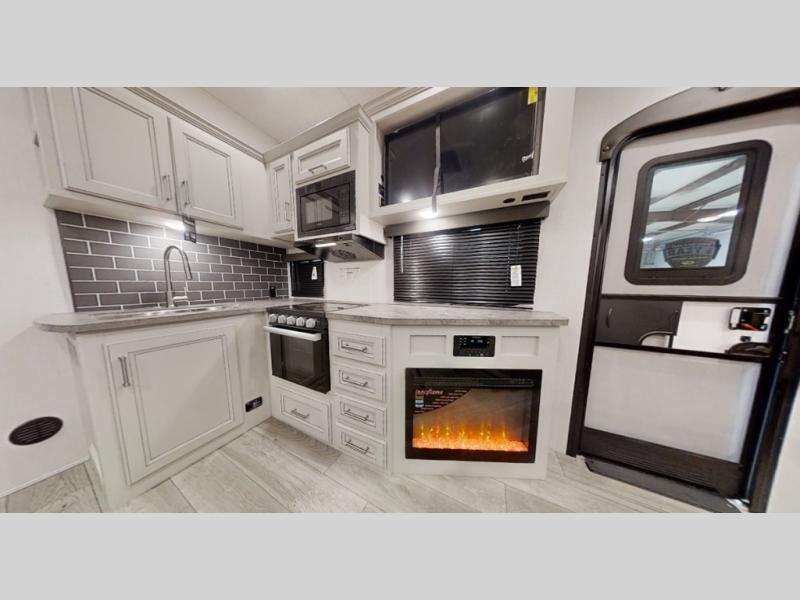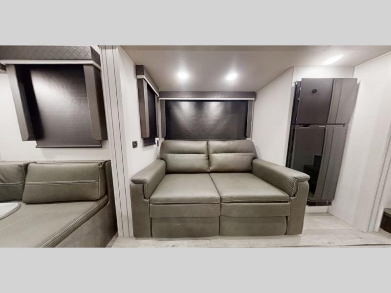 If you're needing additional sleeping space or a place to work on the road, take a look at this fifth wheel! The bunkhouse includes three bunks, and the lower bunk can swing up so you can work at the desk. There is also an exterior cargo door here so you can pack luggage right into the bunkhouse. You will have your own private bedroom up front with a walk-around queen bed, a wardrobe slide, plus dual wardrobes and nightstands. The main living area will be a favorite hangout spot with its tri-fold sofa, L-shaped sofa with a table dinette and an ottoman, plus an LED HDTV. You can even add the optional fireplace for a more at-home feel. This model also includes a 20' power awning, LCI solid steps, and an exterior mini refrigerator and Capital griddle for breakfast outdoors!