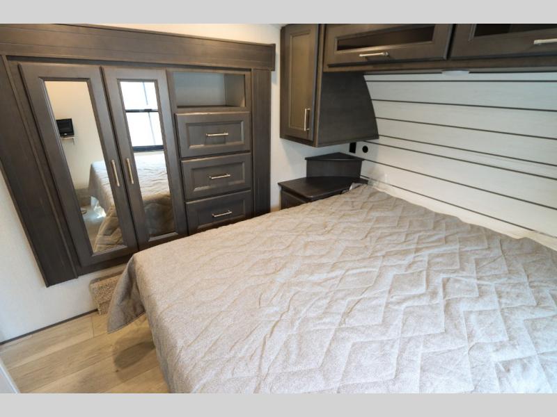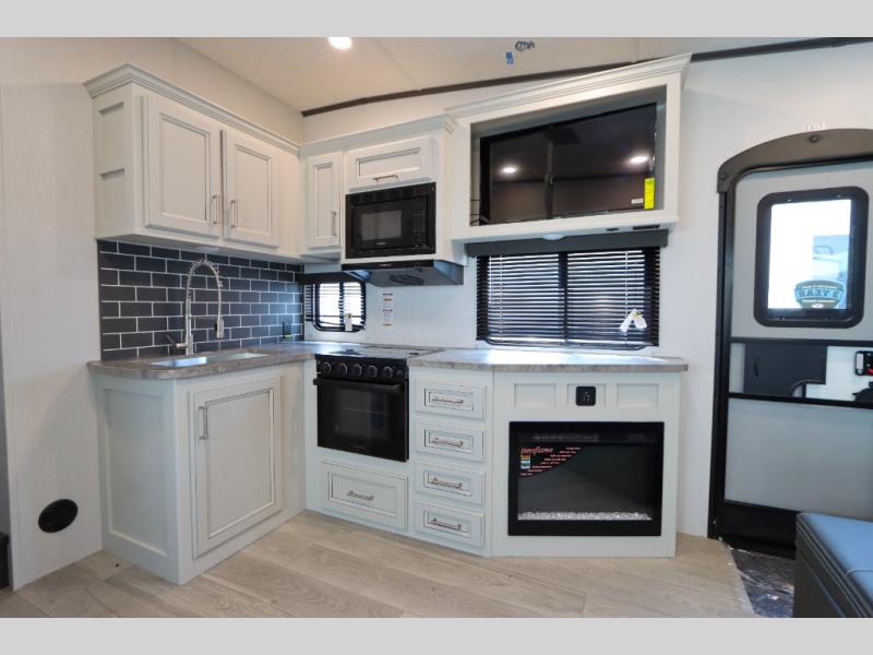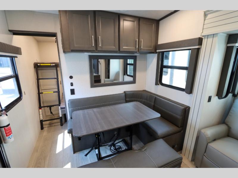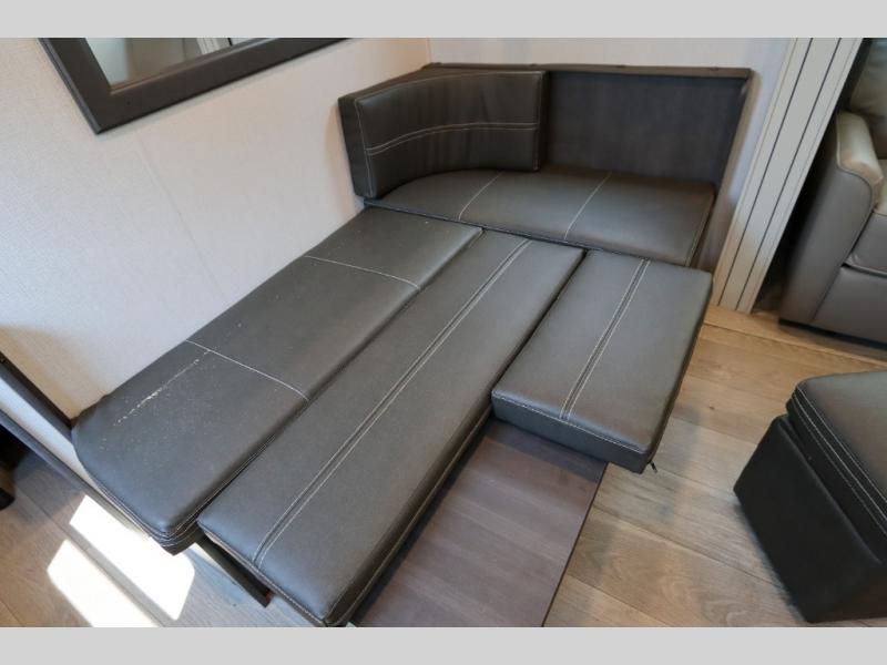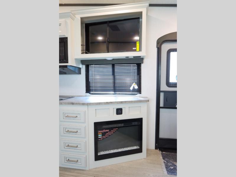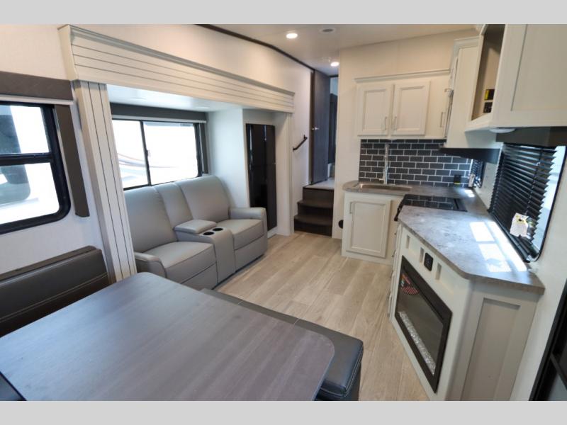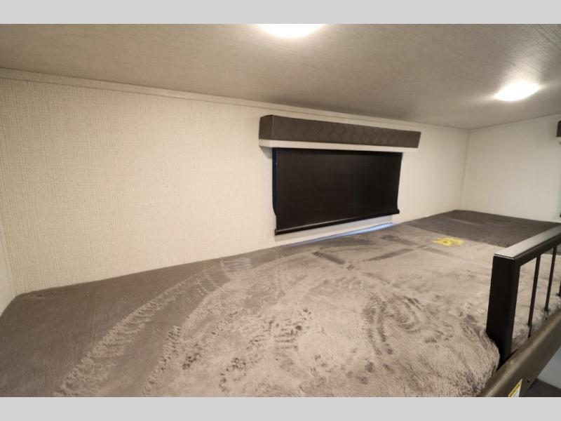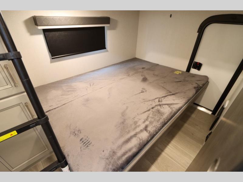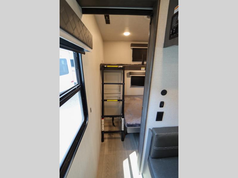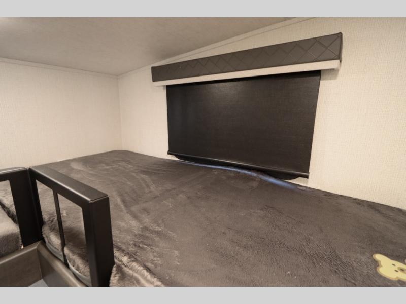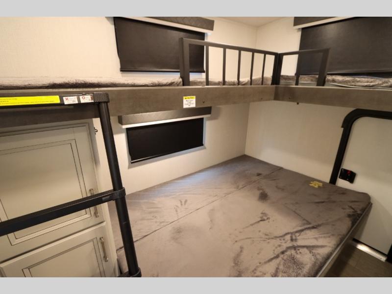 If you're needing additional sleeping space or a place to work on the road, take a look at this fifth wheel! The bunkhouse includes three bunks, and the lower bunk can swing up so you can work at the desk. There is also an exterior cargo door here so you can pack luggage right into the bunkhouse. You will have your own private bedroom up front with a walk-around queen bed, a wardrobe slide, plus dual wardrobes and nightstands. The main living area will be a favorite hangout spot with its tri-fold sofa, L-shaped sofa with a table dinette and an ottoman, plus an LED HDTV. You can even add the optional fireplace for a more at-home feel. This model also includes a 20' power awning, LCI solid steps, and an exterior mini refrigerator and Capital griddle for breakfast outdoors!