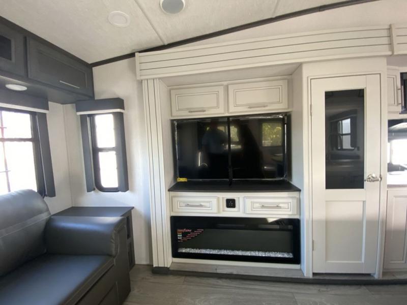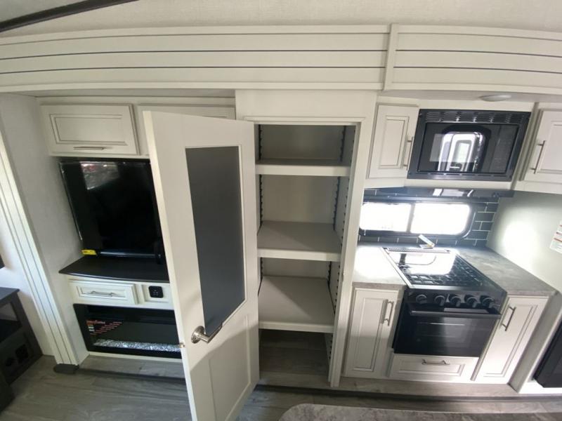 You will have the time of your life in this Cougar Half-Ton fifth wheel! There is so much comfort with the theater seating and 68" tri-fold sleeper sofa with end tables in the living area, and the comfort is taken up a notch with the addition of the fireplace below the entertainment center. You also have lots of space in this area because of the opposing slides, so you can work freely around the kitchen island preparing dinner or washing dishes. The booth dinette is right next to the kitchen, so you won't have to go far to set the table. If you don't need the dinette to serve as a bed, then you might be interested in switching it out for the optional free-standing table with chairs. The pantry is big enough to keep your favorite foods stored away, and the 10.4 cu.ft. refrigerator can hold the items that need to be kept chilled.