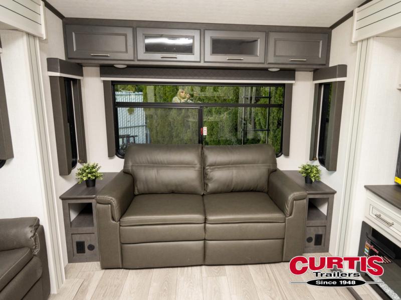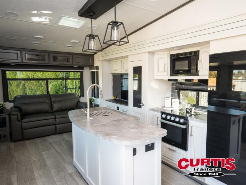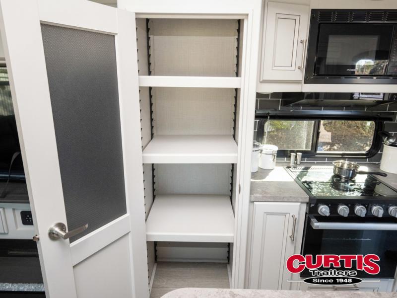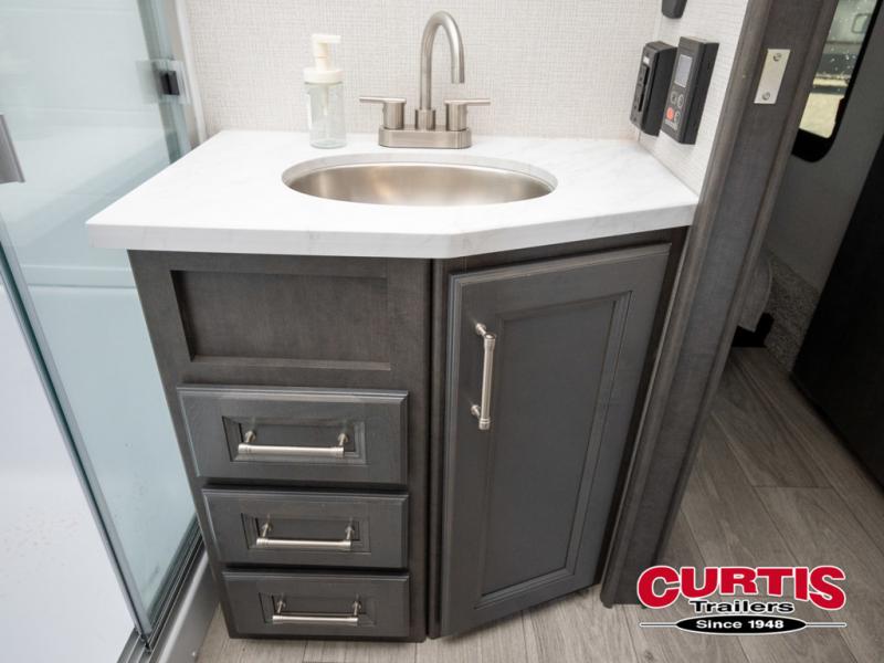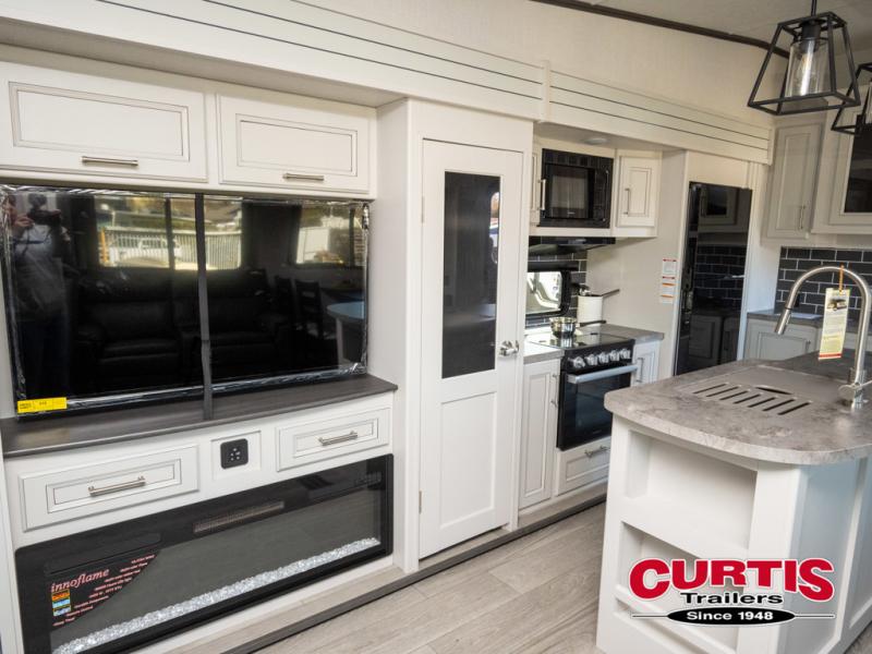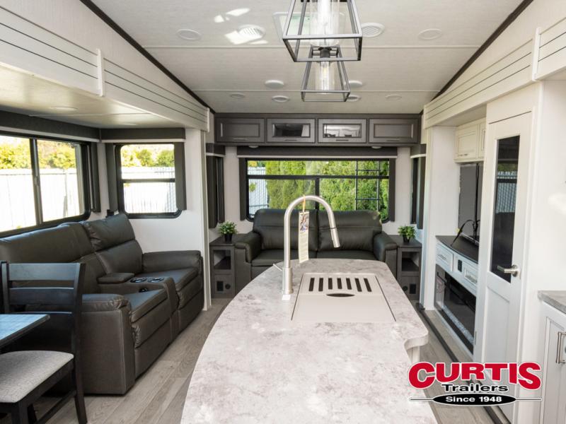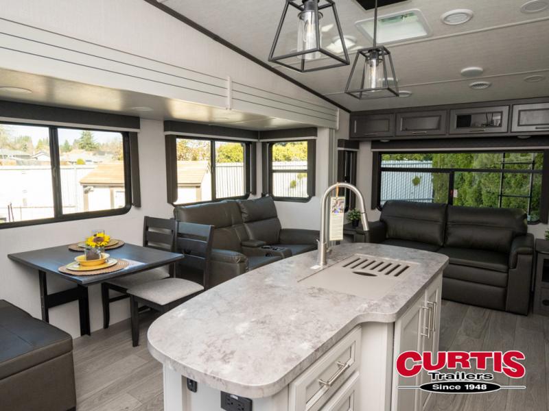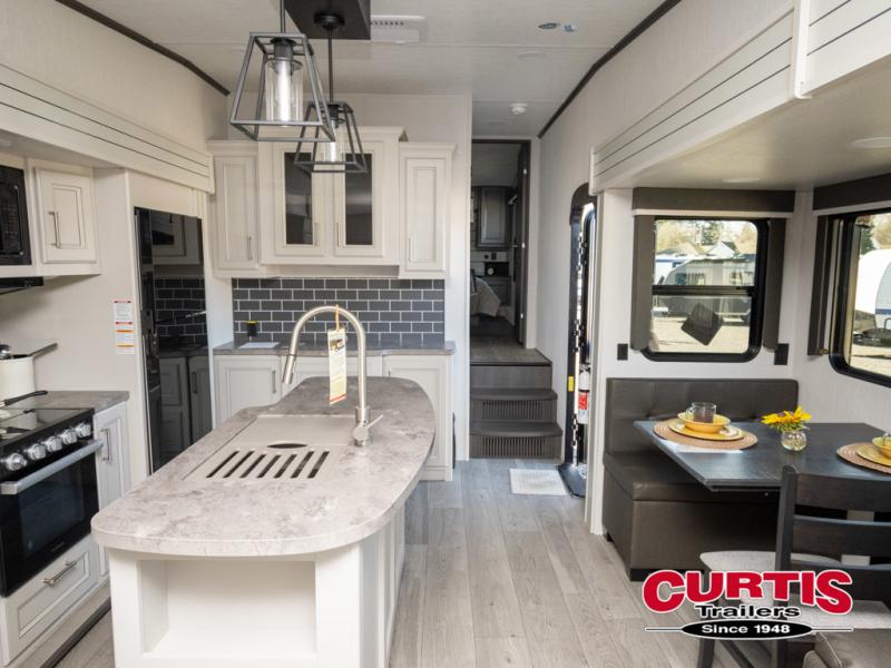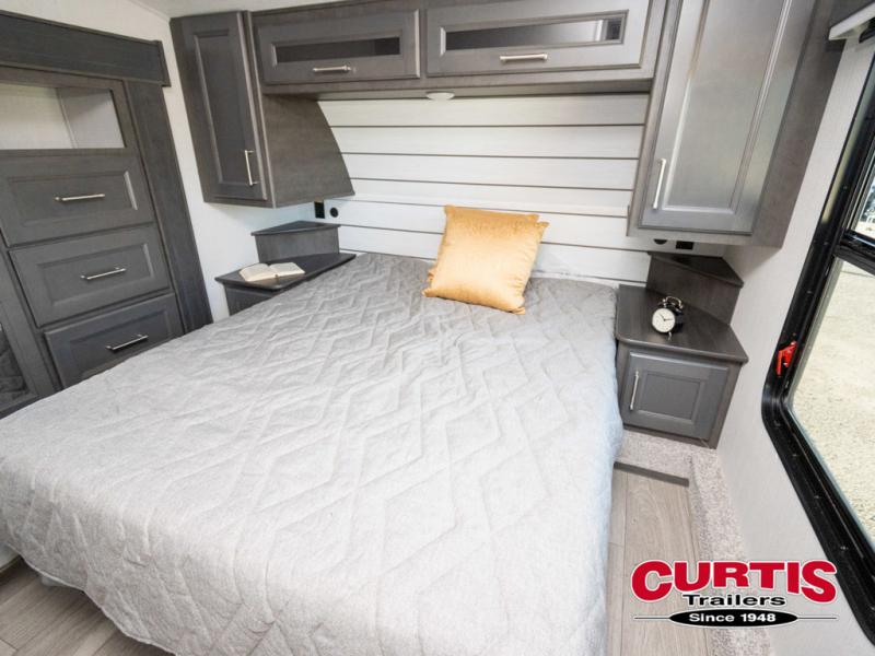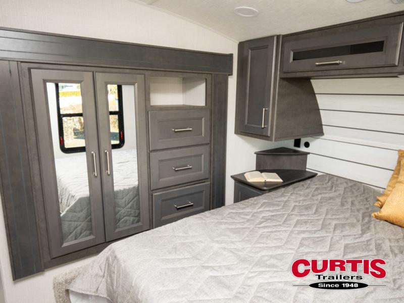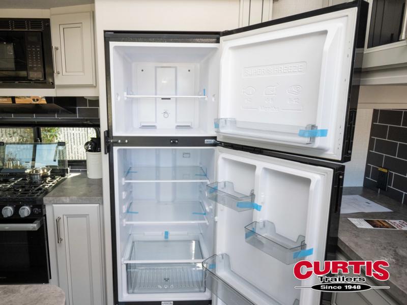 You will have the time of your life in this Cougar Half-Ton fifth wheel! There is so much comfort with the theater seating and 68" tri-fold sleeper sofa with end tables in the living area, and the comfort is taken up a notch with the addition of the fireplace below the entertainment center. You also have lots of space in this area because of the opposing slides, so you can work freely around the kitchen island preparing dinner or washing dishes. The booth dinette is right next to the kitchen, so you won't have to go far to set the table. If you don't need the dinette to serve as a bed, then you might be interested in switching it out for the optional free-standing table with chairs. The pantry is big enough to keep your favorite foods stored away, and the 10.4 cu.ft. refrigerator can hold the items that need to be kept chilled.