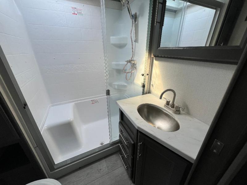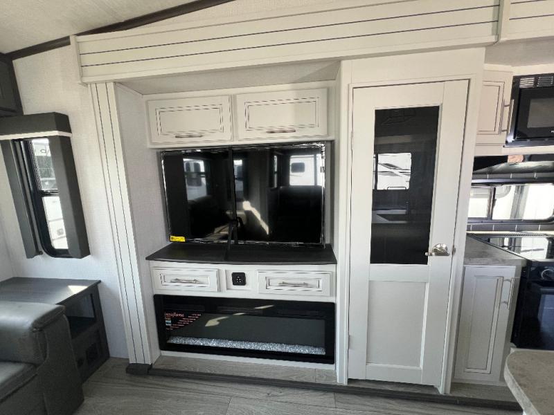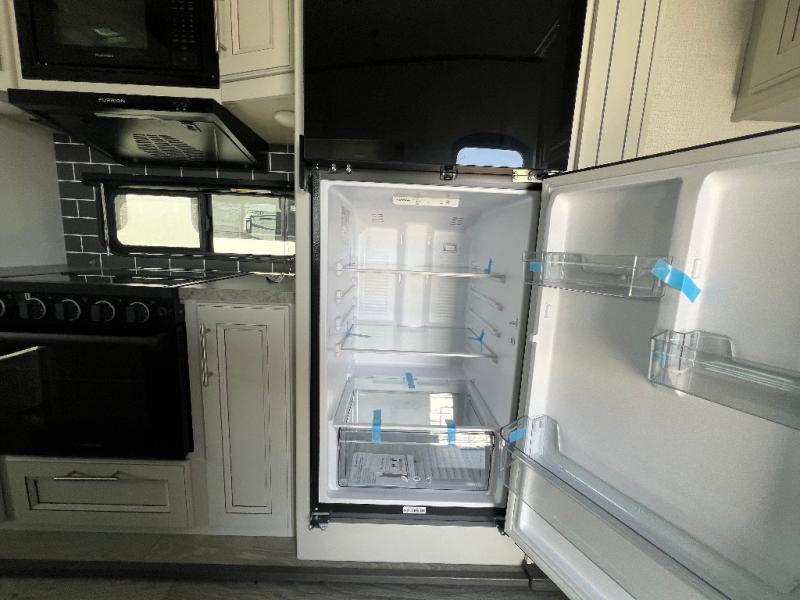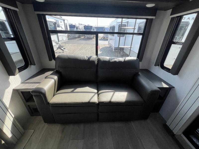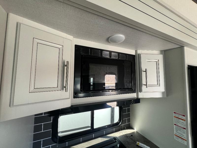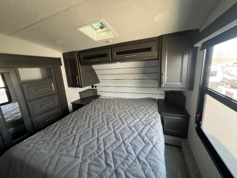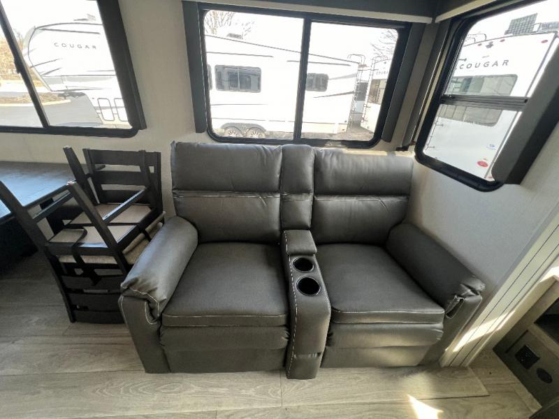 You will have the time of your life in this Cougar Half-Ton fifth wheel! There is so much comfort with the theater seating and 68" tri-fold sleeper sofa with end tables in the living area, and the comfort is taken up a notch with the addition of the fireplace below the entertainment center. You also have lots of space in this area because of the opposing slides, so you can work freely around the kitchen island preparing dinner or washing dishes. The booth dinette is right next to the kitchen, so you won't have to go far to set the table. If you don't need the dinette to serve as a bed, then you might be interested in switching it out for the optional free-standing table with chairs. The pantry is big enough to keep your favorite foods stored away, and the 10.4 cu.ft. refrigerator can hold the items that need to be kept chilled.