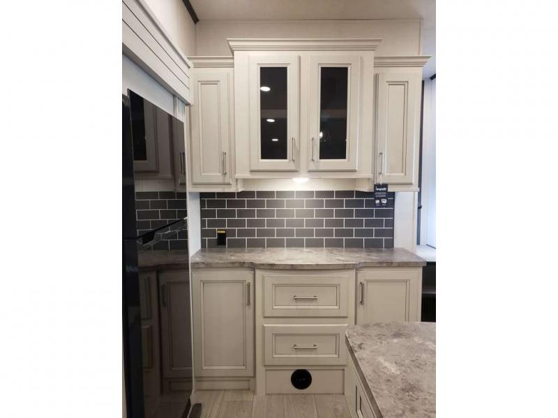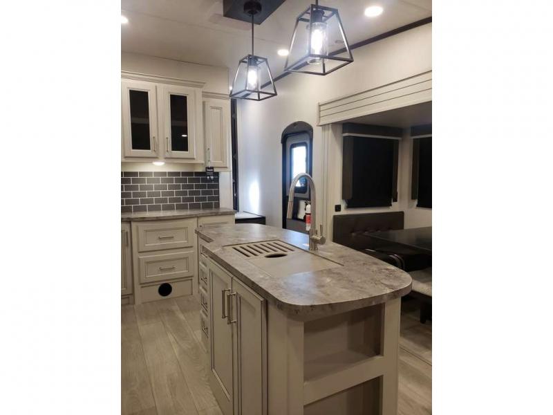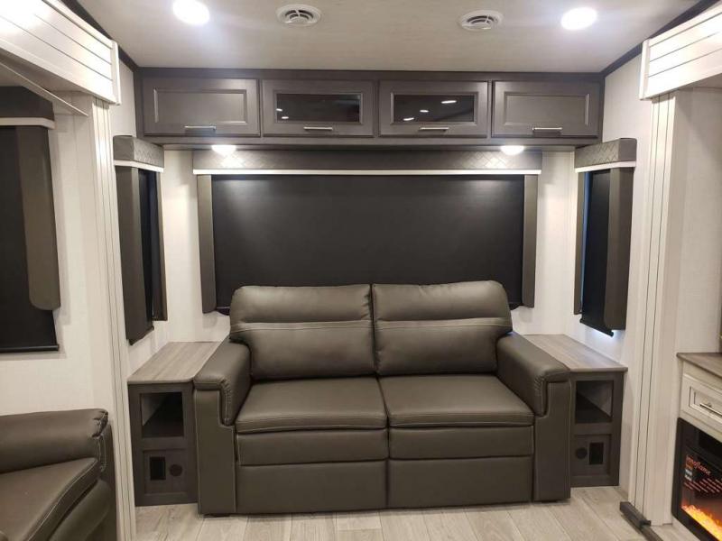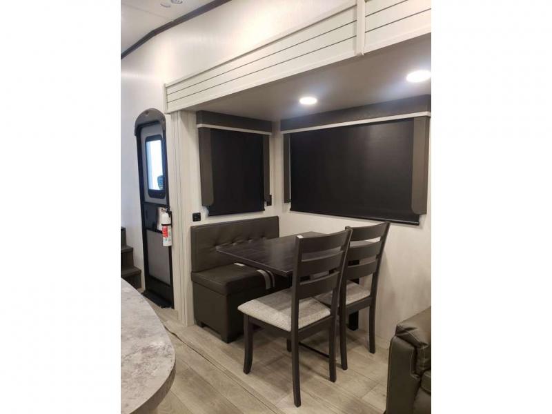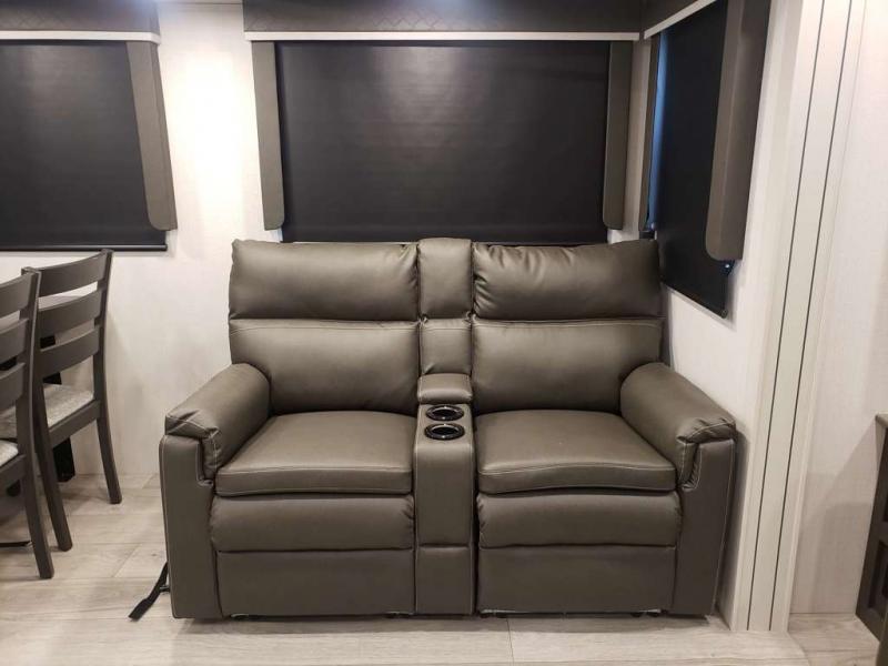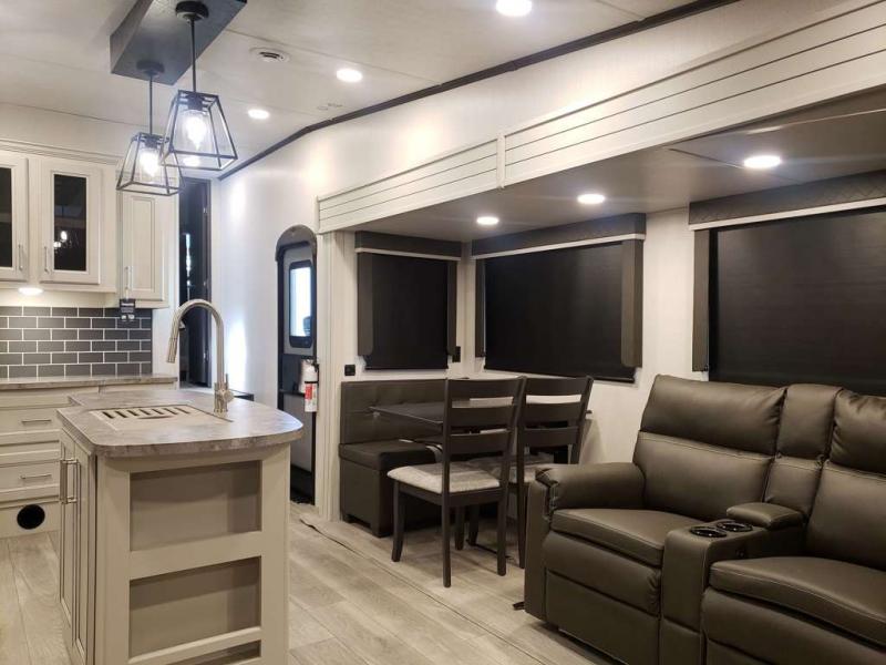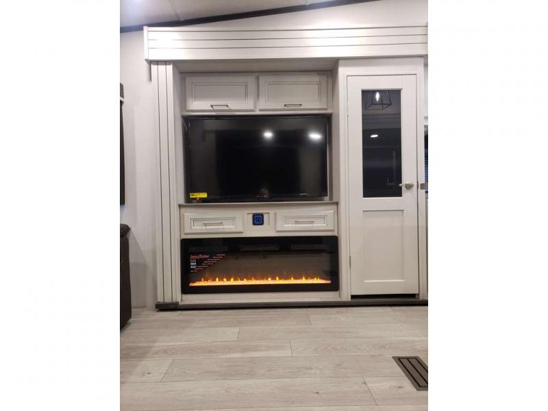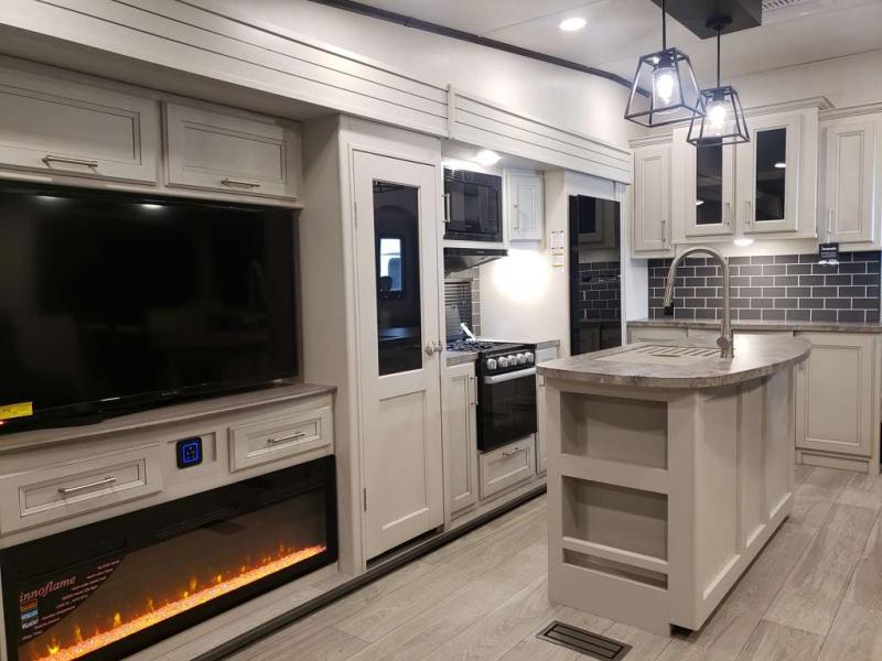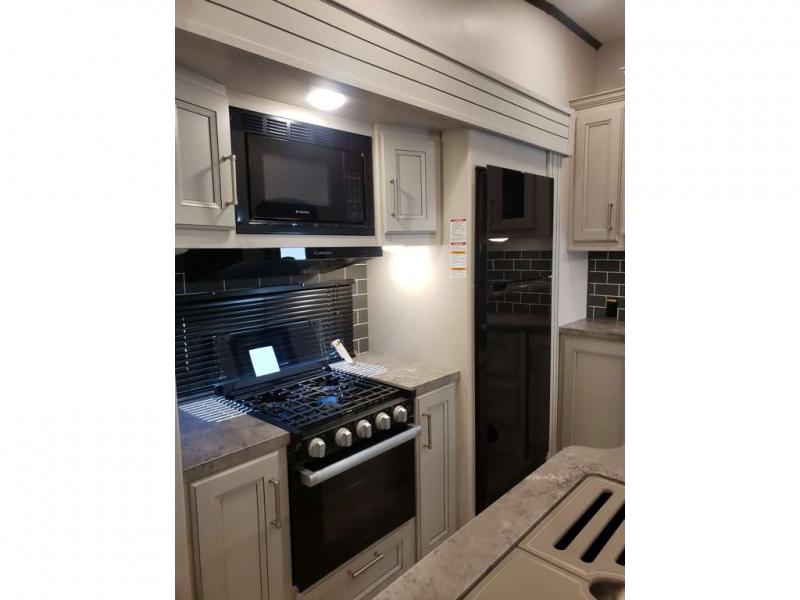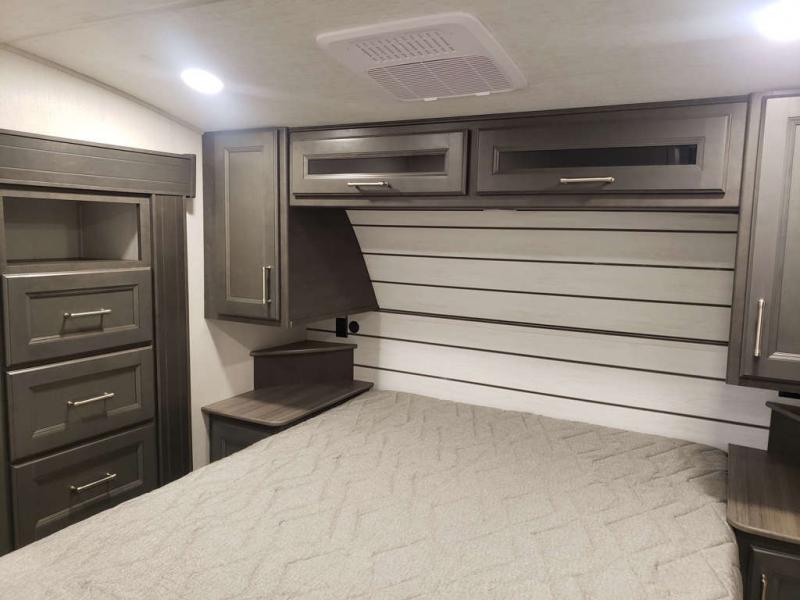 You will have the time of your life in this Cougar Half-Ton fifth wheel! There is so much comfort with the theater seating and 68" tri-fold sleeper sofa with end tables in the living area, and the comfort is taken up a notch with the addition of the fireplace below the entertainment center. You also have lots of space in this area because of the opposing slides, so you can work freely around the kitchen island preparing dinner or washing dishes. The booth dinette is right next to the kitchen, so you won't have to go far to set the table. If you don't need the dinette to serve as a bed, then you might be interested in switching it out for the optional free-standing table with chairs. The pantry is big enough to keep your favorite foods stored away, and the 10.4 cu.ft. refrigerator can hold the items that need to be kept chilled.