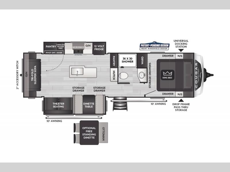 The Keystone Cougar Half-Ton fifth wheel and travel trailers are known as one of America's favorites for a reason! Some of those reasons are the exclusive features that come from Keystone, like the Winegard Air 360+ omni-directional rooftop antenna, the in-floor heating ducts, and the Hyper Deck flooring. The Cougar Half-Ton has a Climate Guard protection package to keep you safe during inclement weather, along with two roof attic vents, PEX plumbing and more. Use the 21" Furrion range with Piezo ignition to create all of those familiar meals from home, and enjoy endless hot showers with the Girard tankless on-demand water heater!