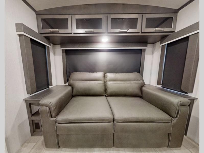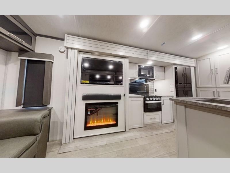 Trips spent in this travel trailer are sure to bring memories! The dual opposing slides in the combined kitchen and living area provide your crew with plenty of space to relax on the theater seating, dine at the dinette table, and prep meals with the kitchen island. There is also a tri-fold sleeper sofa here for guests and a pivoting entertainment center with a hidden pantry to keep snacks stocked. And a second pantry and hutch provides even more storage! You'll love having your own private bedroom up front, complete with a king bed, dual bedside drawers and nightstands and additional storage drawers to keep your space tidy. Outside, you'll find two power awnings, a 2" accessory hitch, and a drop frame pass-thru storage for fishing poles, hiking gear, and more!
