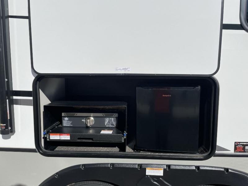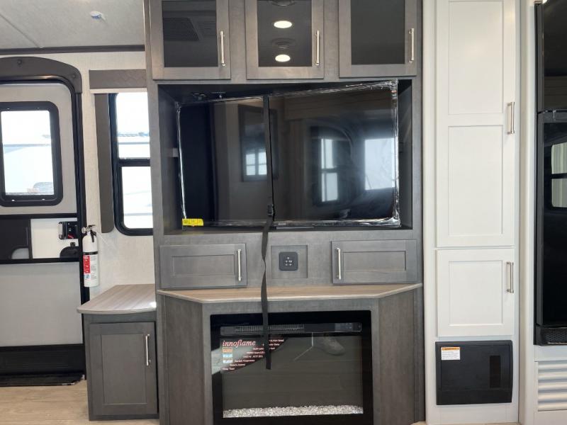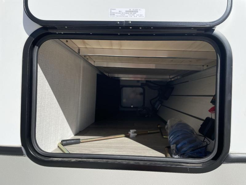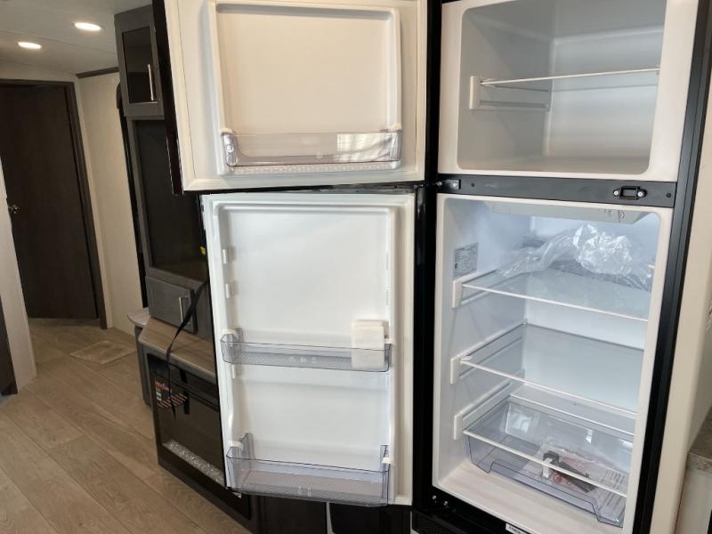 How does a queen bed slide with an optional king bed in the master suite sound? With this Cougar Half-Ton travel trailer, you'll have extra floor space and a full-width wardrobe allowing you to stay at your favorite campsite for long periods of time. The second slide located in the main living and kitchen area opens up this space for you to enjoy time spent inside just as much as outdoor adventures. The furniture even doubles as sleeping space for the kids or overnight guests. The rear kitchen layout is a convenience, and you will appreciate all the counter space for preparing and serving meals. You will find hidden storage behind the entertainment center, and next to the entertainment center is a pantry where you can store your favorite snacks.