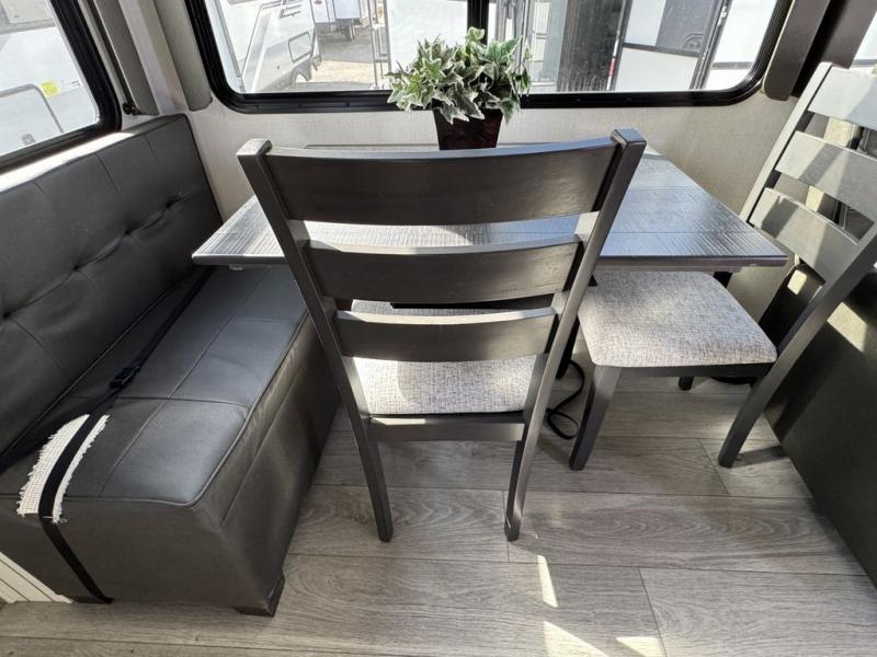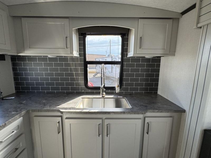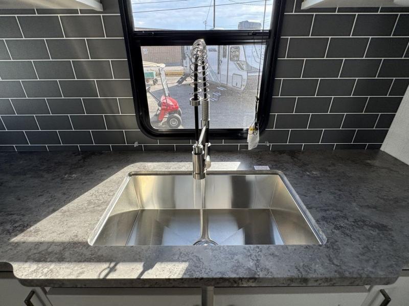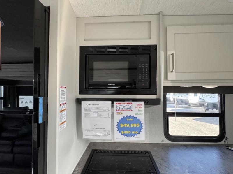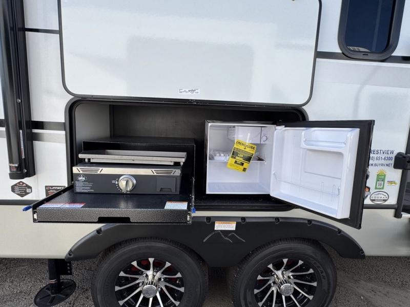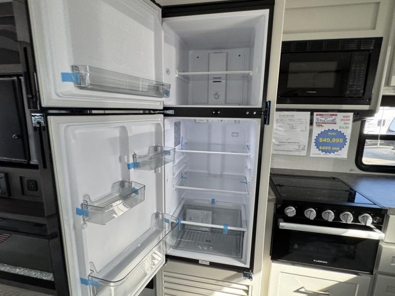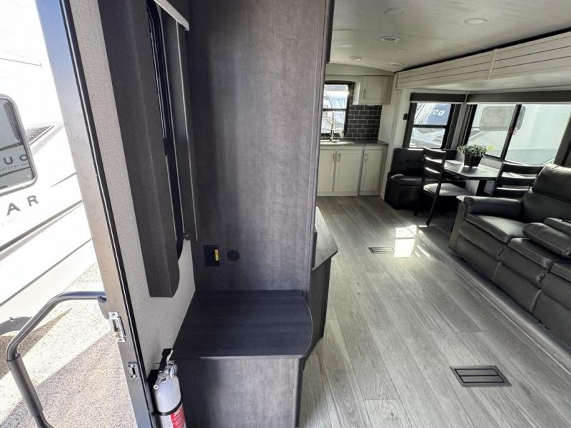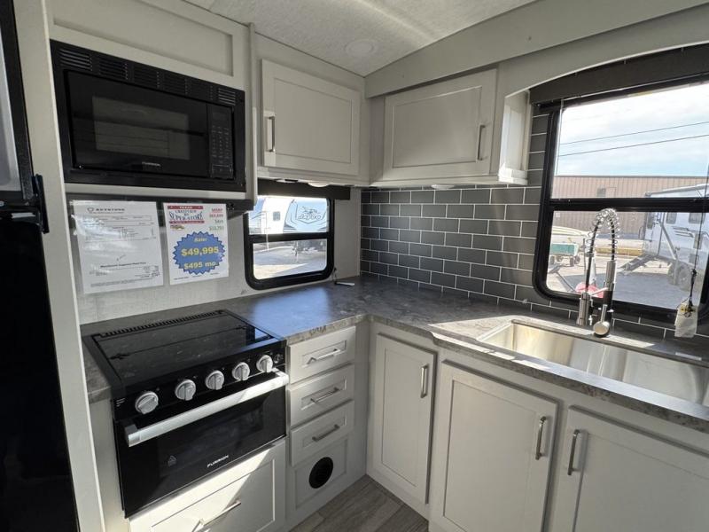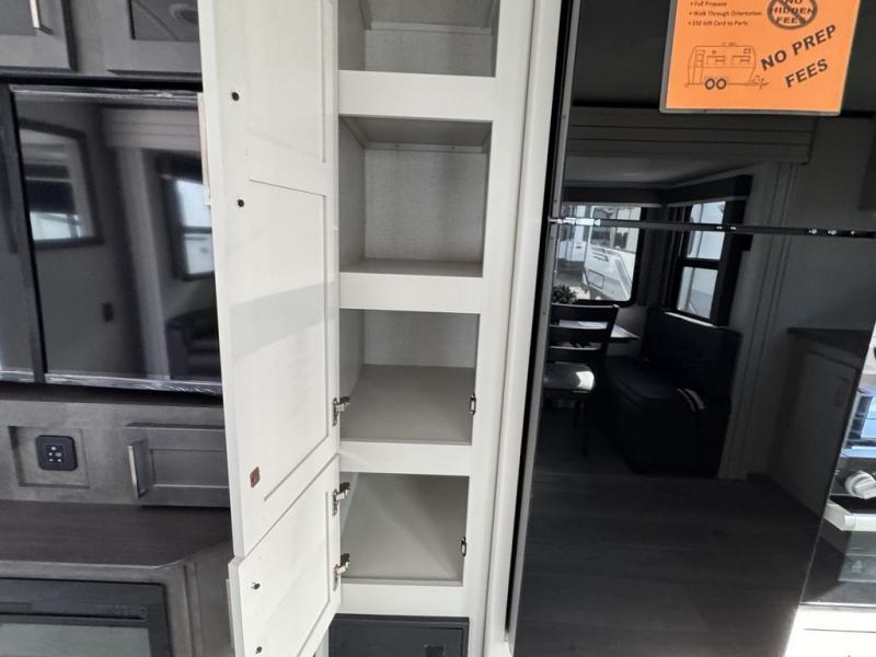How does a queen bed slide with an optional king bed in the master suite sound? With this Cougar Half-Ton travel trailer, you'll have extra floor space and a full-width wardrobe allowing you to stay at your favorite campsite for long periods of time. The second slide located in the main living and kitchen area opens up this space for you to enjoy time spent inside just as much as outdoor adventures. The furniture even doubles as sleeping space for the kids or overnight guests. The rear kitchen layout is a convenience, and you will appreciate all the counter space for preparing and serving meals. You will find hidden storage behind the entertainment center, and next to the entertainment center is a pantry where you can store your favorite snacks.