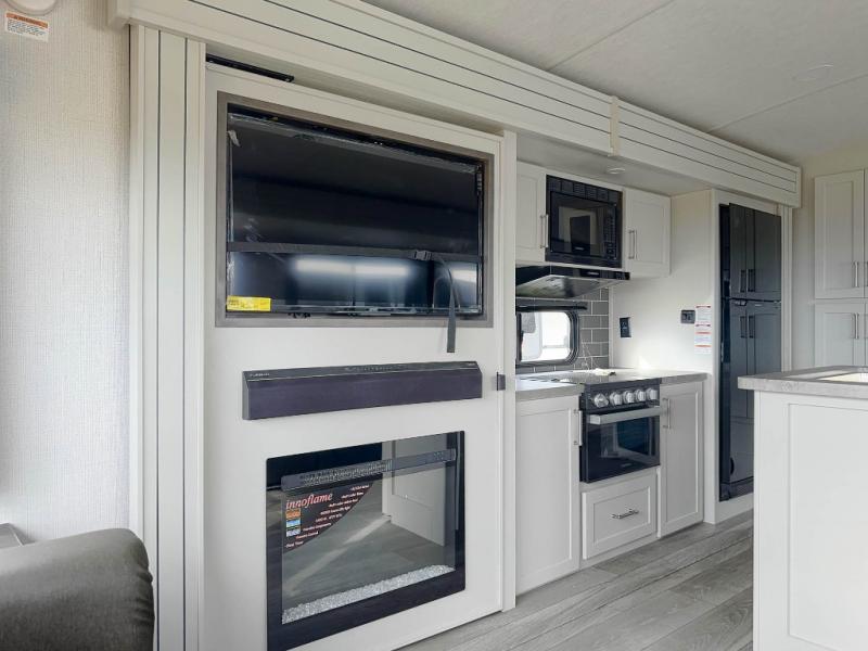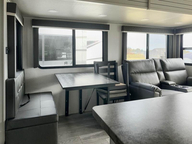 You'll definitely want to snatch up this Cougar Half-Ton travel trailer if you're a couple or small family that wants to live in comfort while at the campsite! There is a private bedroom at the front, and it has a queen bed slide or optional king bed, full-width wardrobe, and a dresser to keep your clothes tidy. Right next to the bedroom is a full bathroom that comes with a linen closet with washer and dryer prep. The main living area is what truly gives you the royal treatment because it has theater seating directly across from the entertainment center and fireplace, a kitchen island that you can gather around when it's snack time, a booth dinette that will serve as a bed or a dinner table, and a 68" tri-fold sleeper sofa with end tables for a cold drink. The kitchen also has a pantry, so you can keep your trailer stocked with goodies throughout the whole trip.