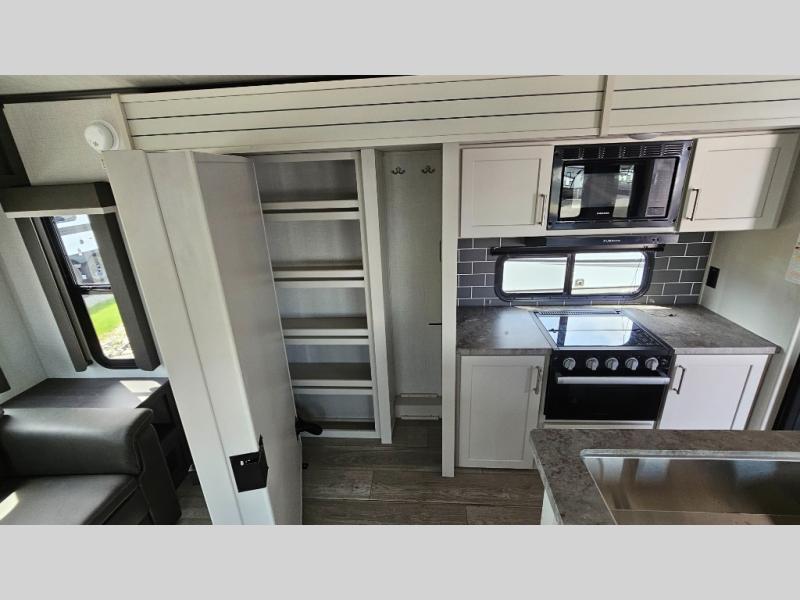 You'll definitely want to snatch up this Cougar Half-Ton travel trailer if you're a couple or small family that wants to live in comfort while at the campsite! There is a private bedroom at the front, and it has a queen bed slide or optional king bed, full-width wardrobe, and a dresser to keep your clothes tidy. Right next to the bedroom is a full bathroom that comes with a linen closet with washer and dryer prep. The main living area is what truly gives you the royal treatment because it has theater seating directly across from the entertainment center and fireplace, a kitchen island that you can gather around when it's snack time, a booth dinette that will serve as a bed or a dinner table, and a 68" tri-fold sleeper sofa with end tables for a cold drink. The kitchen also has a pantry, so you can keep your trailer stocked with goodies throughout the whole trip.