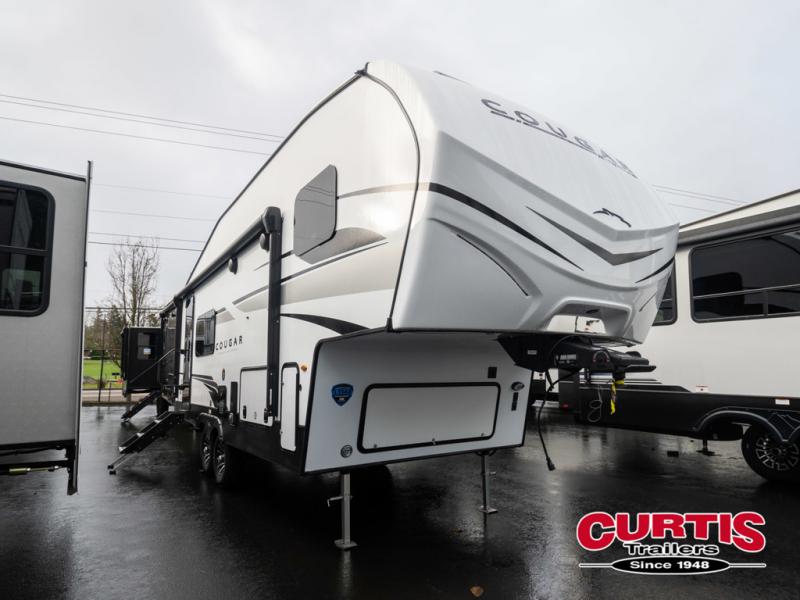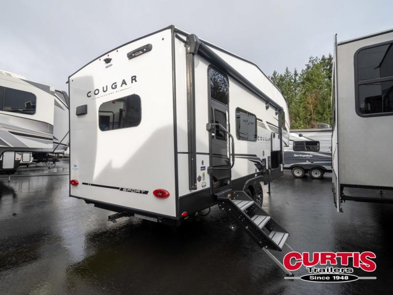 Your family of five or six will love traveling in this Cougar Sport lightweight fifth wheel! Enter to find a convenient rear kitchen layout just steps inside the door. Drop your shoes off in the shoe cubby to your right at the door, and relax on either the tri-fold sleeper sofa or at the booth dinette. The sofa and a 12 volt refrigerator are situated within the slide for added roominess. Head up the steps to a complete bath and private front bedroom featuring a queen size bed with dual shirt wardrobes and nightstands on both sides of the bed. There is also a wardrobe off the foot of the bed along the inside wall with two convenient drawers as well. The bathroom offers a shower with a skylight for added headroom and natural lighting. You will also appreciate the medicine cabinet over the sink for your personal items. Back down to the main living and kitchen area, a nice size pantry will hold all of your dry goods and snacks, and there is ample storage in the overhead cabinets above the dinette on either side of the TV, plus in the kitchen area all along the rear wall. Here you can cook your family their camp favorites using either the three burner range with oven, or overhead microwave. Outside, a 17' awning provides added living space protected from the elements!