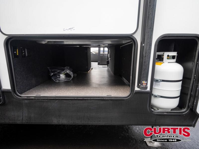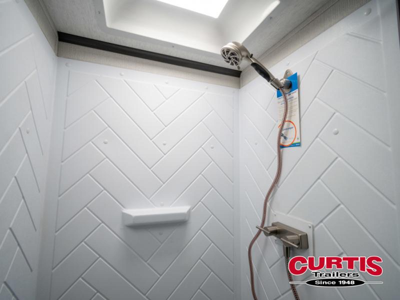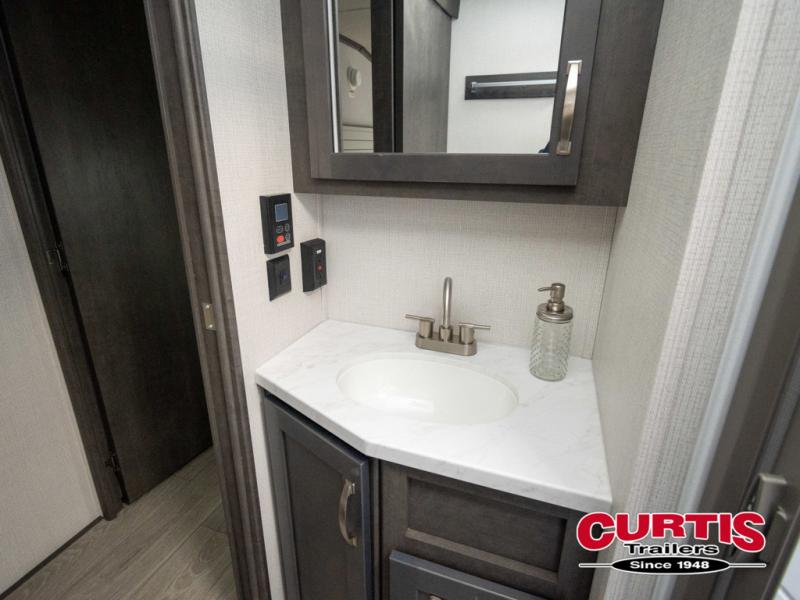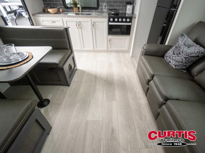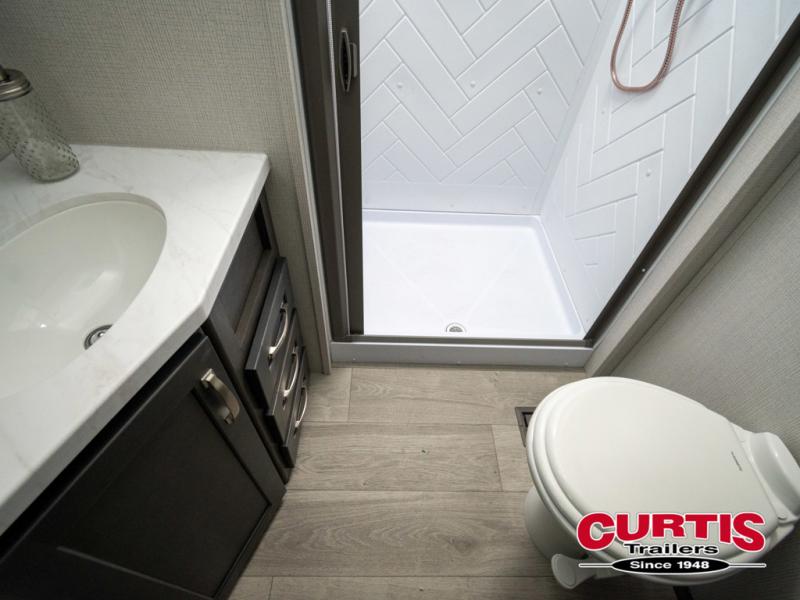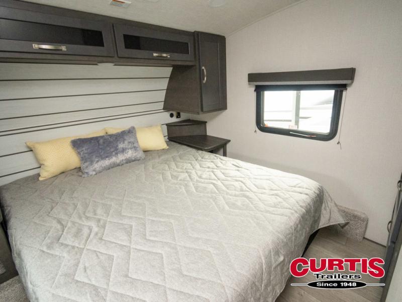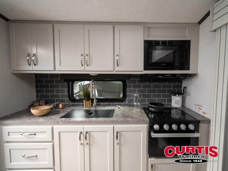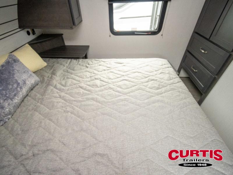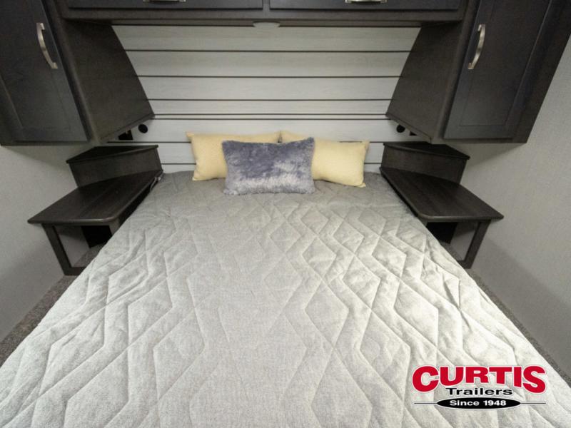 The Cougar Sport structural I-beam frame with stamped steel cross-members and outriggers, plus its laminated sidewalls with five-sided aluminum superstructure and Alpha Super Flex roof membrane are what active RVers love about the construction of the Cougar line. The Cougar Sport models are no exception when it comes to a great package, as well as being smaller and lighter weight than their big brother Cougar models. A one-piece, heated and enclosed polypropylene underbelly means a longer camping season. On the inside, residential shaker style hardwood cabinet doors and decorative crown molding, plus seamless pressed countertops and an on-demand water heater will make your unit feel even more like home. You are also sure to appreciate the shiplap style decorative accent wall behind the bed, a porcelain foot flush toilet in the bathroom, plus residential kitchen hardware, and so much more.