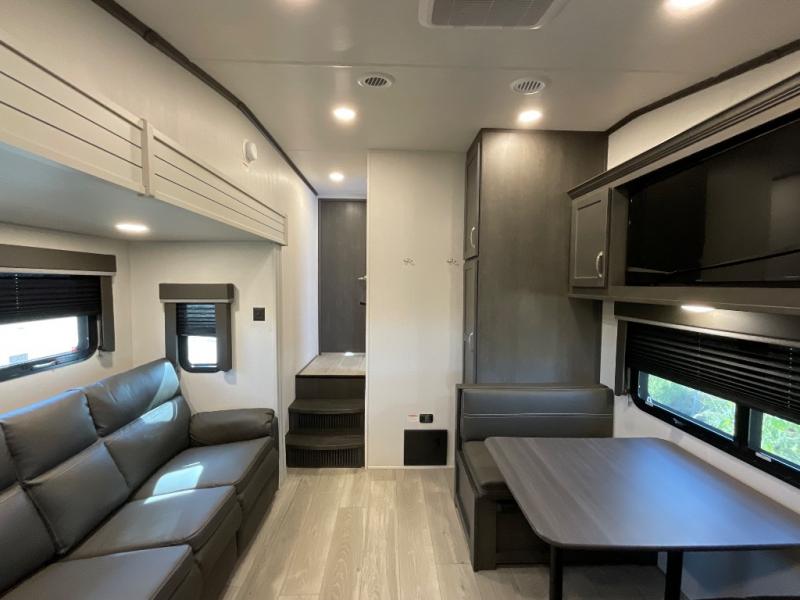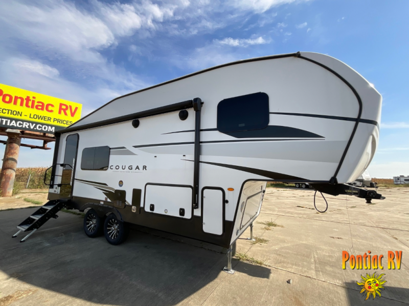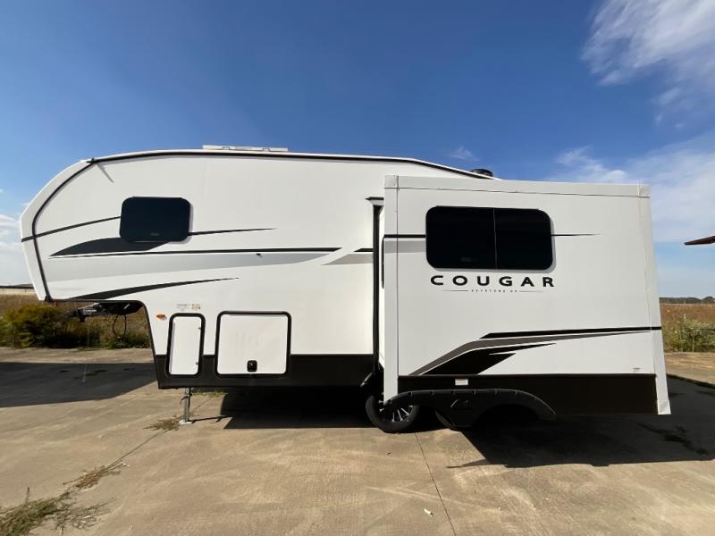 Your family of five or six will love traveling in this Cougar Sport lightweight fifth wheel! Enter to find a convenient rear kitchen layout just steps inside the door. Drop your shoes off in the shoe cubby to your right at the door, and relax on either the tri-fold sleeper sofa or at the booth dinette. The sofa and a 12 volt refrigerator are situated within the slide for added roominess. Head up the steps to a complete bath and private front bedroom featuring a queen size bed with dual shirt wardrobes and nightstands on both sides of the bed. There is also a wardrobe off the foot of the bed along the inside wall with two convenient drawers as well. The bathroom offers a shower with a skylight for added headroom and natural lighting. You will also appreciate the medicine cabinet over the sink for your personal items. Back down to the main living and kitchen area, a nice size pantry will hold all of your dry goods and snacks, and there is ample storage in the overhead cabinets above the dinette on either side of the TV, plus in the kitchen area all along the rear wall. Here you can cook your family their camp favorites using either the three burner range with oven, or overhead microwave. Outside, a 17' awning provides added living space protected from the elements!