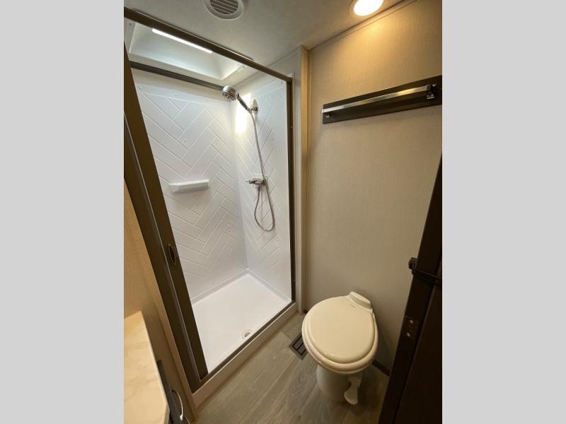 The Cougar Sport structural I-beam frame with stamped steel cross-members and outriggers, plus its laminated sidewalls with five-sided aluminum superstructure and Alpha Super Flex roof membrane are what active RVers love about the construction of the Cougar line. The Cougar Sport models are no exception when it comes to a great package, as well as being smaller and lighter weight than their big brother Cougar models. A one-piece, heated and enclosed polypropylene underbelly means a longer camping season. On the inside, residential shaker style hardwood cabinet doors and decorative crown molding, plus seamless pressed countertops and an on-demand water heater will make your unit feel even more like home. You are also sure to appreciate the shiplap style decorative accent wall behind the bed, a porcelain foot flush toilet in the bathroom, plus residential kitchen hardware, and so much more.