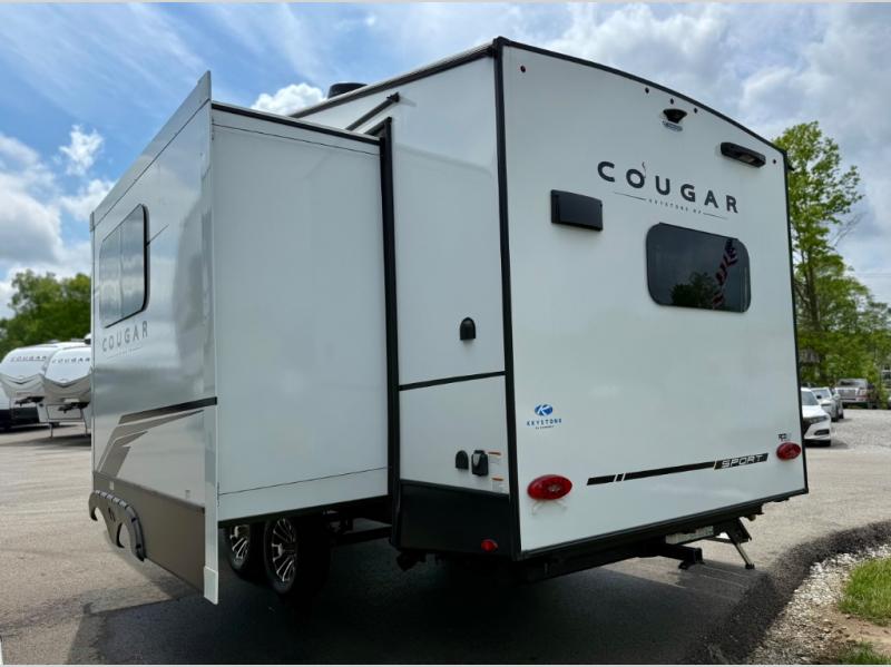 Your family of five or six will love traveling in this Cougar Sport lightweight fifth wheel! Enter to find a convenient rear kitchen layout just steps inside the door. Drop your shoes off in the shoe cubby to your right at the door, and relax on either the tri-fold sleeper sofa or at the booth dinette. The sofa and a 12 volt refrigerator are situated within the slide for added roominess. Head up the steps to a complete bath and private front bedroom featuring a queen size bed with dual shirt wardrobes and nightstands on both sides of the bed. There is also a wardrobe off the foot of the bed along the inside wall with two convenient drawers as well. The bathroom offers a shower with a skylight for added headroom and natural lighting. You will also appreciate the medicine cabinet over the sink for your personal items. Back down to the main living and kitchen area, a nice size pantry will hold all of your dry goods and snacks, and there is ample storage in the overhead cabinets above the dinette on either side of the TV, plus in the kitchen area all along the rear wall. Here you can cook your family their camp favorites using either the three burner range with oven, or overhead microwave. Outside, a 17' awning provides added living space protected from the elements!