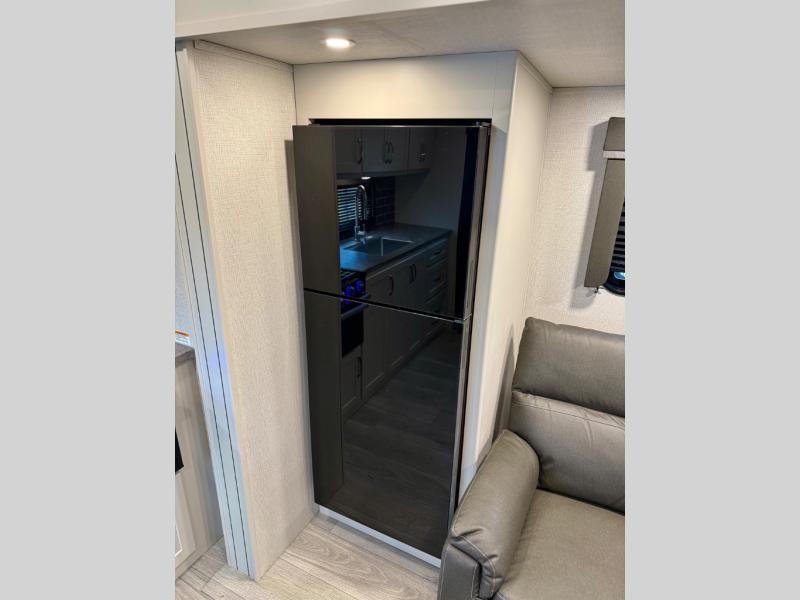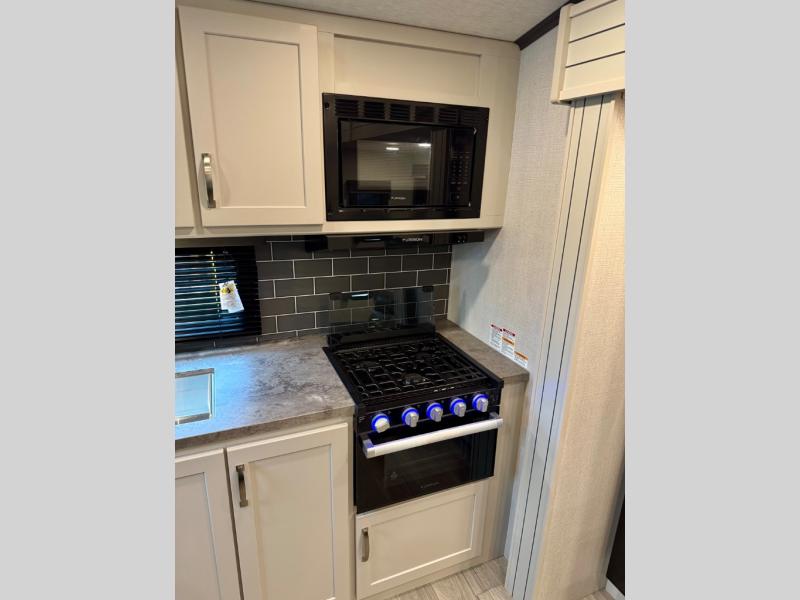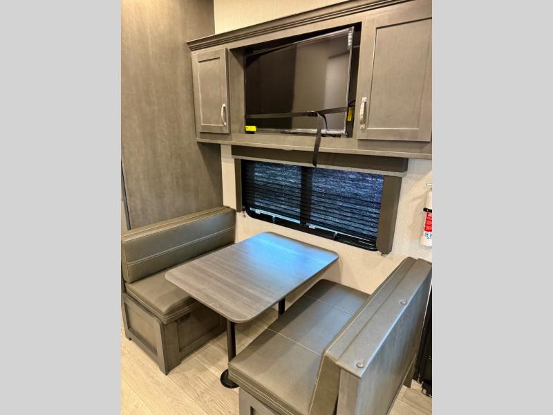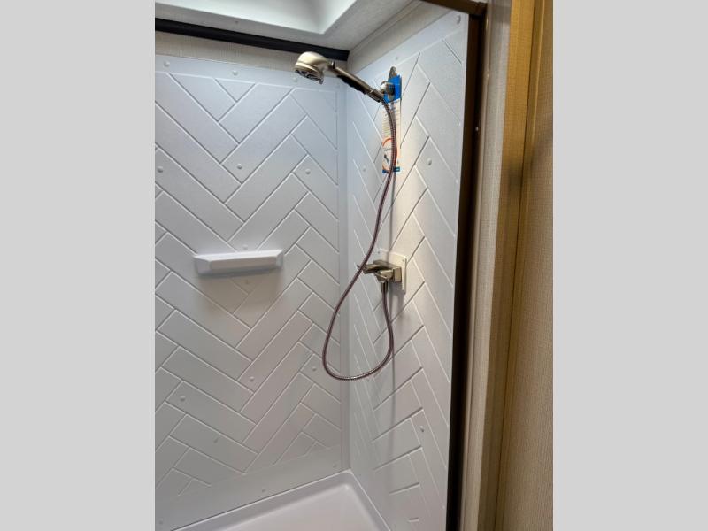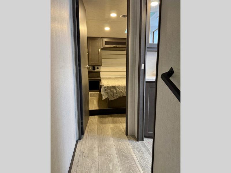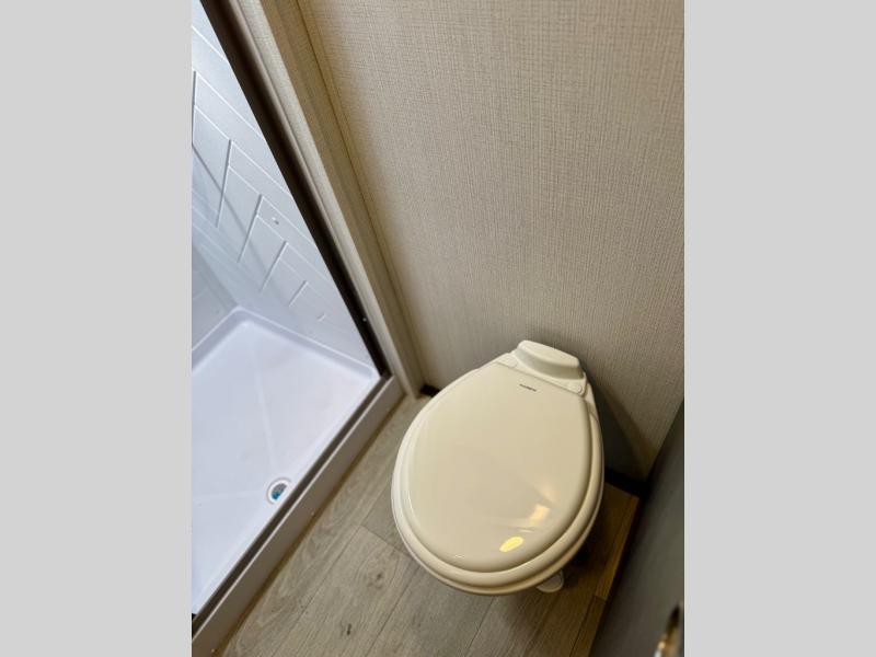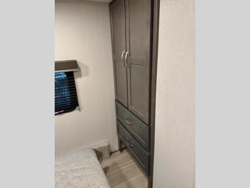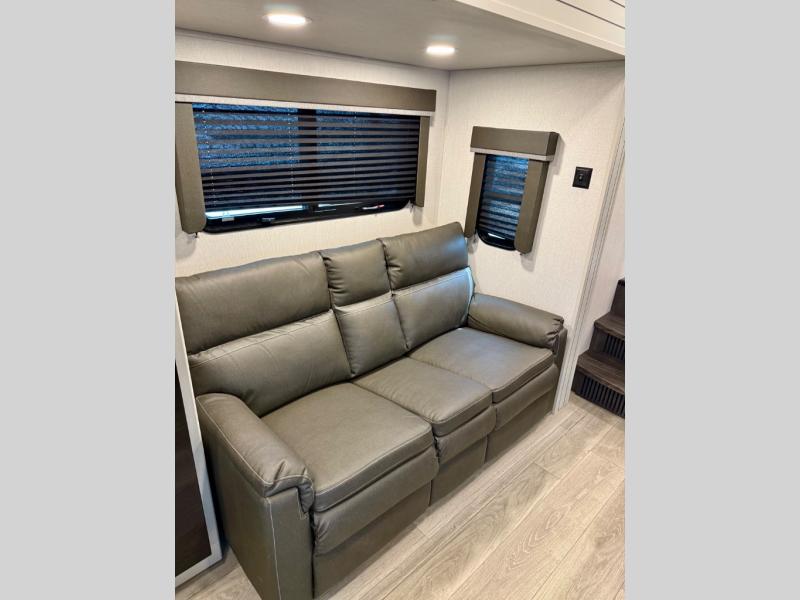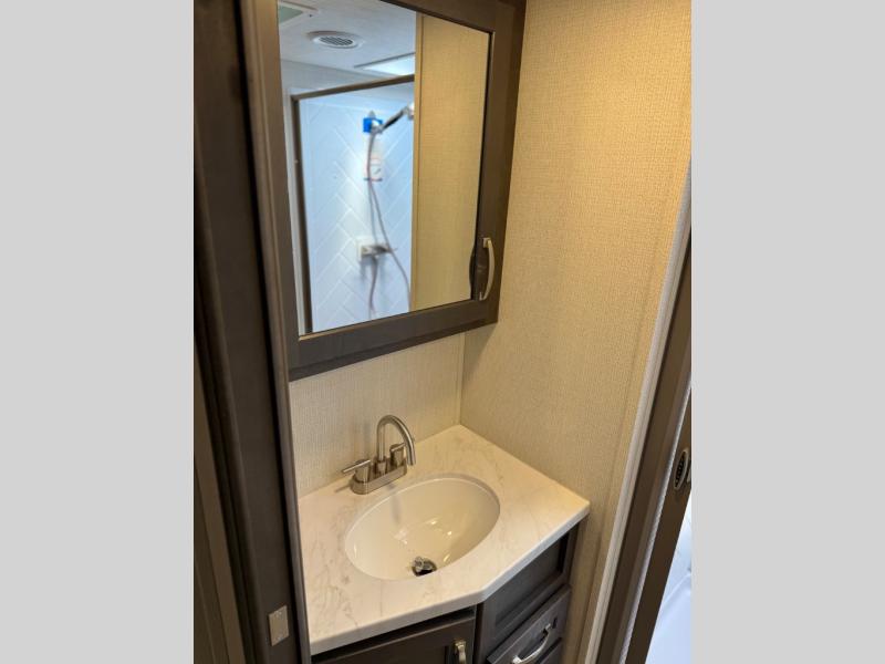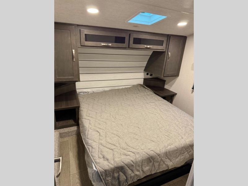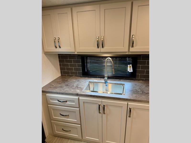 The Cougar Sport structural I-beam frame with stamped steel cross-members and outriggers, plus its laminated sidewalls with five-sided aluminum superstructure and Alpha Super Flex roof membrane are what active RVers love about the construction of the Cougar line. The Cougar Sport models are no exception when it comes to a great package, as well as being smaller and lighter weight than their big brother Cougar models. A one-piece, heated and enclosed polypropylene underbelly means a longer camping season. On the inside, residential shaker style hardwood cabinet doors and decorative crown molding, plus seamless pressed countertops and an on-demand water heater will make your unit feel even more like home. You are also sure to appreciate the shiplap style decorative accent wall behind the bed, a porcelain foot flush toilet in the bathroom, plus residential kitchen hardware, and so much more.
