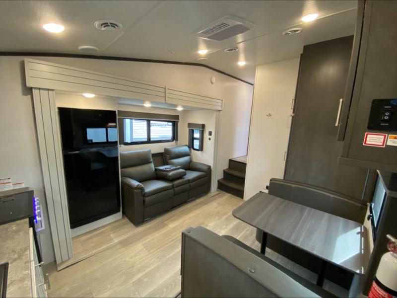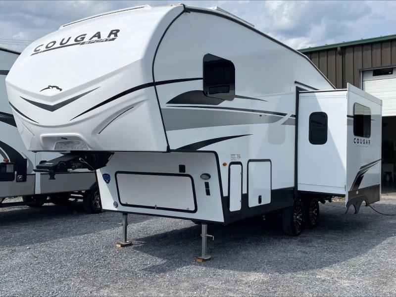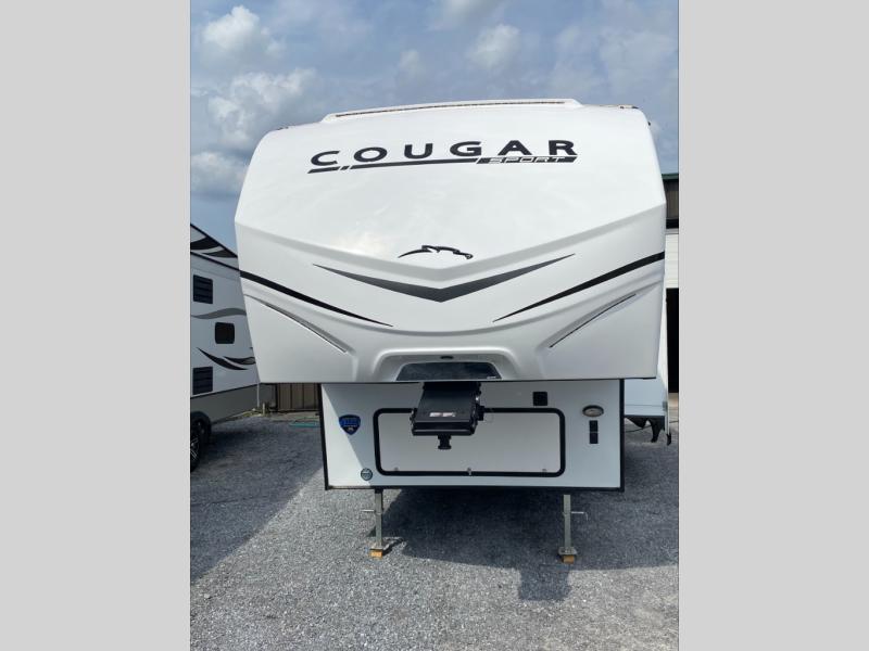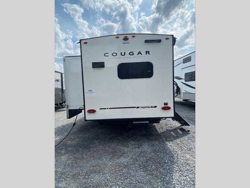 Your family of five or six will love traveling in this Cougar Sport lightweight fifth wheel! Enter to find a convenient rear kitchen layout just steps inside the door. Drop your shoes off in the shoe cubby to your right at the door, and relax on either the tri-fold sleeper sofa or at the booth dinette. The sofa and a 12 volt refrigerator are situated within the slide for added roominess. Head up the steps to a complete bath and private front bedroom featuring a queen size bed with dual shirt wardrobes and nightstands on both sides of the bed. There is also a wardrobe off the foot of the bed along the inside wall with two convenient drawers as well. The bathroom offers a shower with a skylight for added headroom and natural lighting. You will also appreciate the medicine cabinet over the sink for your personal items. Back down to the main living and kitchen area, a nice size pantry will hold all of your dry goods and snacks, and there is ample storage in the overhead cabinets above the dinette on either side of the TV, plus in the kitchen area all along the rear wall. Here you can cook your family their camp favorites using either the three burner range with oven, or overhead microwave. Outside, a 17' awning provides added living space protected from the elements!