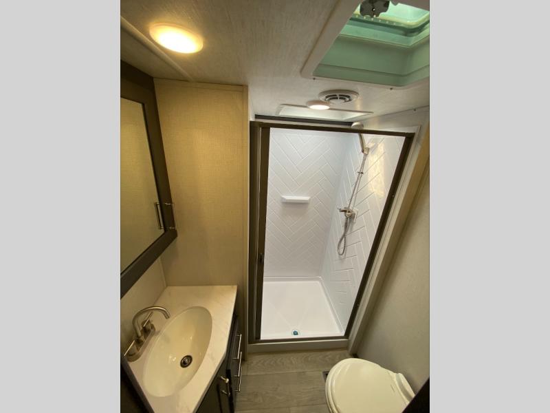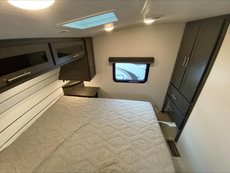 The Cougar Sport structural I-beam frame with stamped steel cross-members and outriggers, plus its laminated sidewalls with five-sided aluminum superstructure and Alpha Super Flex roof membrane are what active RVers love about the construction of the Cougar line. The Cougar Sport models are no exception when it comes to a great package, as well as being smaller and lighter weight than their big brother Cougar models. A one-piece, heated and enclosed polypropylene underbelly means a longer camping season. On the inside, residential shaker style hardwood cabinet doors and decorative crown molding, plus seamless pressed countertops and an on-demand water heater will make your unit feel even more like home. You are also sure to appreciate the shiplap style decorative accent wall behind the bed, a porcelain foot flush toilet in the bathroom, plus residential kitchen hardware, and so much more.
