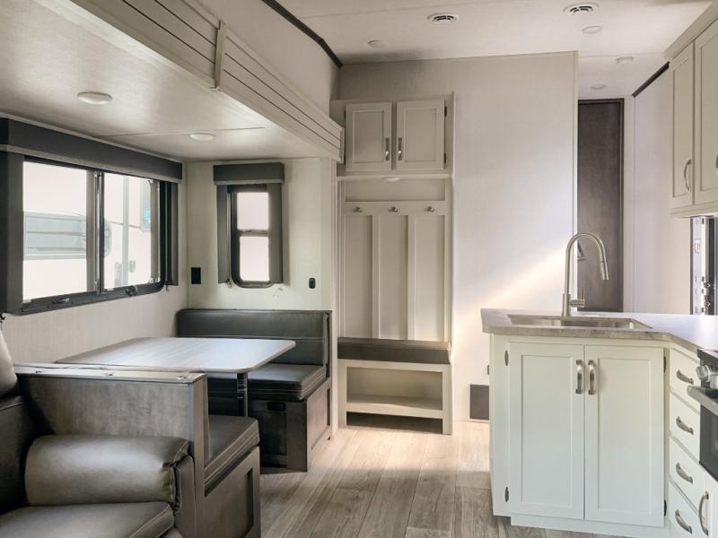 This lightweight fifth wheel is big enough for your small family to camp together! Enter to find a convenient combined kitchen and living space with large slide for added space. The slide features theater seating and a booth dinette which offers ample seating for meals and hanging out. There is a flip up table along the rear wall with a nearby 40" LED TV which features a butler pantry behind. Head up the steps to the right of the entry door to a complete bath and private front bedroom featuring a queen size bed with dual shirt wardrobes and nightstands on both sides of the bed. The bathroom offers a shower with a skylight for added headroom and natural lighting. Outside, a 16' awning provides added living space protected from the elements!