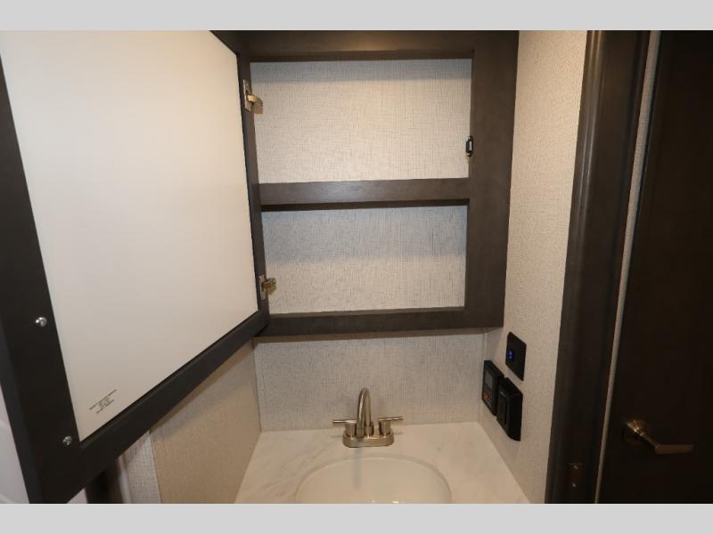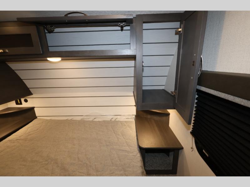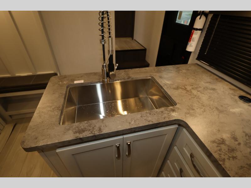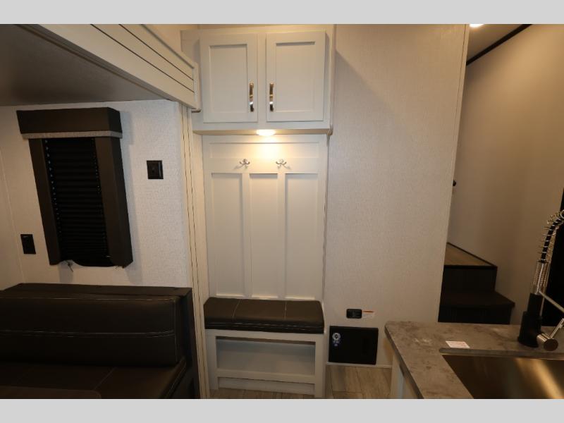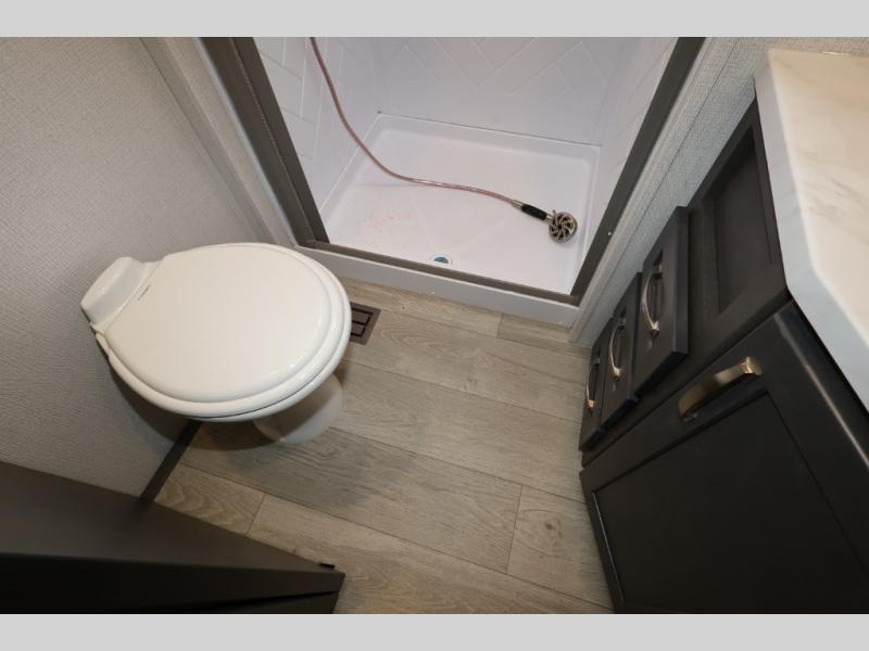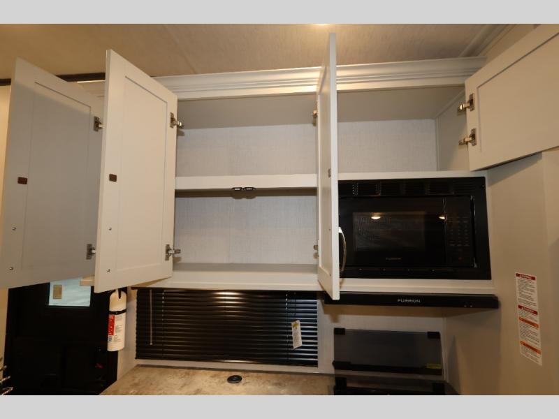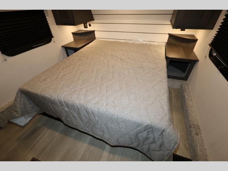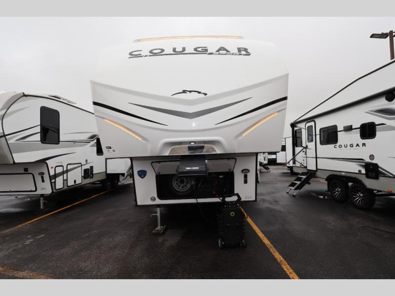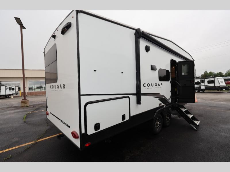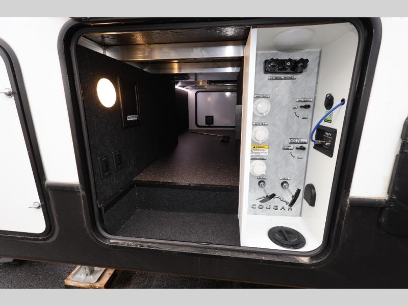 The Cougar Sport structural I-beam frame with stamped steel cross-members and outriggers, plus its laminated sidewalls with five-sided aluminum superstructure and Alpha Super Flex roof membrane are what active RVers love about the construction of the Cougar line. The Cougar Sport models are no exception when it comes to a great package, as well as being smaller and lighter weight than their big brother Cougar models. A one-piece, heated and enclosed polypropylene underbelly means a longer camping season. On the inside, residential shaker style hardwood cabinet doors and decorative crown molding, plus seamless pressed countertops and an on-demand water heater will make your unit feel even more like home. You are also sure to appreciate the shiplap style decorative accent wall behind the bed, a porcelain foot flush toilet in the bathroom, plus residential kitchen hardware, and so much more.