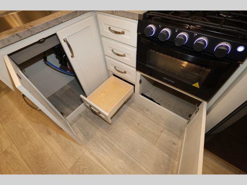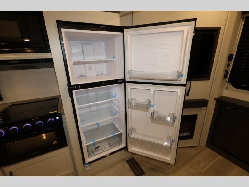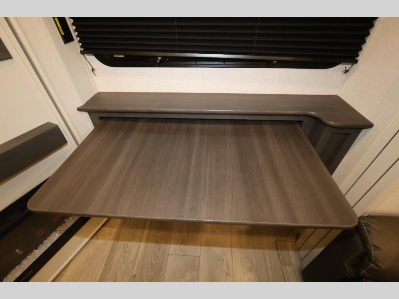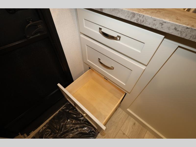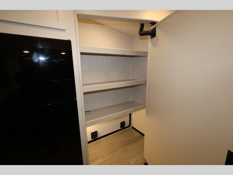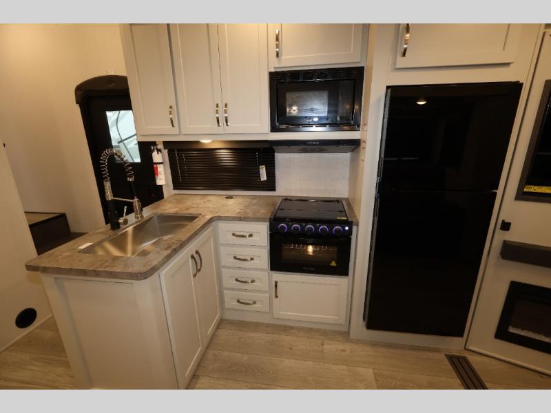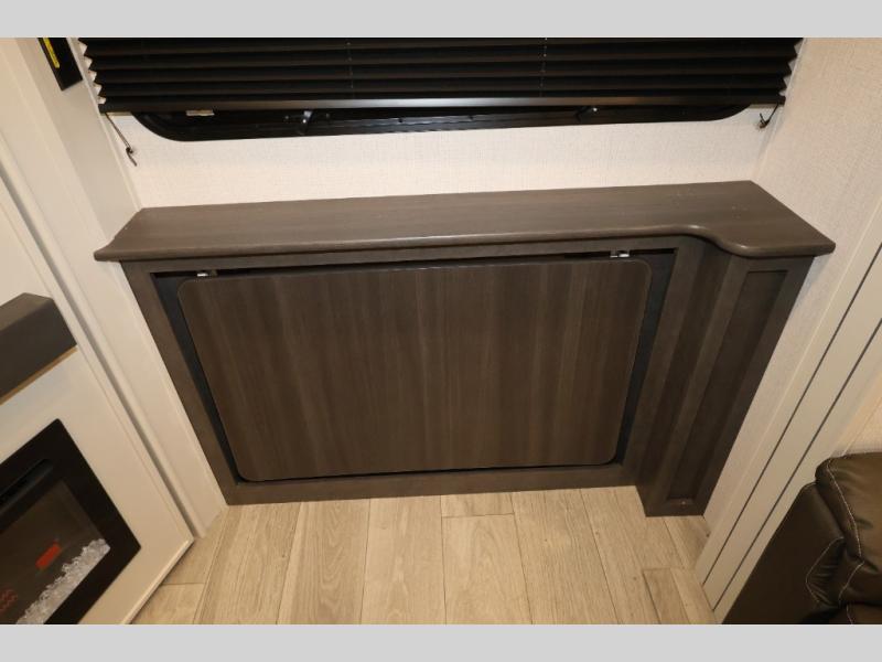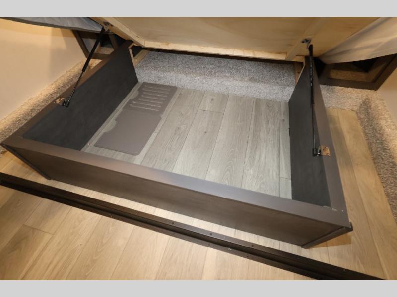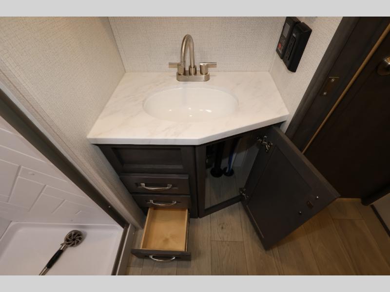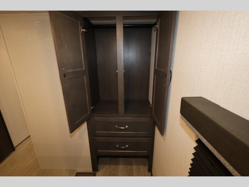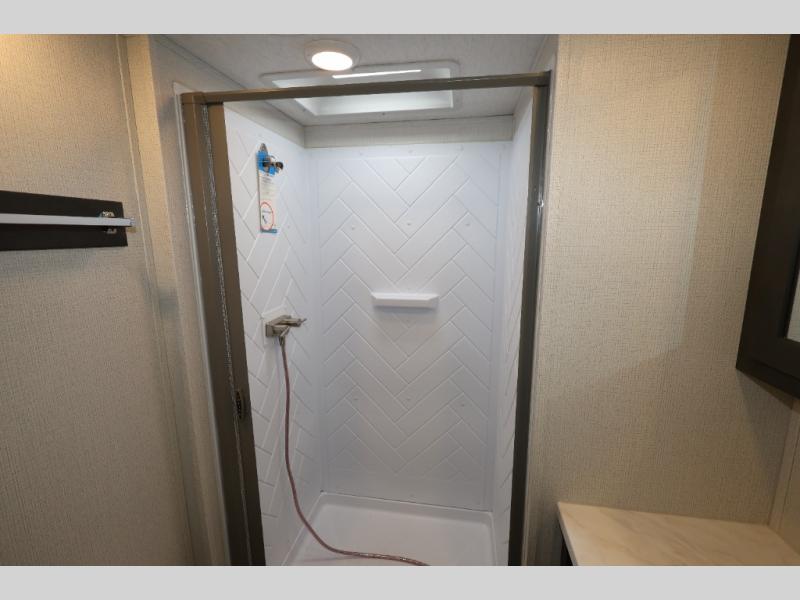 The Cougar Sport structural I-beam frame with stamped steel cross-members and outriggers, plus its laminated sidewalls with five-sided aluminum superstructure and Alpha Super Flex roof membrane are what active RVers love about the construction of the Cougar line. The Cougar Sport models are no exception when it comes to a great package, as well as being smaller and lighter weight than their big brother Cougar models. A one-piece, heated and enclosed polypropylene underbelly means a longer camping season. On the inside, residential shaker style hardwood cabinet doors and decorative crown molding, plus seamless pressed countertops and an on-demand water heater will make your unit feel even more like home. You are also sure to appreciate the shiplap style decorative accent wall behind the bed, a porcelain foot flush toilet in the bathroom, plus residential kitchen hardware, and so much more.