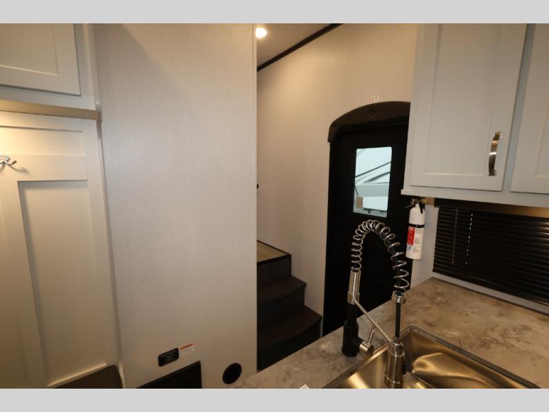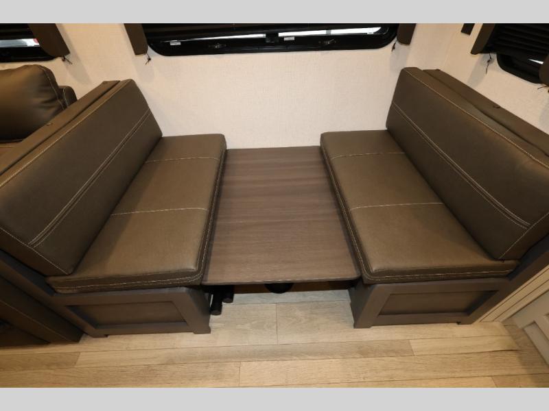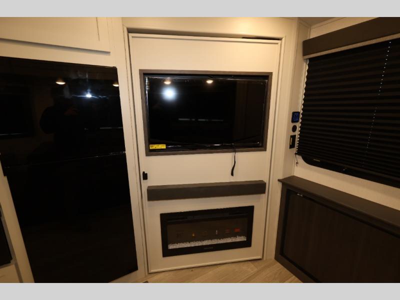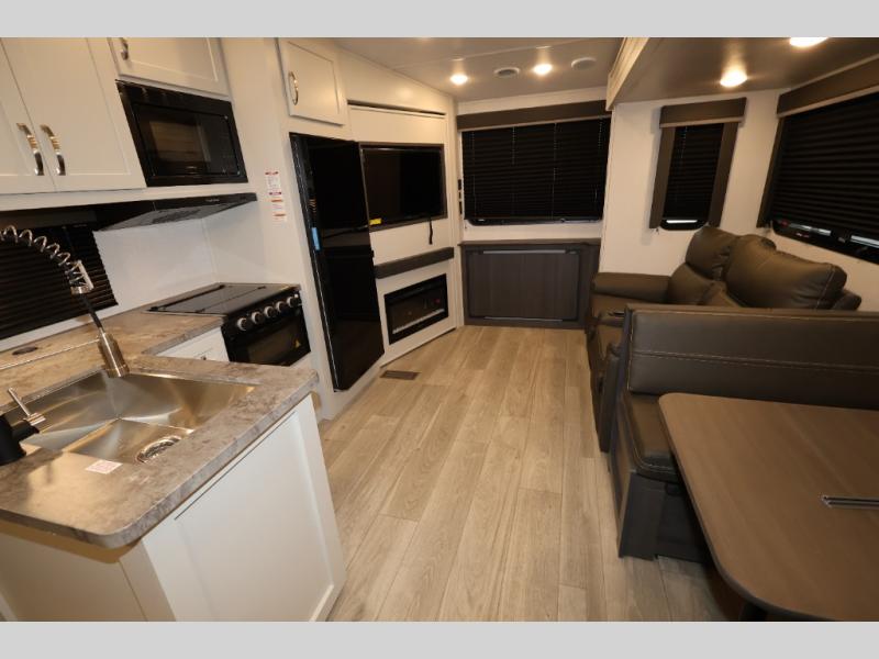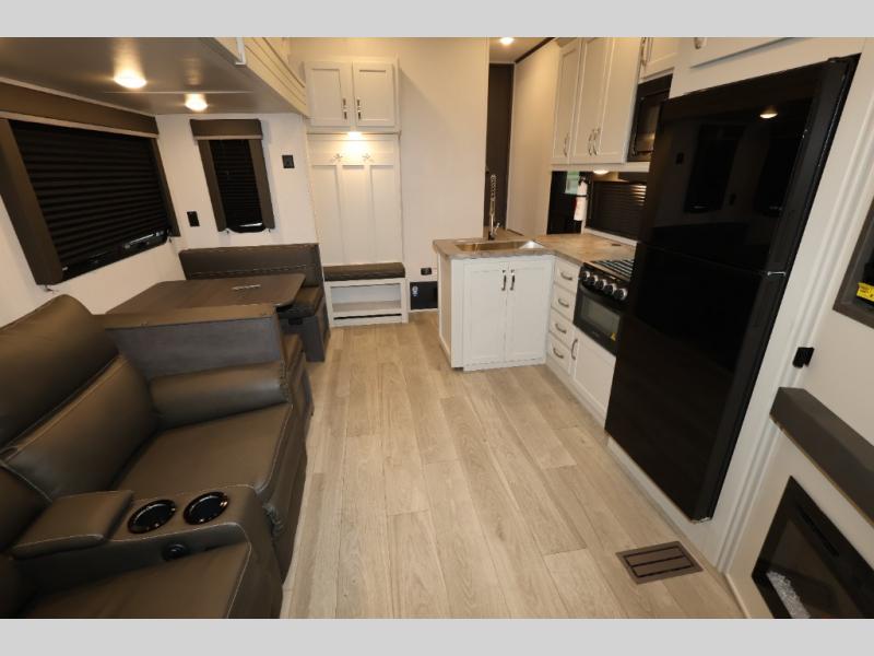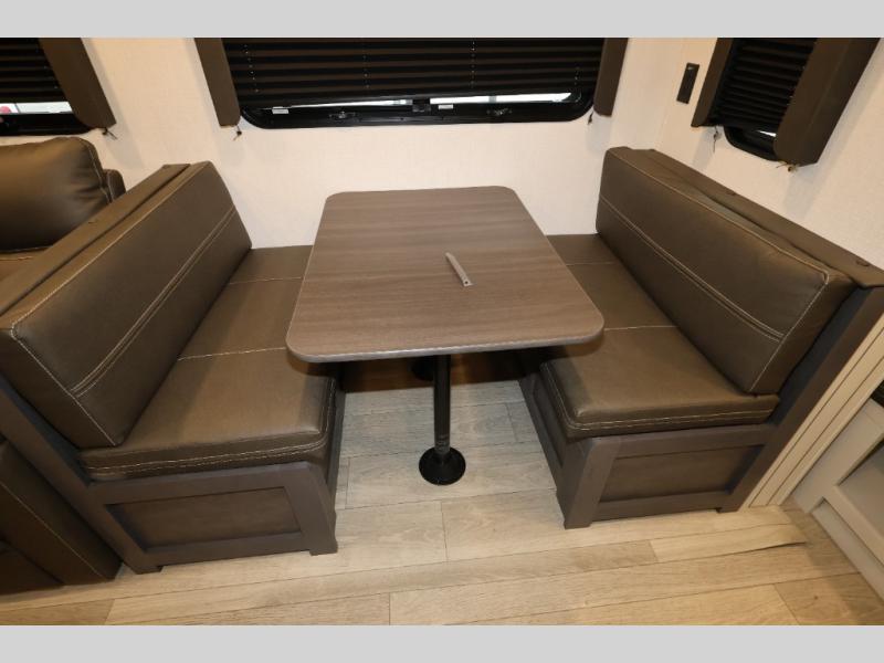 This lightweight fifth wheel is big enough for your small family to camp together! Enter to find a convenient combined kitchen and living space with large slide for added space. The slide features theater seating and a booth dinette which offers ample seating for meals and hanging out. There is a flip up table along the rear wall with a nearby 40" LED TV which features a butler pantry behind. Head up the steps to the right of the entry door to a complete bath and private front bedroom featuring a queen size bed with dual shirt wardrobes and nightstands on both sides of the bed. The bathroom offers a shower with a skylight for added headroom and natural lighting. Outside, a 16' awning provides added living space protected from the elements!