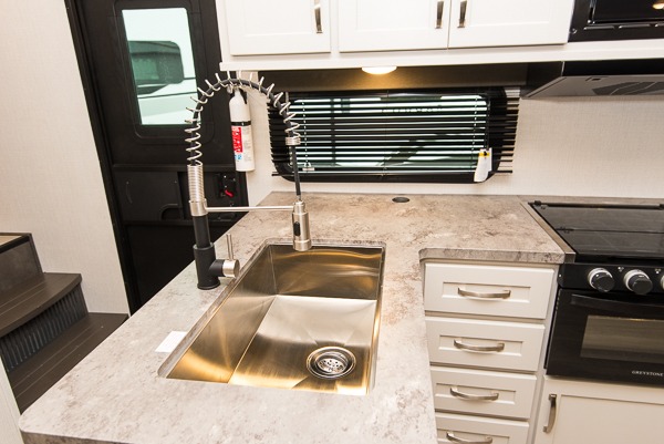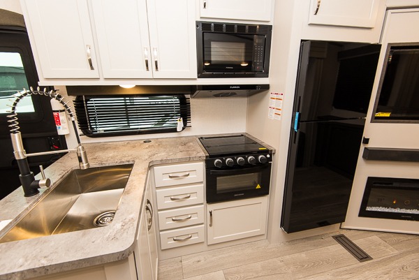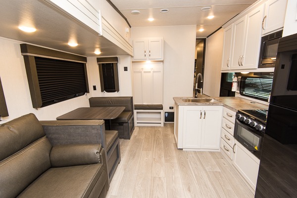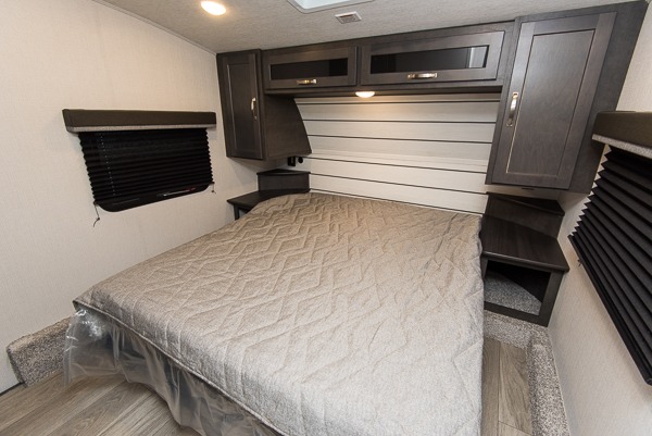 The Cougar Sport structural I-beam frame with stamped steel cross-members and outriggers, plus its laminated sidewalls with five-sided aluminum superstructure and Alpha Super Flex roof membrane are what active RVers love about the construction of the Cougar line. The Cougar Sport models are no exception when it comes to a great package, as well as being smaller and lighter weight than their big brother Cougar models. A one-piece, heated and enclosed polypropylene underbelly means a longer camping season. On the inside, residential shaker style hardwood cabinet doors and decorative crown molding, plus seamless pressed countertops and an on-demand water heater will make your unit feel even more like home. You are also sure to appreciate the shiplap style decorative accent wall behind the bed, a porcelain foot flush toilet in the bathroom, plus residential kitchen hardware, and so much more.