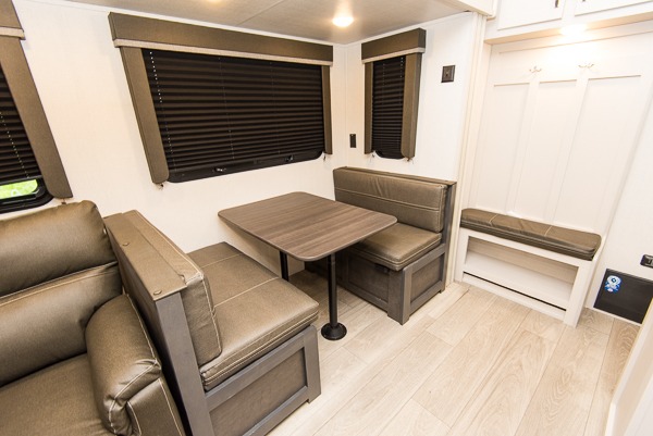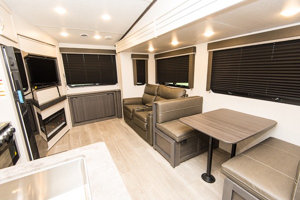 This lightweight fifth wheel is big enough for your small family to camp together! Enter to find a convenient combined kitchen and living space with large slide for added space. The slide features theater seating and a booth dinette which offers ample seating for meals and hanging out. There is a flip up table along the rear wall with a nearby 40" LED TV which features a butler pantry behind. Head up the steps to the right of the entry door to a complete bath and private front bedroom featuring a queen size bed with dual shirt wardrobes and nightstands on both sides of the bed. The bathroom offers a shower with a skylight for added headroom and natural lighting. Outside, a 16' awning provides added living space protected from the elements!