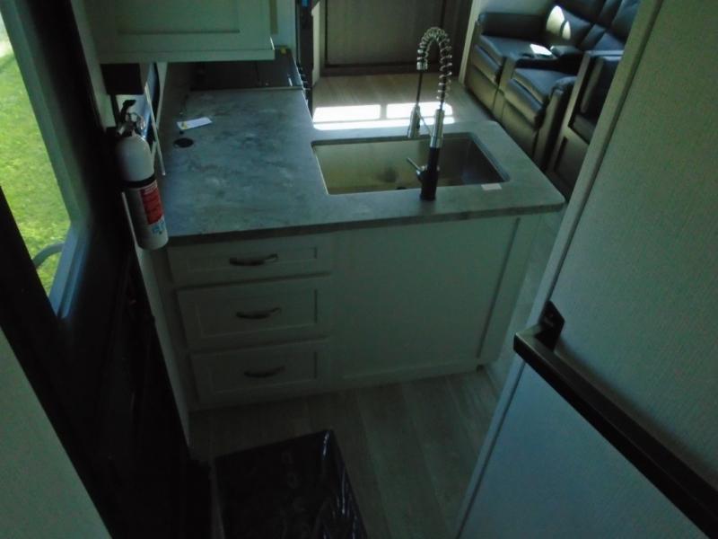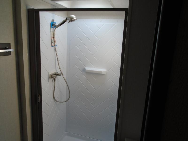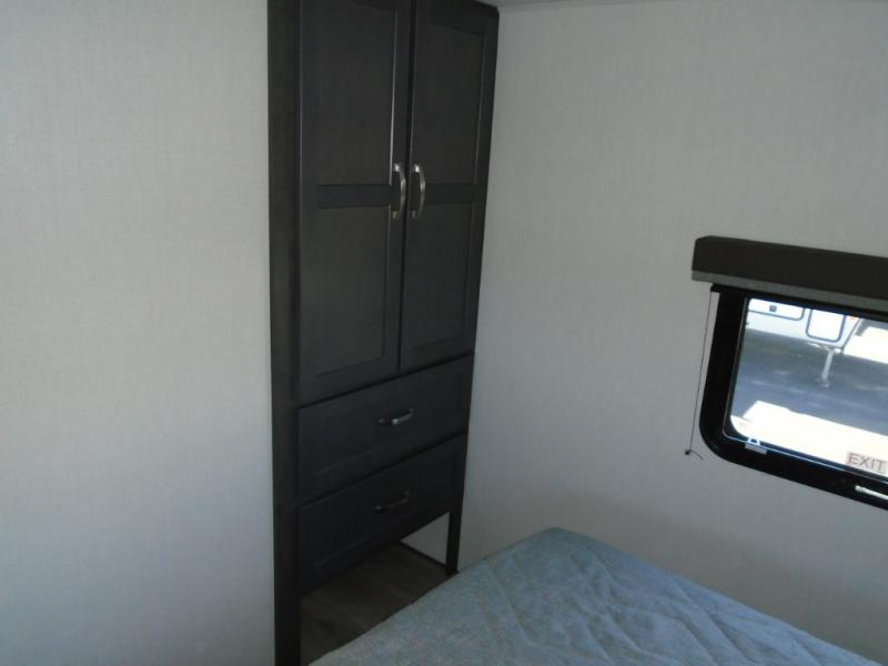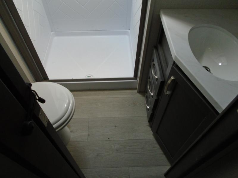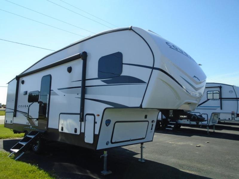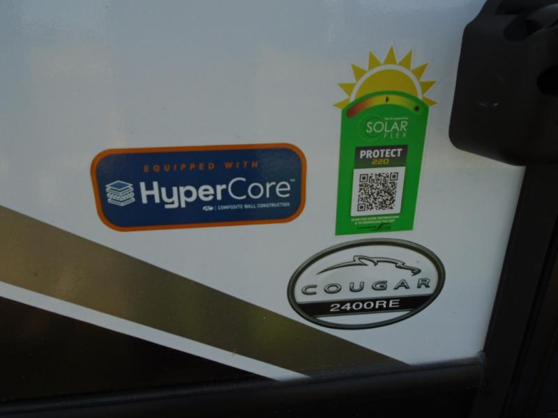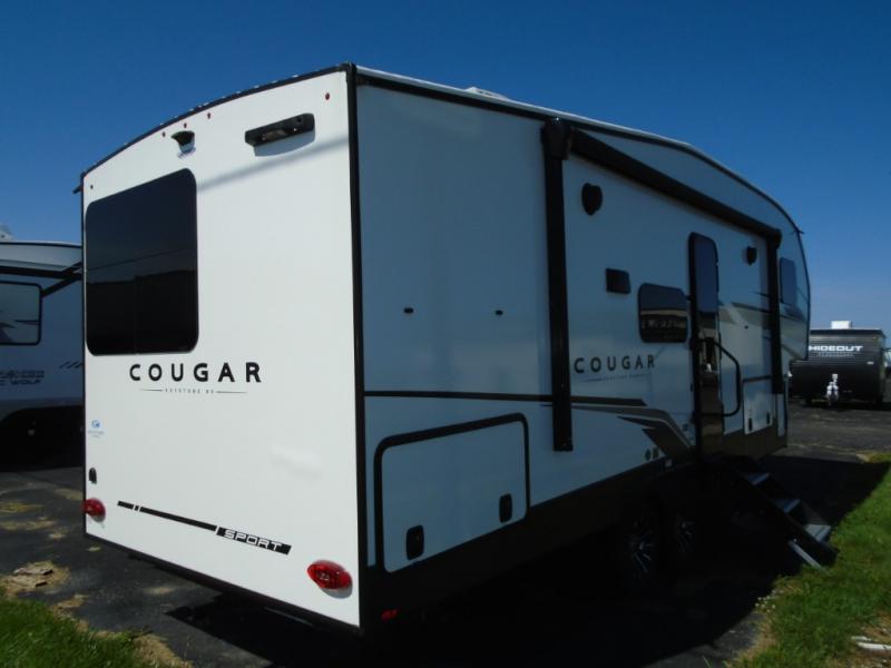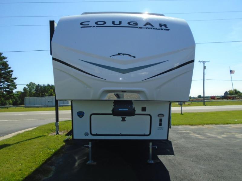 The Cougar Sport structural I-beam frame with stamped steel cross-members and outriggers, plus its laminated sidewalls with five-sided aluminum superstructure and Alpha Super Flex roof membrane are what active RVers love about the construction of the Cougar line. The Cougar Sport models are no exception when it comes to a great package, as well as being smaller and lighter weight than their big brother Cougar models. A one-piece, heated and enclosed polypropylene underbelly means a longer camping season. On the inside, residential shaker style hardwood cabinet doors and decorative crown molding, plus seamless pressed countertops and an on-demand water heater will make your unit feel even more like home. You are also sure to appreciate the shiplap style decorative accent wall behind the bed, a porcelain foot flush toilet in the bathroom, plus residential kitchen hardware, and so much more.