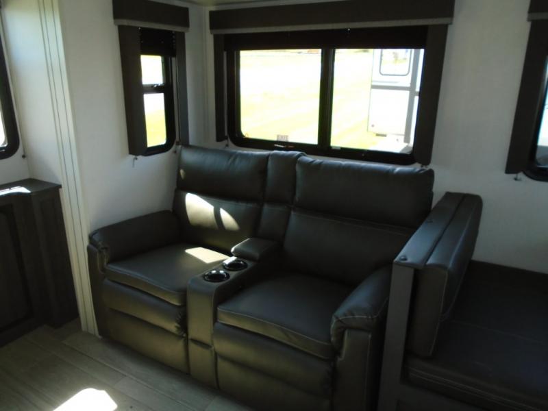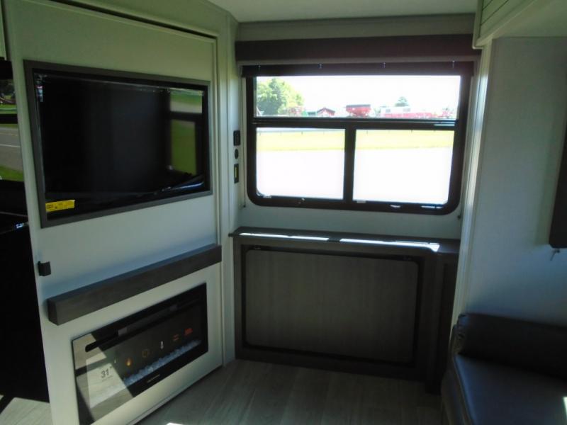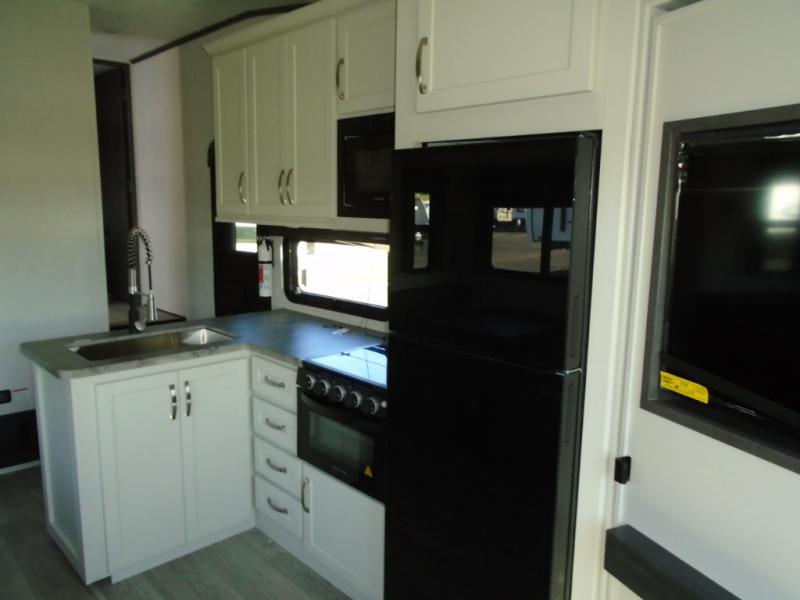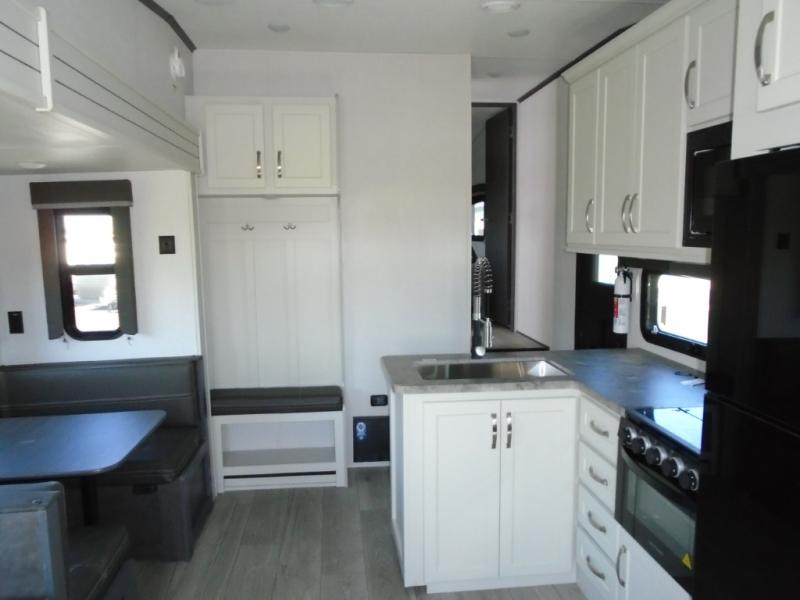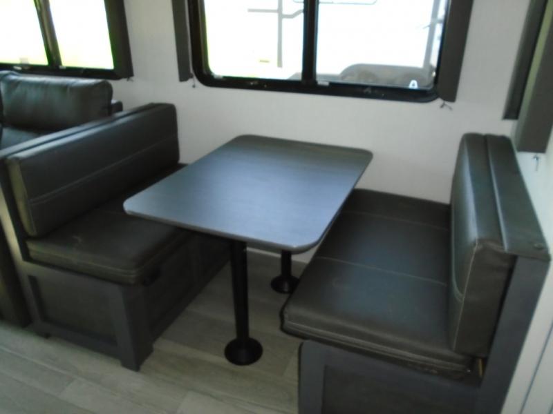 This lightweight fifth wheel is big enough for your small family to camp together! Enter to find a convenient combined kitchen and living space with large slide for added space. The slide features theater seating and a booth dinette which offers ample seating for meals and hanging out. There is a flip up table along the rear wall with a nearby 40" LED TV which features a butler pantry behind. Head up the steps to the right of the entry door to a complete bath and private front bedroom featuring a queen size bed with dual shirt wardrobes and nightstands on both sides of the bed. The bathroom offers a shower with a skylight for added headroom and natural lighting. Outside, a 16' awning provides added living space protected from the elements!