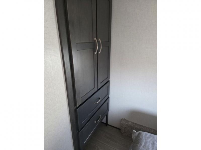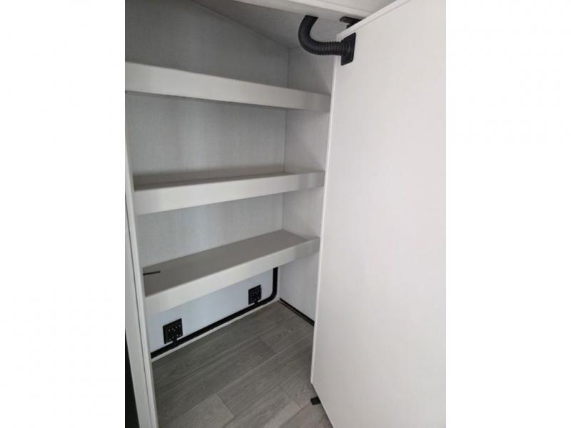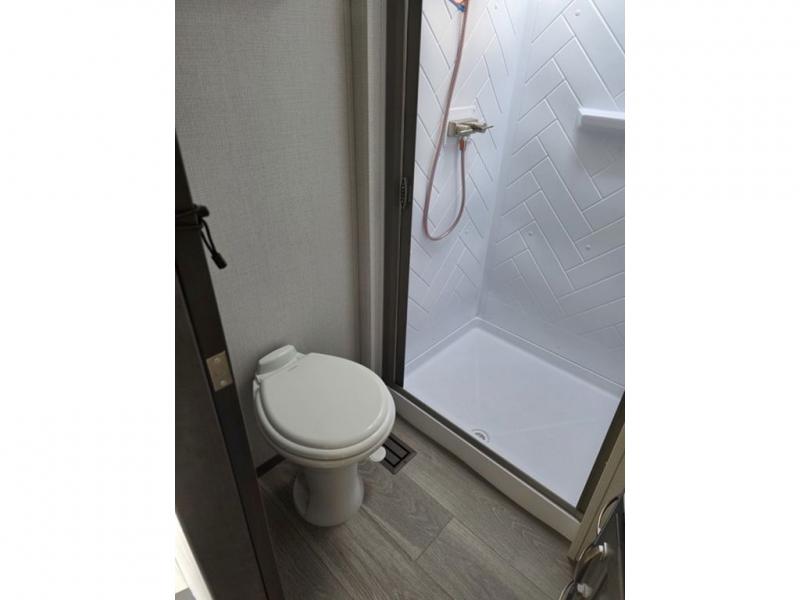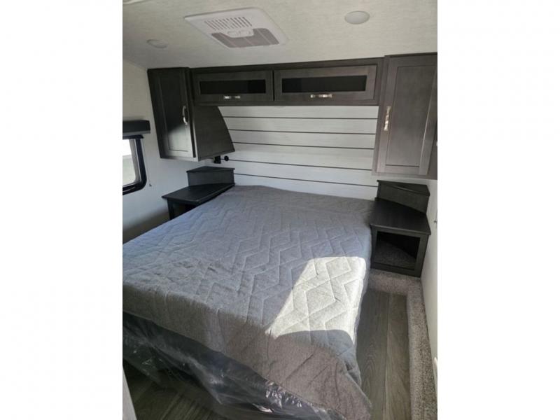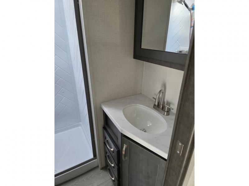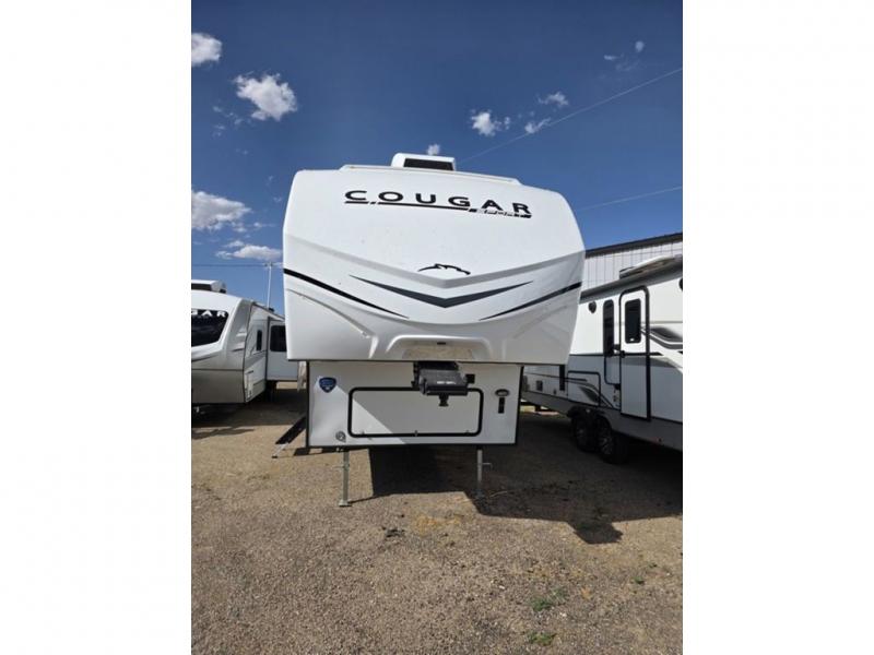 The Cougar Sport structural I-beam frame with stamped steel cross-members and outriggers, plus its laminated sidewalls with five-sided aluminum superstructure and Alpha Super Flex roof membrane are what active RVers love about the construction of the Cougar line. The Cougar Sport models are no exception when it comes to a great package, as well as being smaller and lighter weight than their big brother Cougar models. A one-piece, heated and enclosed polypropylene underbelly means a longer camping season. On the inside, residential shaker style hardwood cabinet doors and decorative crown molding, plus seamless pressed countertops and an on-demand water heater will make your unit feel even more like home. You are also sure to appreciate the shiplap style decorative accent wall behind the bed, a porcelain foot flush toilet in the bathroom, plus residential kitchen hardware, and so much more.