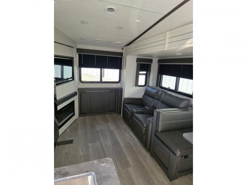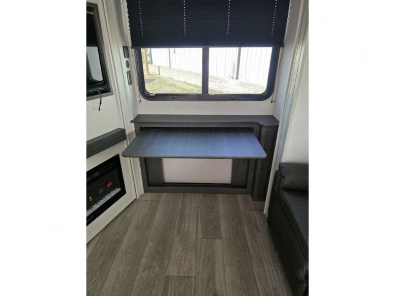 This lightweight fifth wheel is big enough for your small family to camp together! Enter to find a convenient combined kitchen and living space with large slide for added space. The slide features theater seating and a booth dinette which offers ample seating for meals and hanging out. There is a flip up table along the rear wall with a nearby 40" LED TV which features a butler pantry behind. Head up the steps to the right of the entry door to a complete bath and private front bedroom featuring a queen size bed with dual shirt wardrobes and nightstands on both sides of the bed. The bathroom offers a shower with a skylight for added headroom and natural lighting. Outside, a 16' awning provides added living space protected from the elements!