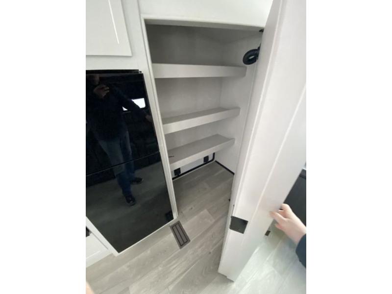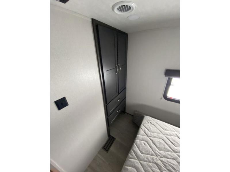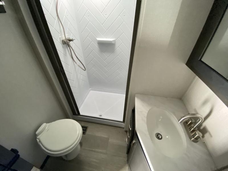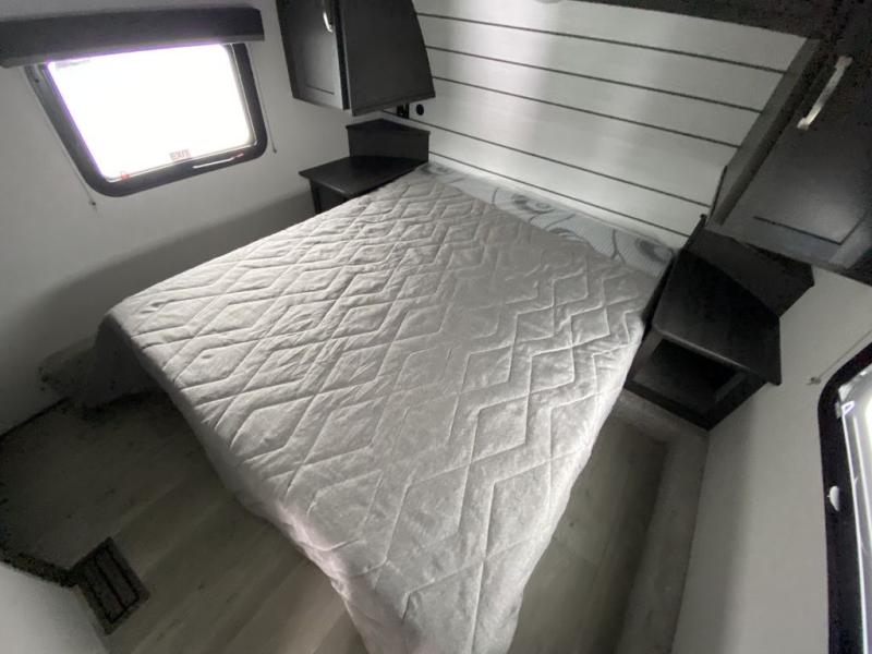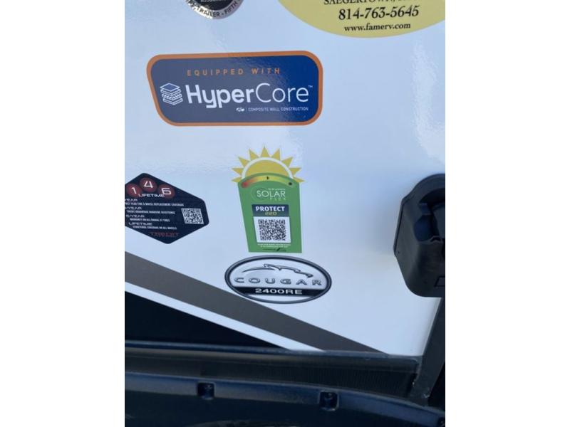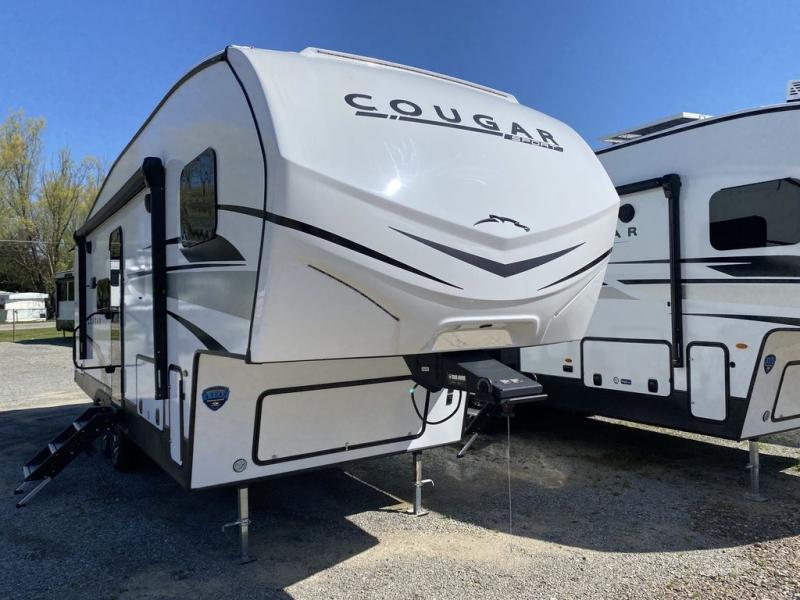 The Cougar Sport structural I-beam frame with stamped steel cross-members and outriggers, plus its laminated sidewalls with five-sided aluminum superstructure and Alpha Super Flex roof membrane are what active RVers love about the construction of the Cougar line. The Cougar Sport models are no exception when it comes to a great package, as well as being smaller and lighter weight than their big brother Cougar models. A one-piece, heated and enclosed polypropylene underbelly means a longer camping season. On the inside, residential shaker style hardwood cabinet doors and decorative crown molding, plus seamless pressed countertops and an on-demand water heater will make your unit feel even more like home. You are also sure to appreciate the shiplap style decorative accent wall behind the bed, a porcelain foot flush toilet in the bathroom, plus residential kitchen hardware, and so much more.