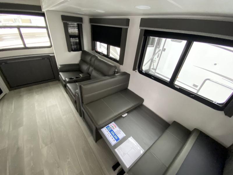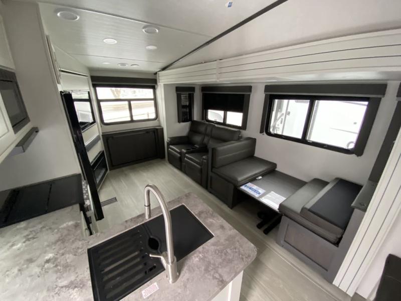 This lightweight fifth wheel is big enough for your small family to camp together! Enter to find a convenient combined kitchen and living space with large slide for added space. The slide features theater seating and a booth dinette which offers ample seating for meals and hanging out. There is a flip up table along the rear wall with a nearby 40" LED TV which features a butler pantry behind. Head up the steps to the right of the entry door to a complete bath and private front bedroom featuring a queen size bed with dual shirt wardrobes and nightstands on both sides of the bed. The bathroom offers a shower with a skylight for added headroom and natural lighting. Outside, a 16' awning provides added living space protected from the elements!