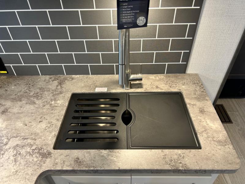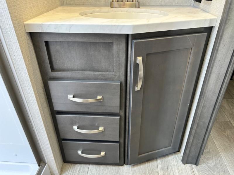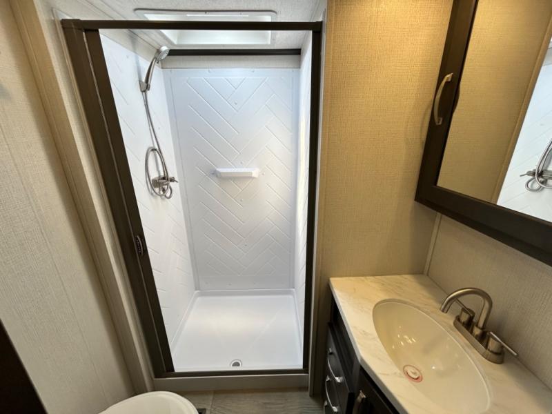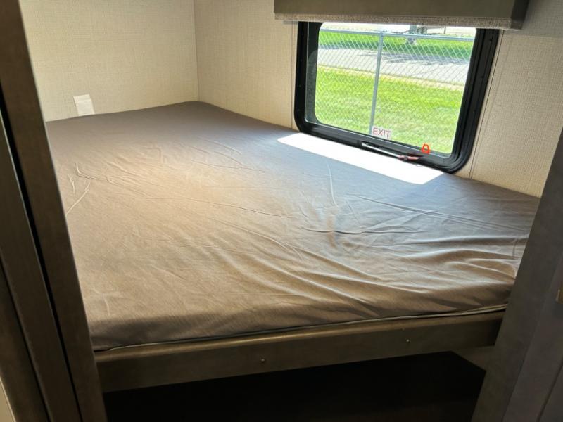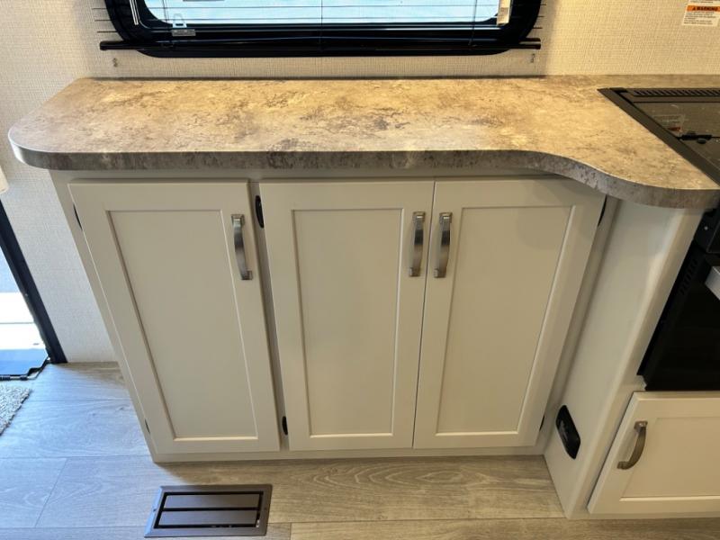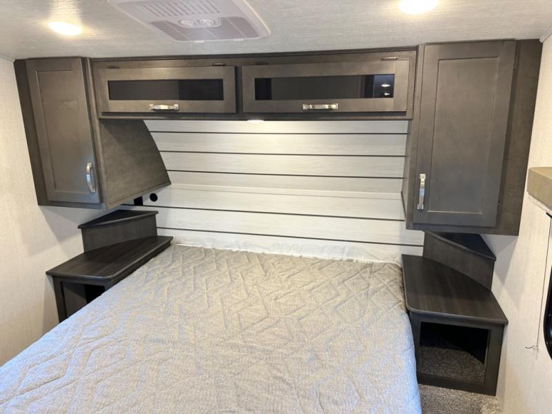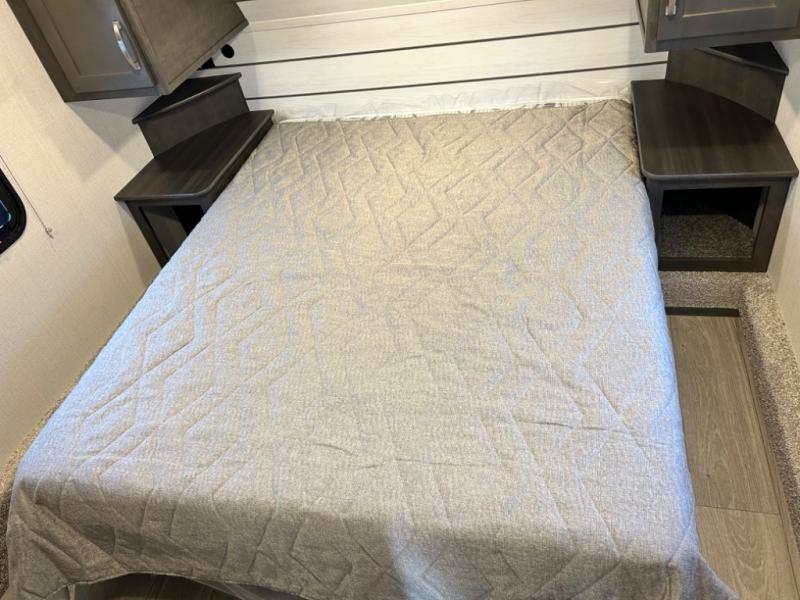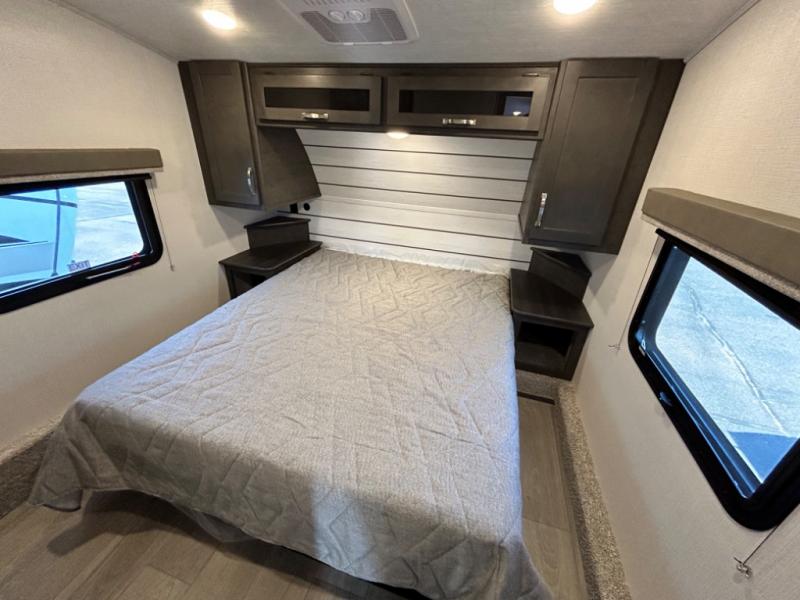 The Cougar Sport structural I-beam frame with stamped steel cross-members and outriggers, plus its laminated sidewalls with five-sided aluminum superstructure and Alpha Super Flex roof membrane are what active RVers love about the construction of the Cougar line. The Cougar Sport models are no exception when it comes to a great package, as well as being smaller and lighter weight than their big brother Cougar models. A one-piece, heated and enclosed polypropylene underbelly means a longer camping season. On the inside, residential shaker style hardwood cabinet doors and decorative crown molding, plus seamless pressed countertops and an on-demand water heater will make your unit feel even more like home. You are also sure to appreciate the shiplap style decorative accent wall behind the bed, a porcelain foot flush toilet in the bathroom, plus residential kitchen hardware, and so much more.