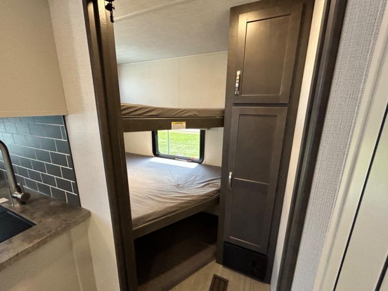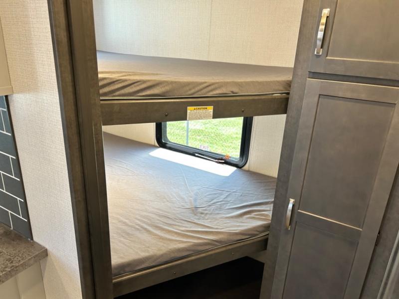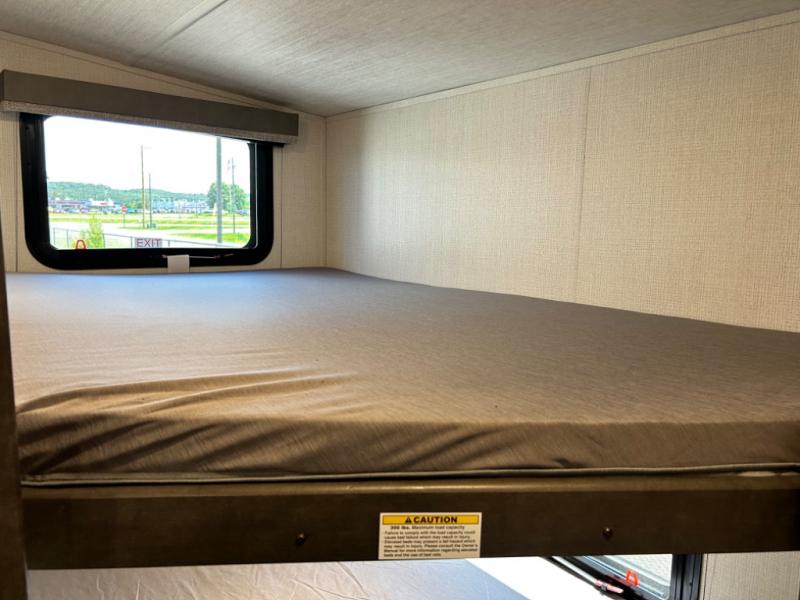 This lightweight Cougar Sport bunk model features sleeping for ten or more with triple stacked double bed bunks in the rear bunk room, a large U-shaped dinette that can be transformed into sleep space, as well as a tri-fold sofa sleeper and a queen bed in the private bedroom up front. The U-shaped dinette will seat quite a few of you for meals and even game time, plus the sofa is nearby for even more to kick back on. A fully equipped kitchen with overhead microwave, a three burner range, and large sink plus storage will make it easy to keep everyone fed and happy. A 10.4 Cu. Ft. 12 volt refrigerator will keep all of your perishable items fresh, and there are plenty of cabinets for storing snacks and dry goods as well. Head up the steps to the bathroom featuring a shower with a skylight, sink with overhead medicine cabinet, and toilet. The private front bedroom takes you away from the hustle and bustle of the main living area and bunkhouse to provide a relaxing retreat including a comfy queen bed, dual nightstands and shirt wardrobes as well as an additional wardrobe along the interior wall for even more storage.