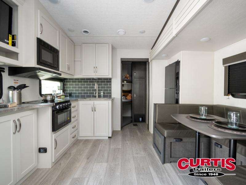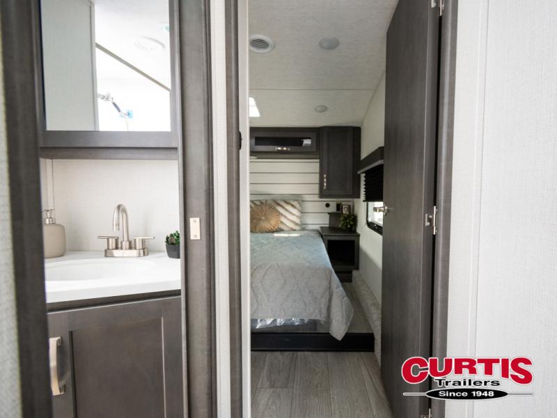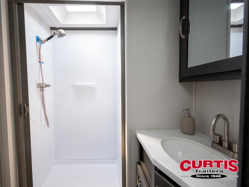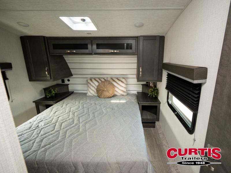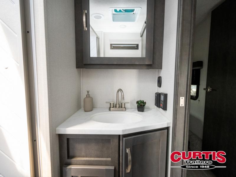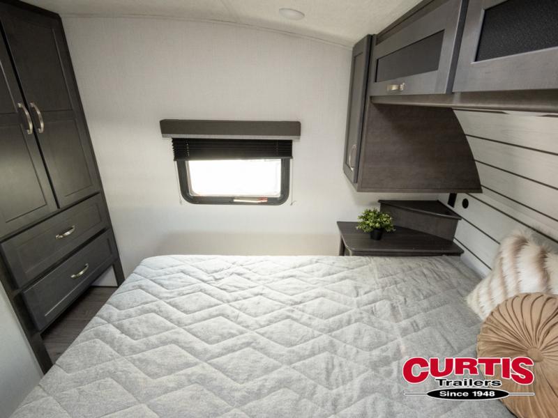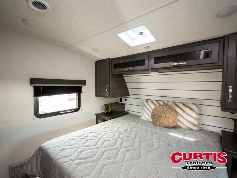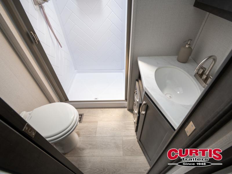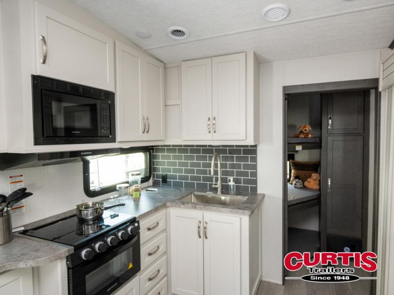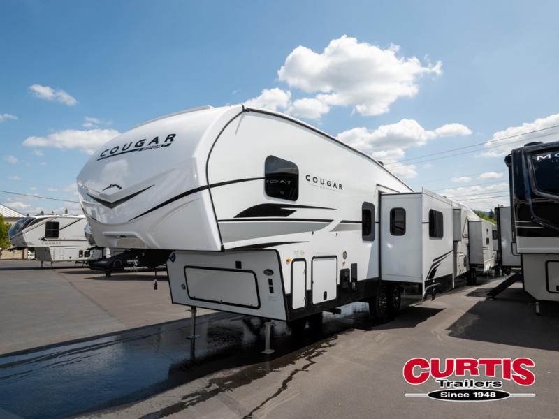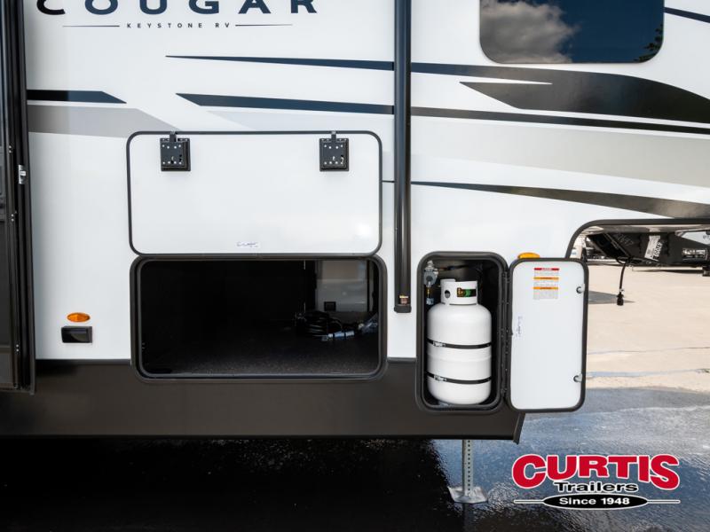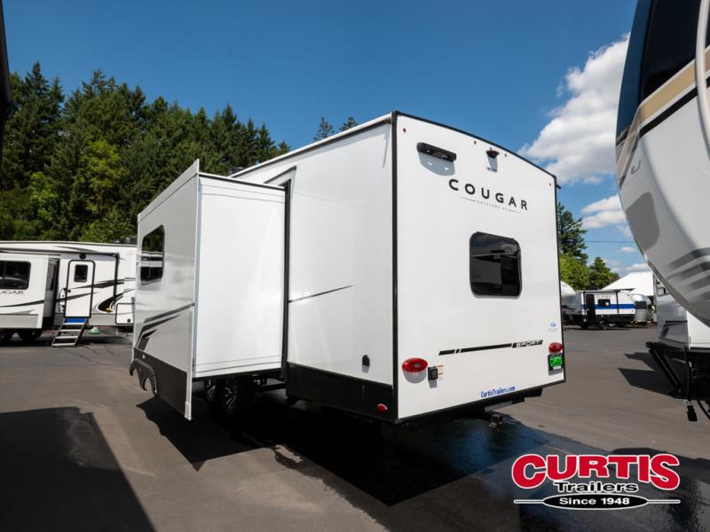 The Cougar Sport structural I-beam frame with stamped steel cross-members and outriggers, plus its laminated sidewalls with five-sided aluminum superstructure and Alpha Super Flex roof membrane are what active RVers love about the construction of the Cougar line. The Cougar Sport models are no exception when it comes to a great package, as well as being smaller and lighter weight than their big brother Cougar models. A one-piece, heated and enclosed polypropylene underbelly means a longer camping season. On the inside, residential shaker style hardwood cabinet doors and decorative crown molding, plus seamless pressed countertops and an on-demand water heater will make your unit feel even more like home. You are also sure to appreciate the shiplap style decorative accent wall behind the bed, a porcelain foot flush toilet in the bathroom, plus residential kitchen hardware, and so much more.