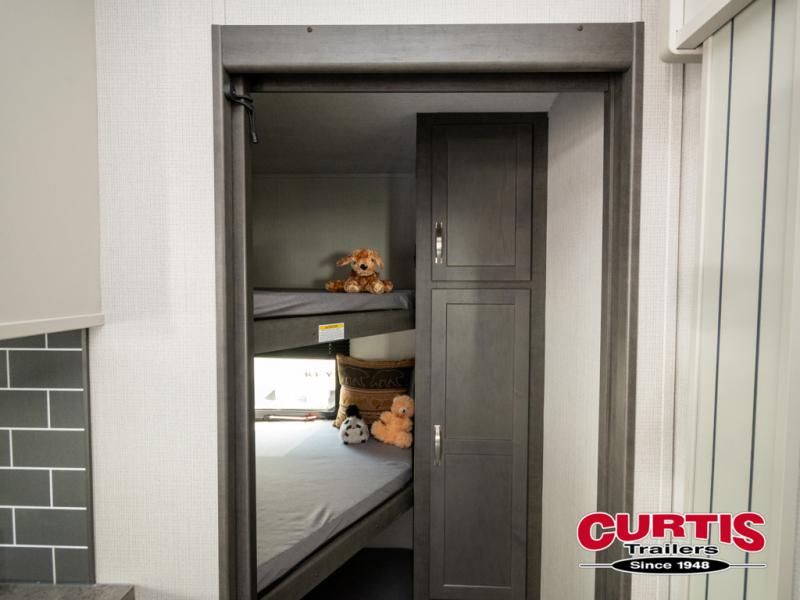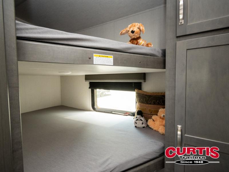 This lightweight Cougar Sport bunk model features sleeping for ten or more with triple stacked double bed bunks in the rear bunk room, a large U-shaped dinette that can be transformed into sleep space, as well as a tri-fold sofa sleeper and a queen bed in the private bedroom up front. The U-shaped dinette will seat quite a few of you for meals and even game time, plus the sofa is nearby for even more to kick back on. A fully equipped kitchen with overhead microwave, a three burner range, and large sink plus storage will make it easy to keep everyone fed and happy. A 10.4 Cu. Ft. 12 volt refrigerator will keep all of your perishable items fresh, and there are plenty of cabinets for storing snacks and dry goods as well. Head up the steps to the bathroom featuring a shower with a skylight, sink with overhead medicine cabinet, and toilet. The private front bedroom takes you away from the hustle and bustle of the main living area and bunkhouse to provide a relaxing retreat including a comfy queen bed, dual nightstands and shirt wardrobes as well as an additional wardrobe along the interior wall for even more storage.
