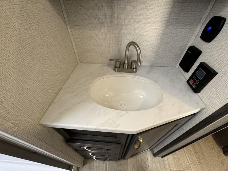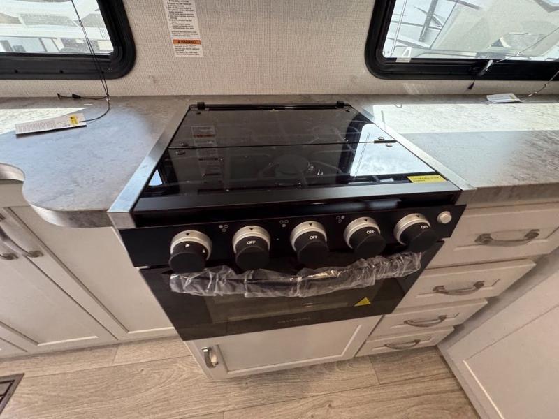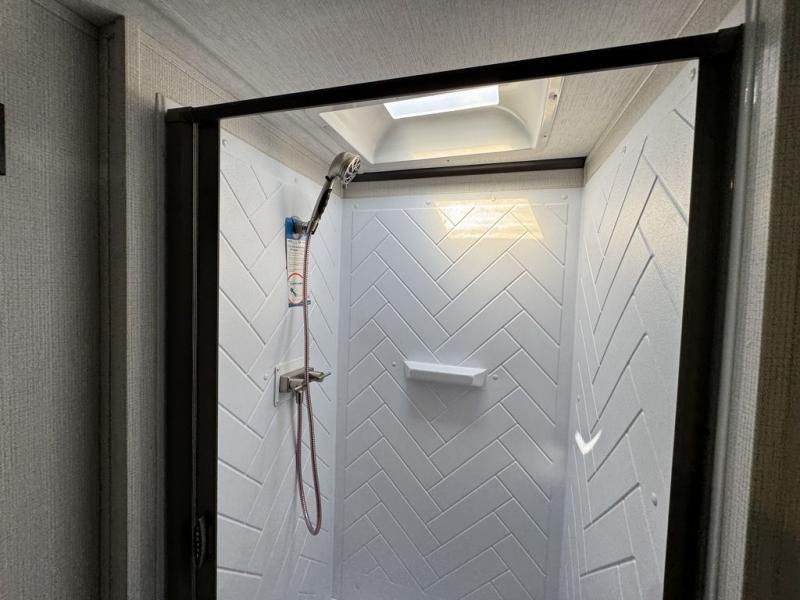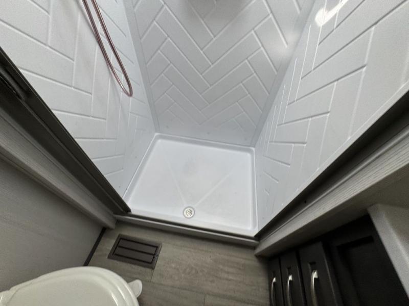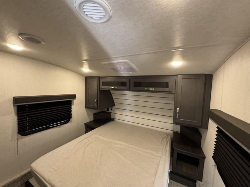 The Cougar Sport structural I-beam frame with stamped steel cross-members and outriggers, plus its laminated sidewalls with five-sided aluminum superstructure and Alpha Super Flex roof membrane are what active RVers love about the construction of the Cougar line. The Cougar Sport models are no exception when it comes to a great package, as well as being smaller and lighter weight than their big brother Cougar models. A one-piece, heated and enclosed polypropylene underbelly means a longer camping season. On the inside, residential shaker style hardwood cabinet doors and decorative crown molding, plus seamless pressed countertops and an on-demand water heater will make your unit feel even more like home. You are also sure to appreciate the shiplap style decorative accent wall behind the bed, a porcelain foot flush toilet in the bathroom, plus residential kitchen hardware, and so much more.