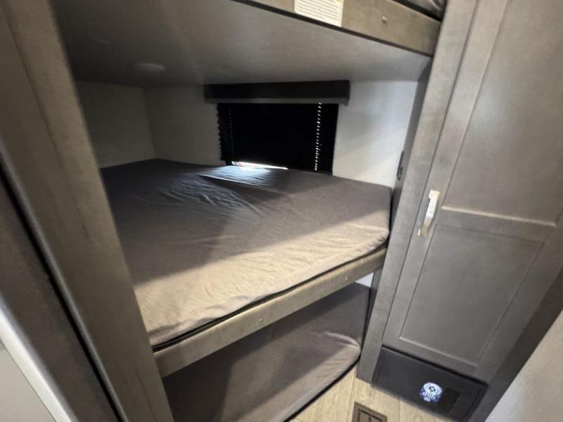 This lightweight Cougar Sport bunk model features sleeping for ten or more with triple stacked double bed bunks in the rear bunk room, a large U-shaped dinette that can be transformed into sleep space, as well as a tri-fold sofa sleeper and a queen bed in the private bedroom up front. The U-shaped dinette will seat quite a few of you for meals and even game time, plus the sofa is nearby for even more to kick back on. A fully equipped kitchen with overhead microwave, a three burner range, and large sink plus storage will make it easy to keep everyone fed and happy. A 10.4 Cu. Ft. 12 volt refrigerator will keep all of your perishable items fresh, and there are plenty of cabinets for storing snacks and dry goods as well. Head up the steps to the bathroom featuring a shower with a skylight, sink with overhead medicine cabinet, and toilet. The private front bedroom takes you away from the hustle and bustle of the main living area and bunkhouse to provide a relaxing retreat including a comfy queen bed, dual nightstands and shirt wardrobes as well as an additional wardrobe along the interior wall for even more storage.