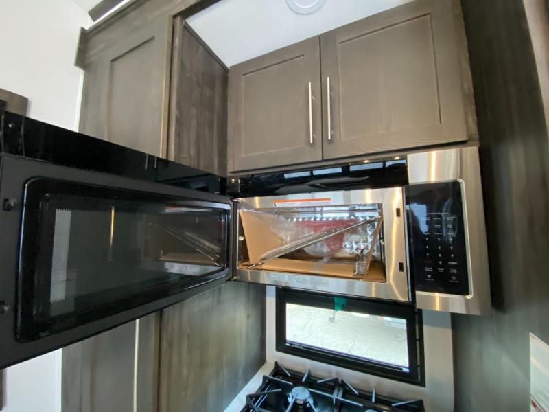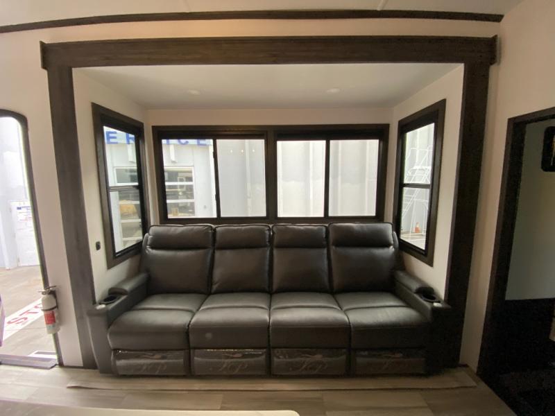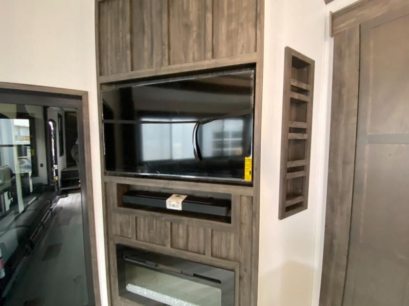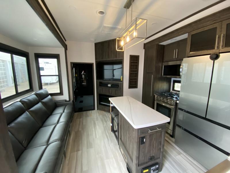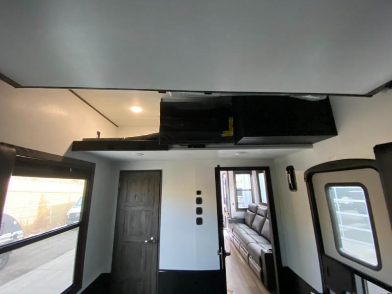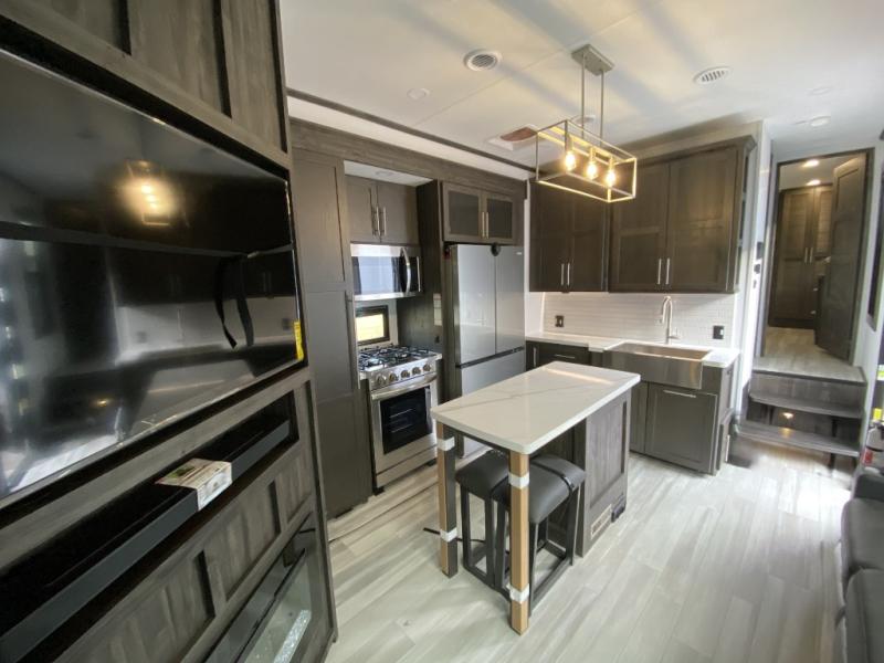 Don't leave your favorite off-road toys behind, simply load them up with the 8' MORryde powered ramp door into the 11' garage area of this toy hauler! The garage area isn't just for your toys, it's for eating, sleeping, and entertaining too with dual opposing sofas with a queen bed above them, a loft with a bunk mat, an LED TV, and even a half bathroom for your convenience. The residential four person sofa slide comes with heat, massage, and 110V/USB ports for an ultimate relaxing evening across from the entertainment center with pantries on either side to store your snacks. The kitchen island table has swing-out stools for you to enjoy a cup of coffee at in the mornings and the dual entry bathroom has a residential shower with a seat to freshen up. It even leads directly into the front private bedroom which has a Fuzion king bed slide across from a dresser with an LED TV and a front master closet with washer and dryer prep!